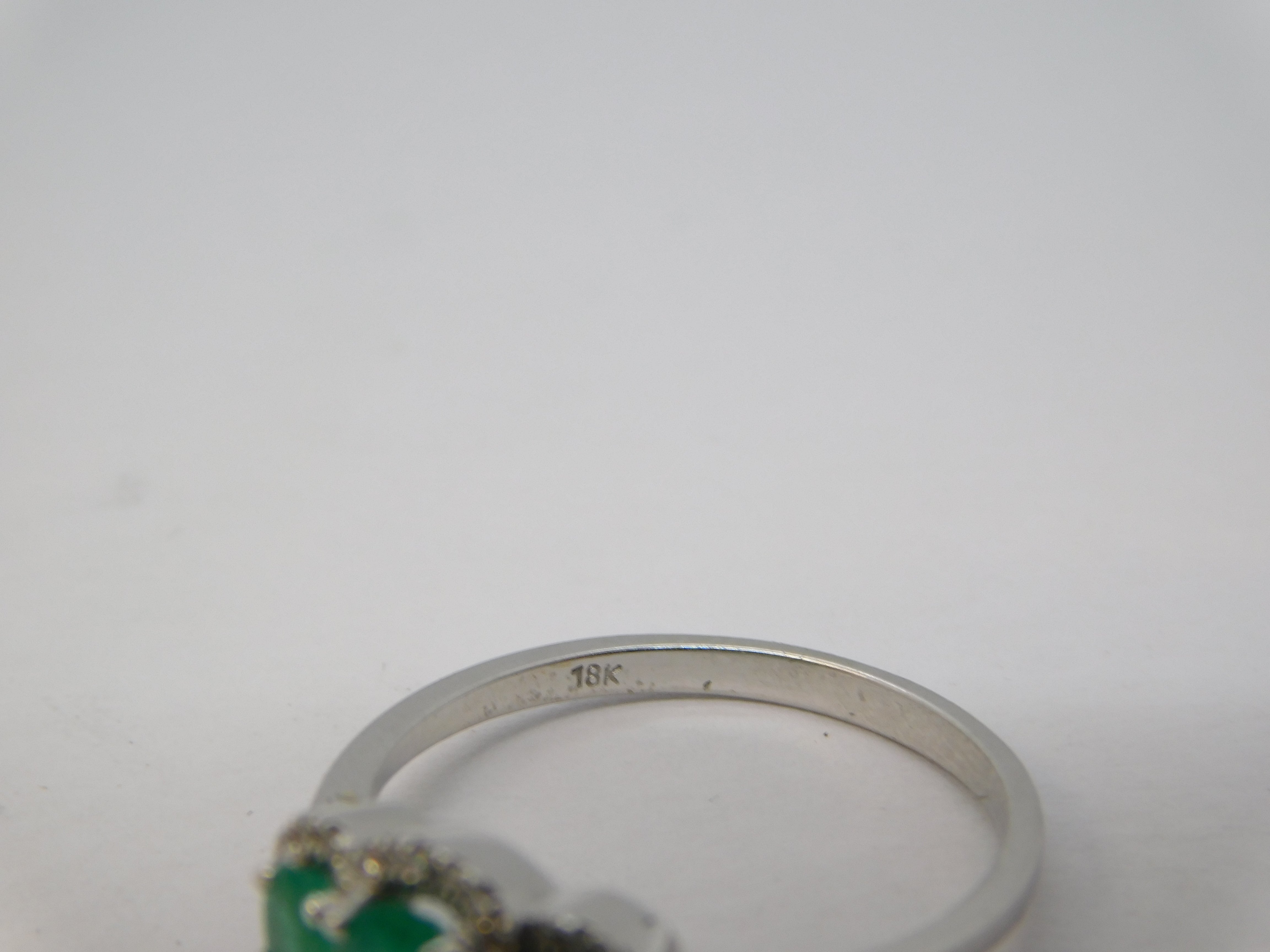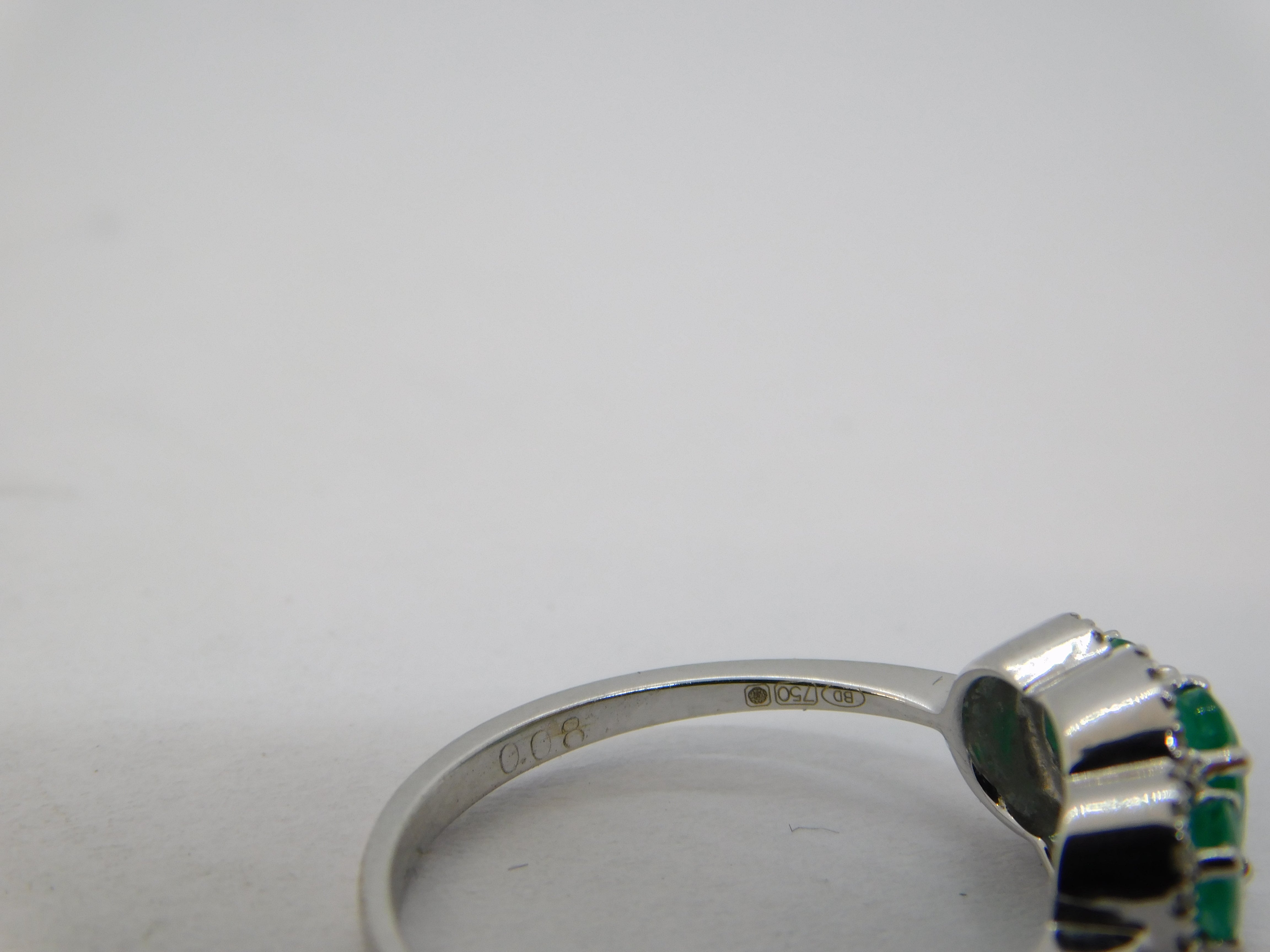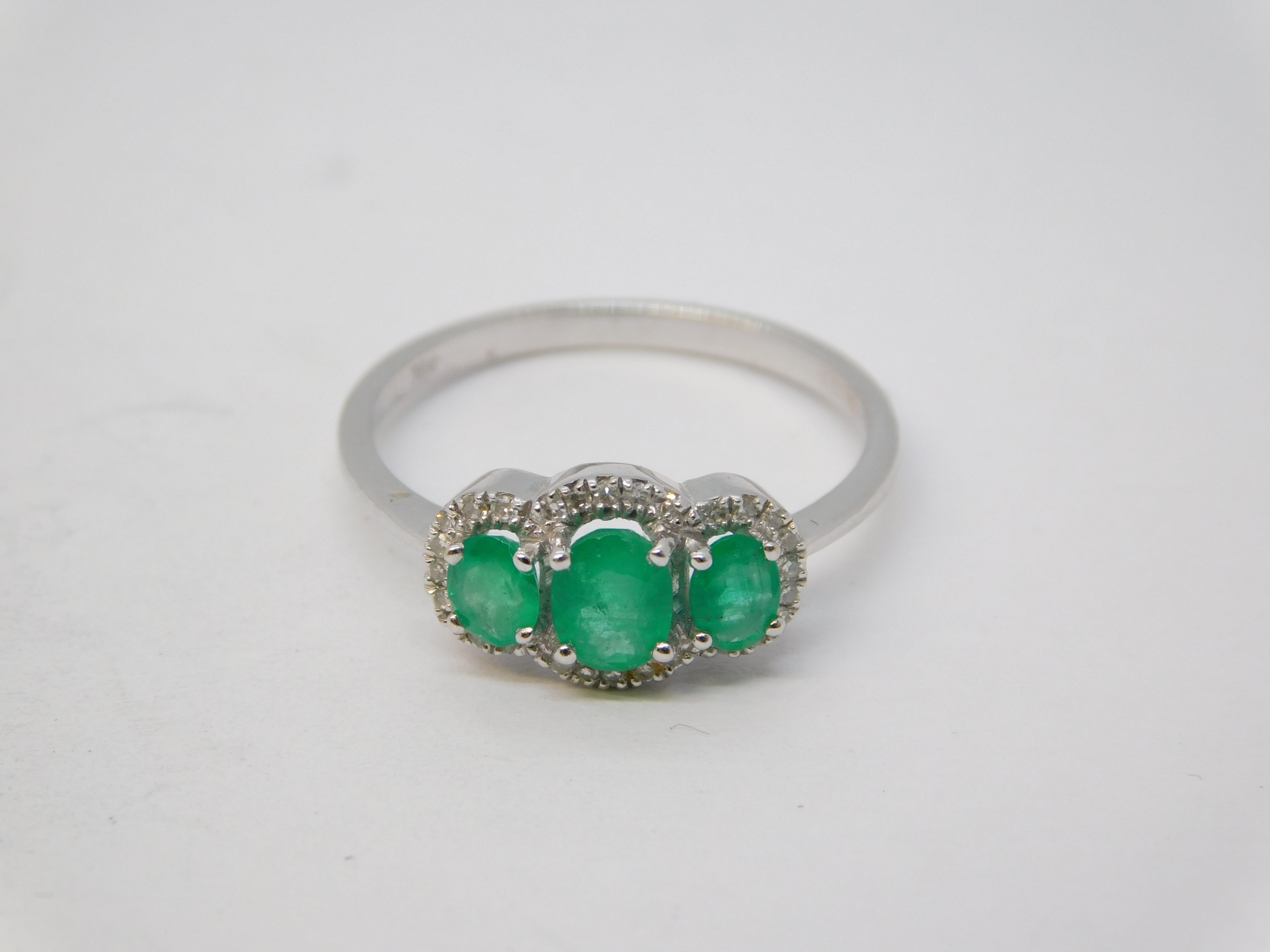 Details: A fantastic and wonderfully designed vintage 18ct white gold dress ring or engagement ring set with three central emeralds flanked with small diamonds hallmarked to the interior c1990, the stones have been tested. This is a wonderful item that would make a perfect gift or addition to any collection.