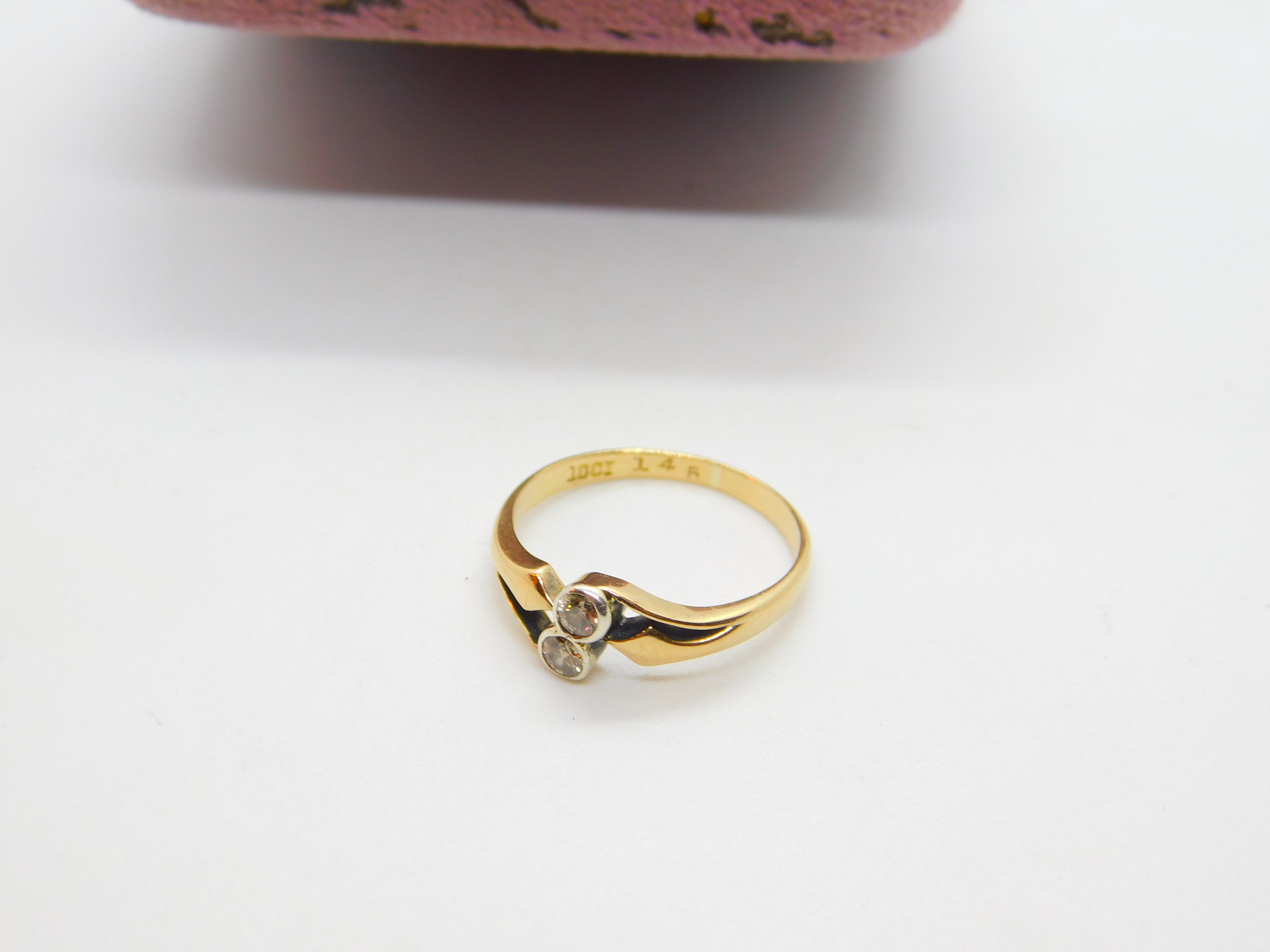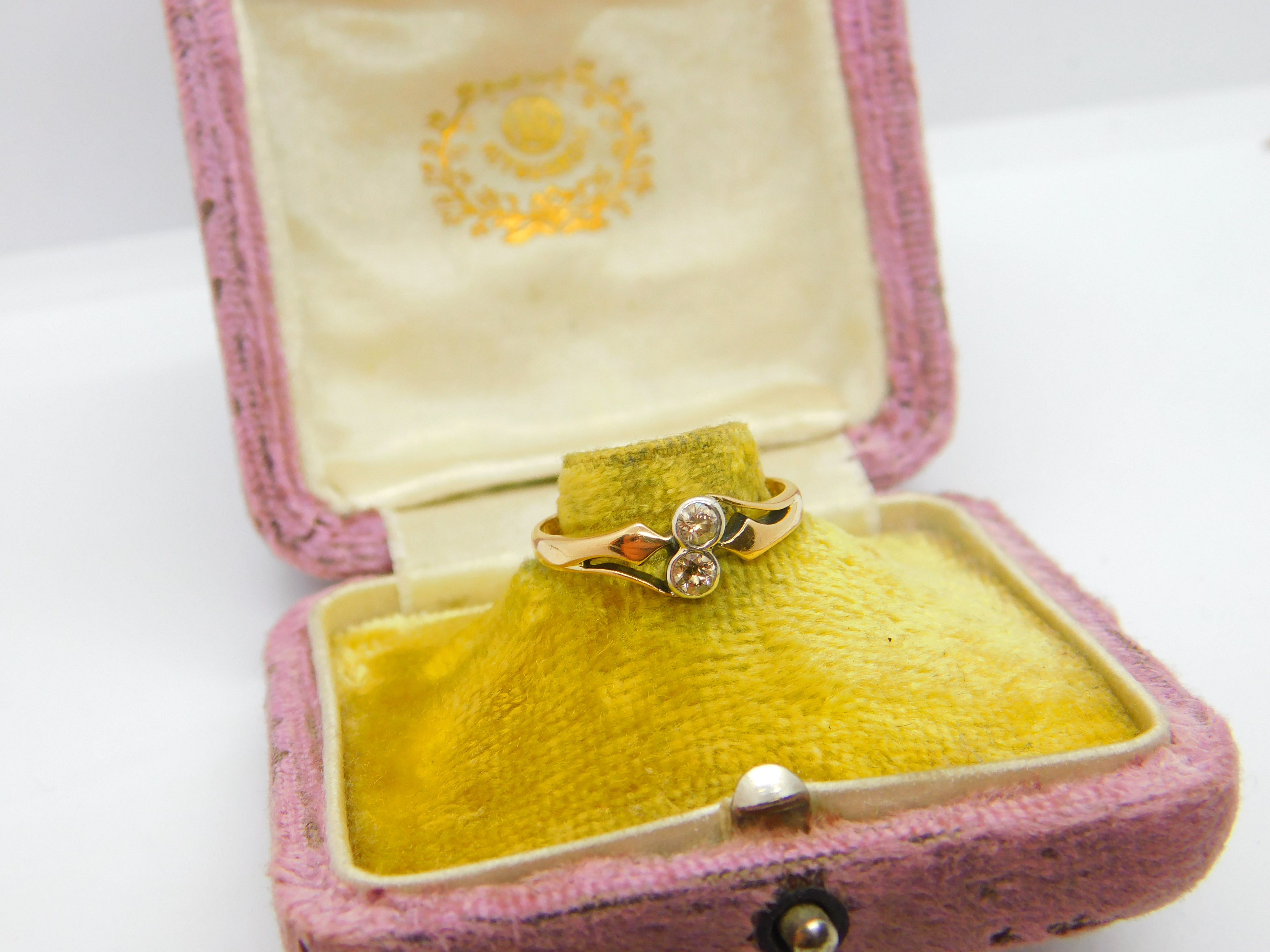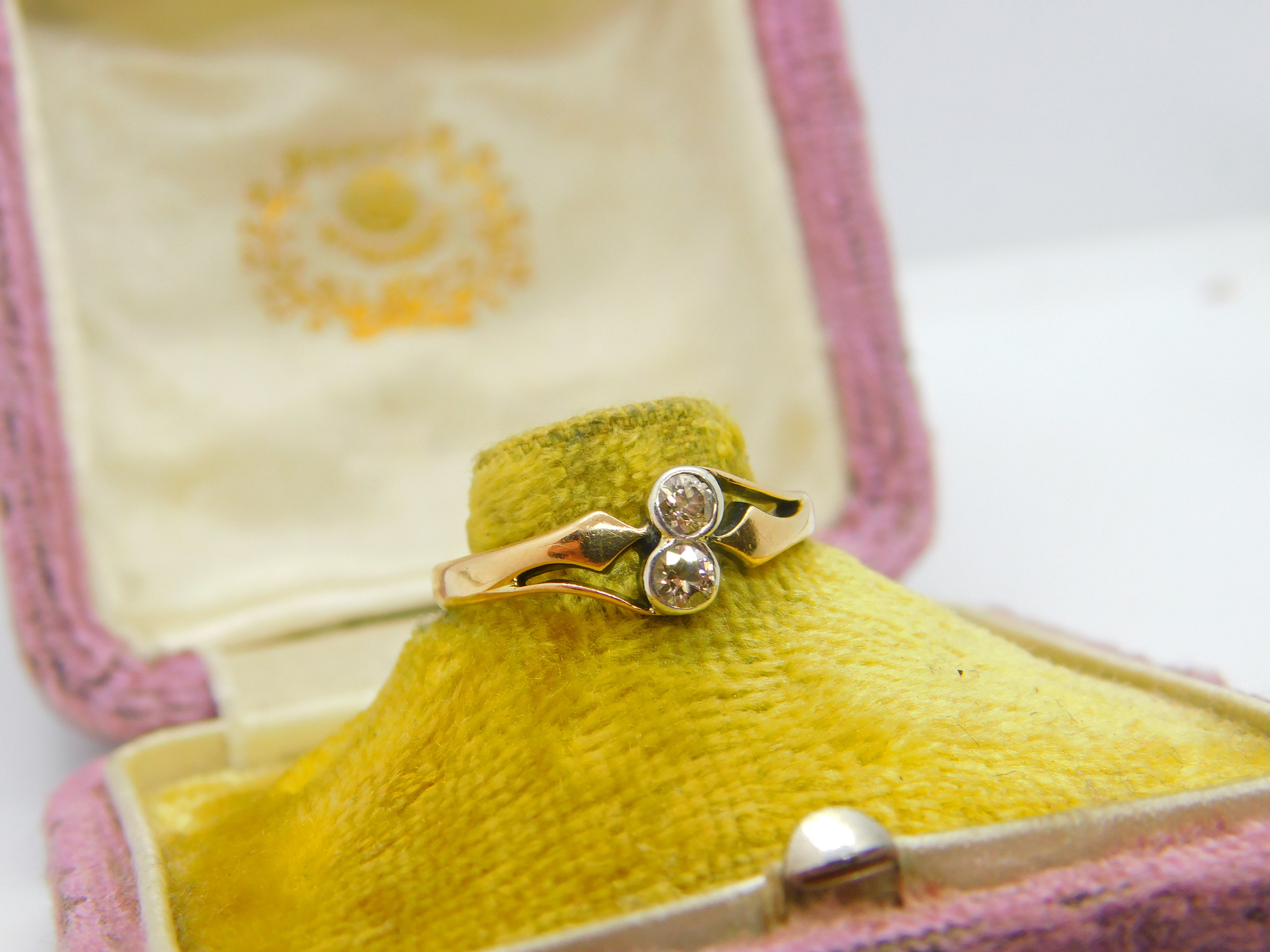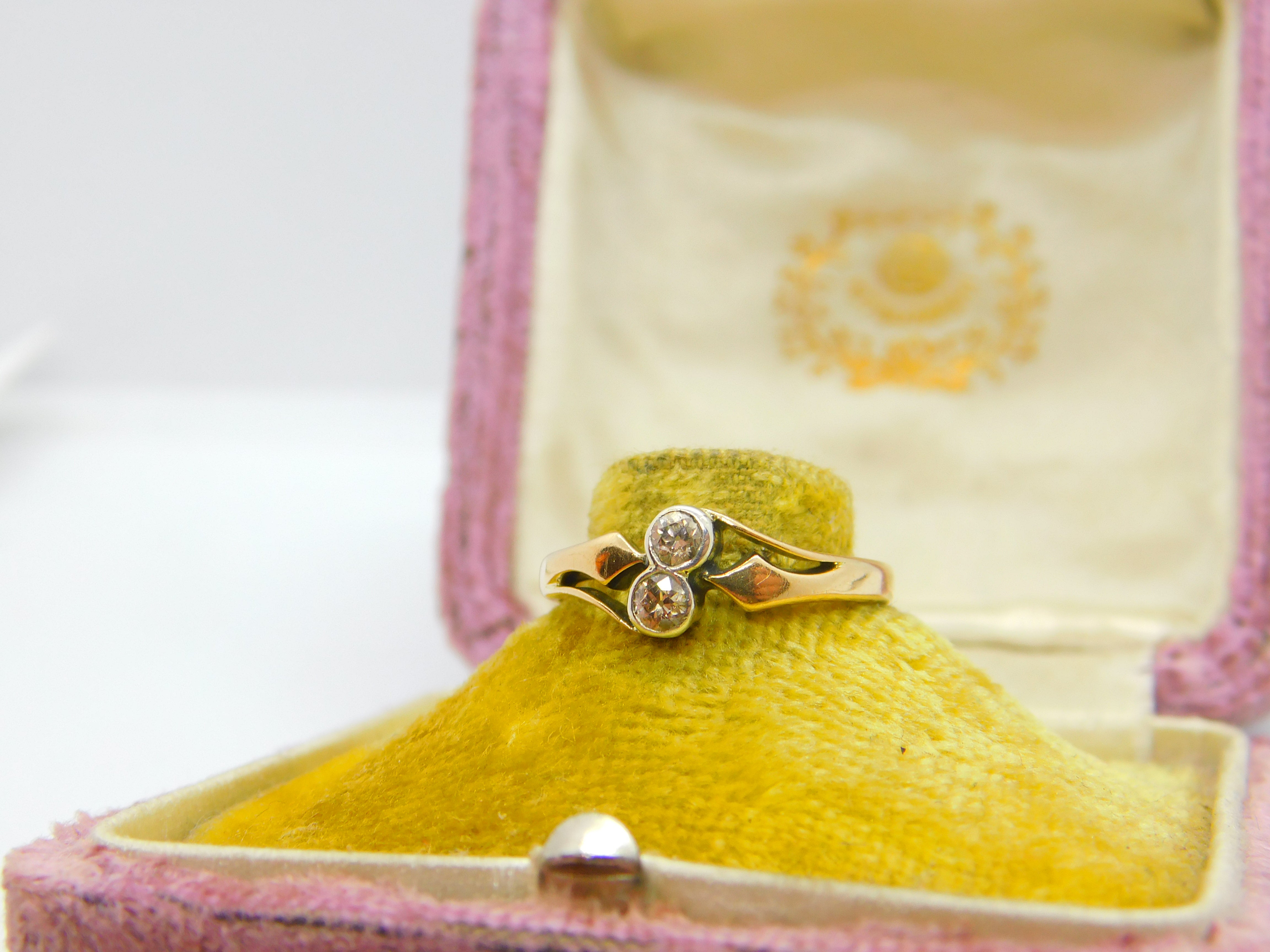 Details: A fantastic and wonderfully designed antique art deco 18ct yellow gold crossover ring set with two diamonds approx 0.2ct total hallmarked to the inner band c1920. This is a wonderful item that would make a perfect gift or addition to any collection. The BOX pictured is for PRESENTATION ONLY and is NOT included in the listings but used to frame the pictures unless specifically stated otherwise.
