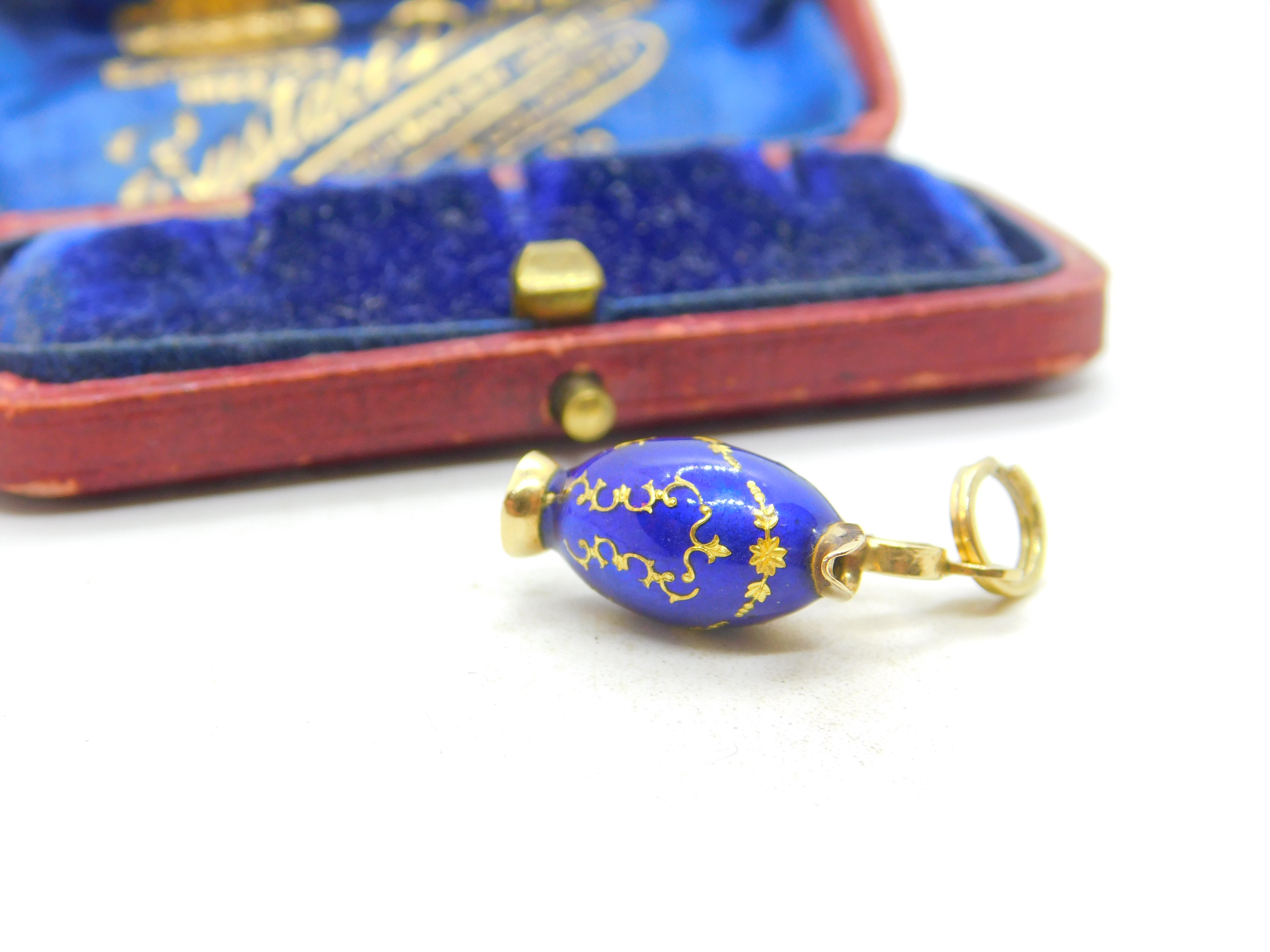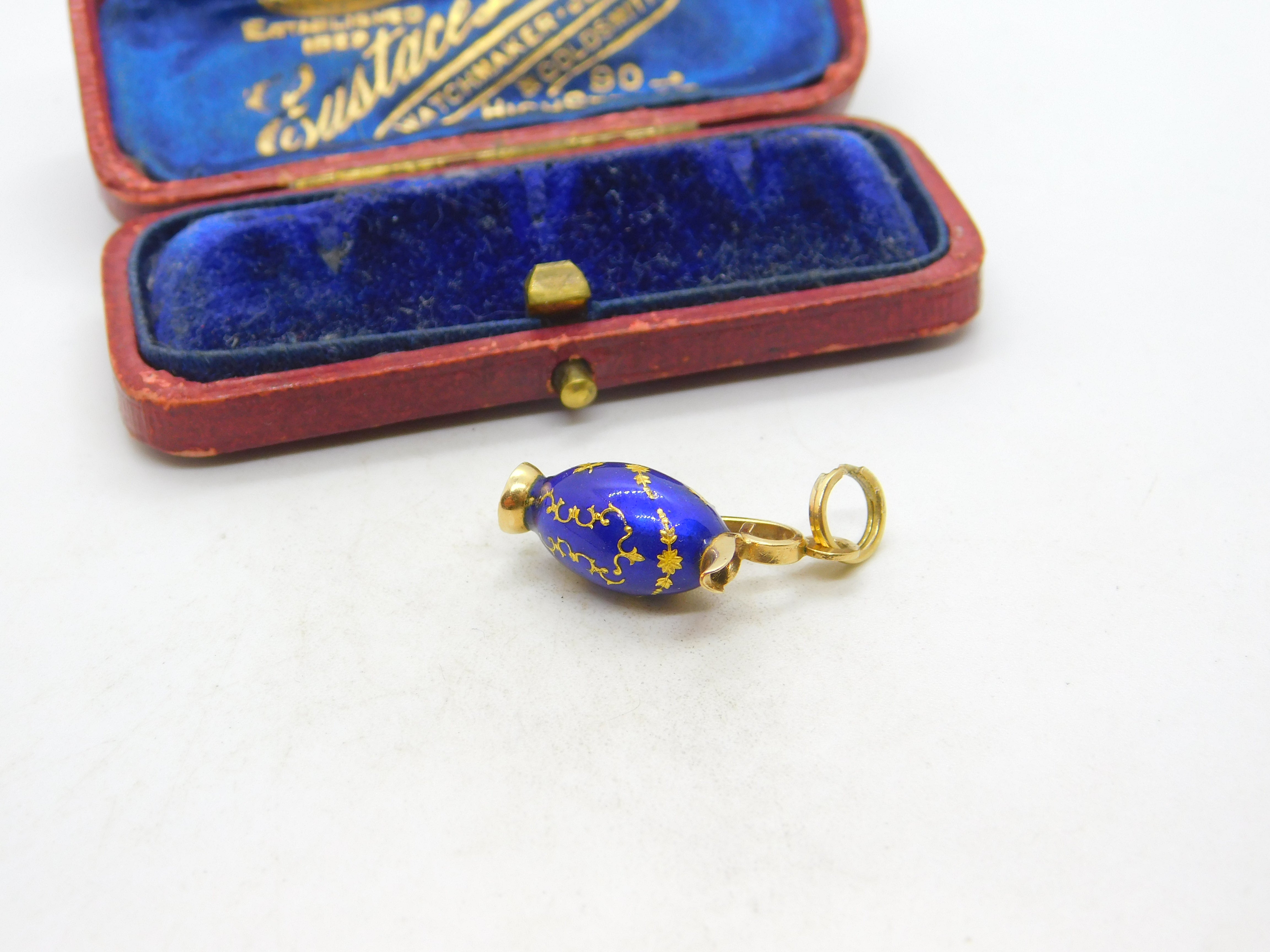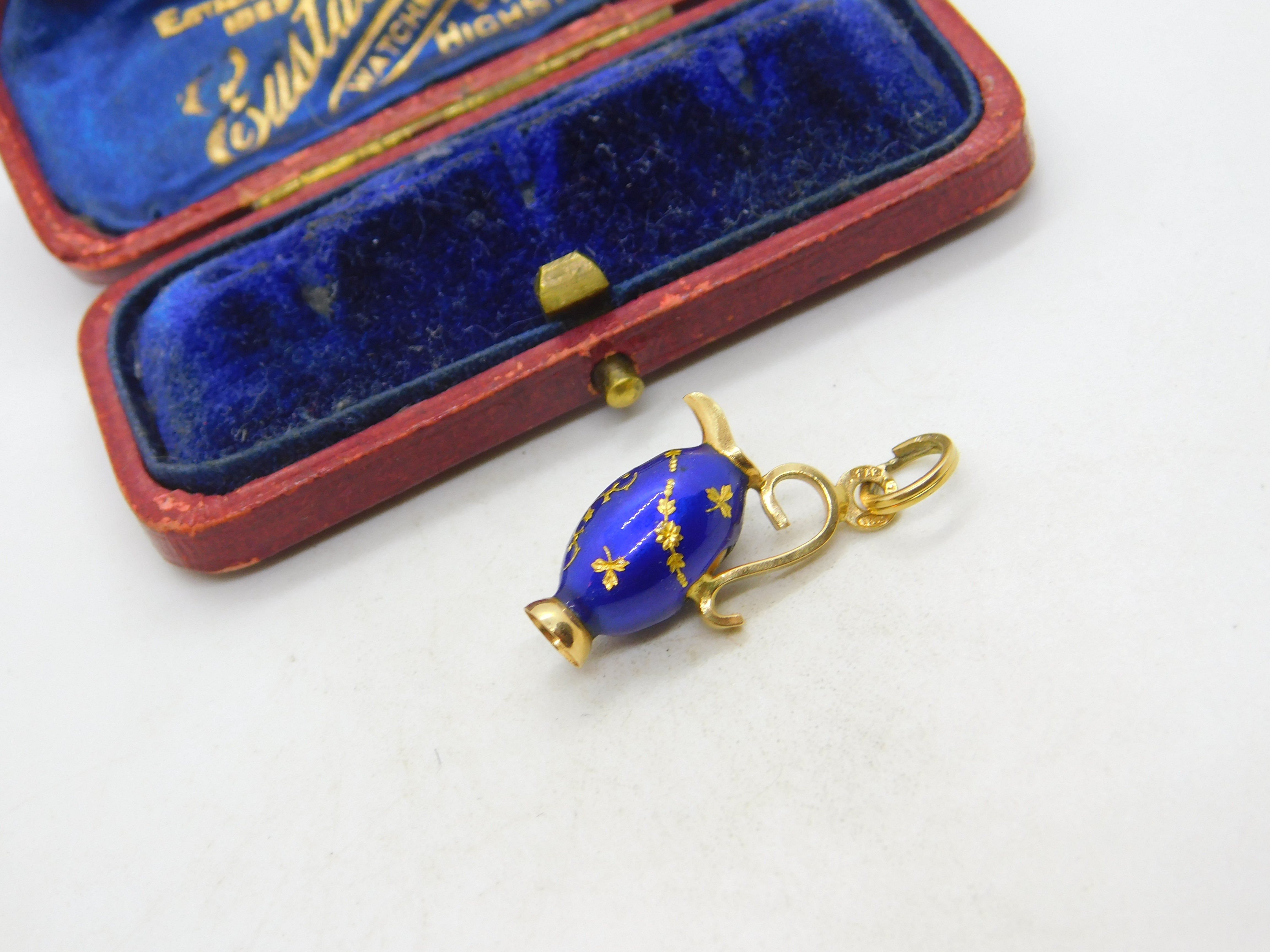 Details: A fantastic and wonderfully designed vintage 18ct yellow gold & blue enamel wine jug charm or pendant with lovely detailing possibly Italian hallmarked to the bale c1980. Very minor chip to the enamel base. This is a wonderful item that would make a perfect gift or addition to any collection. The BOX pictured is for PRESENTATION ONLY and is NOT included in the listings but used to frame the pictures unless specifically stated otherwise.