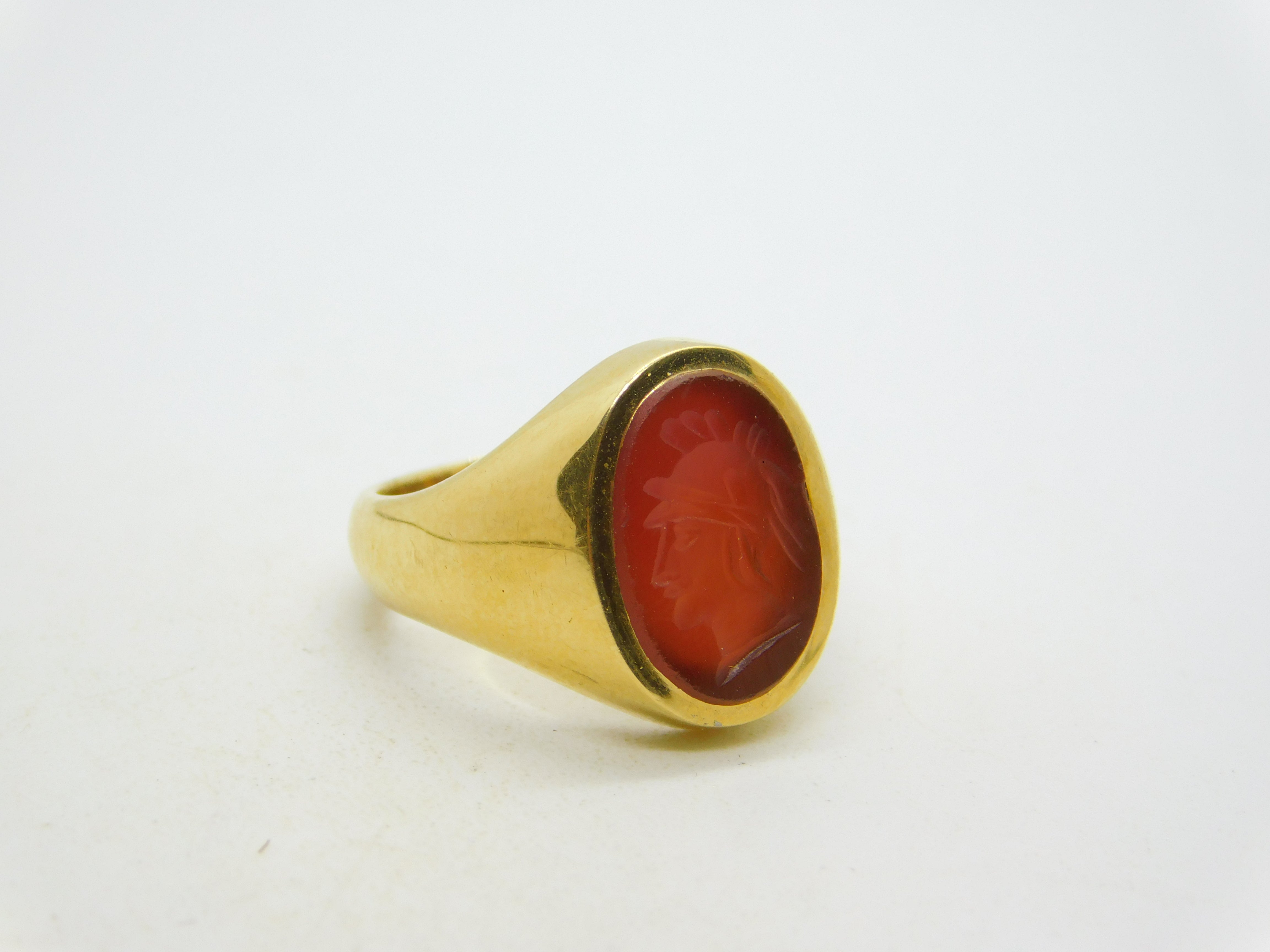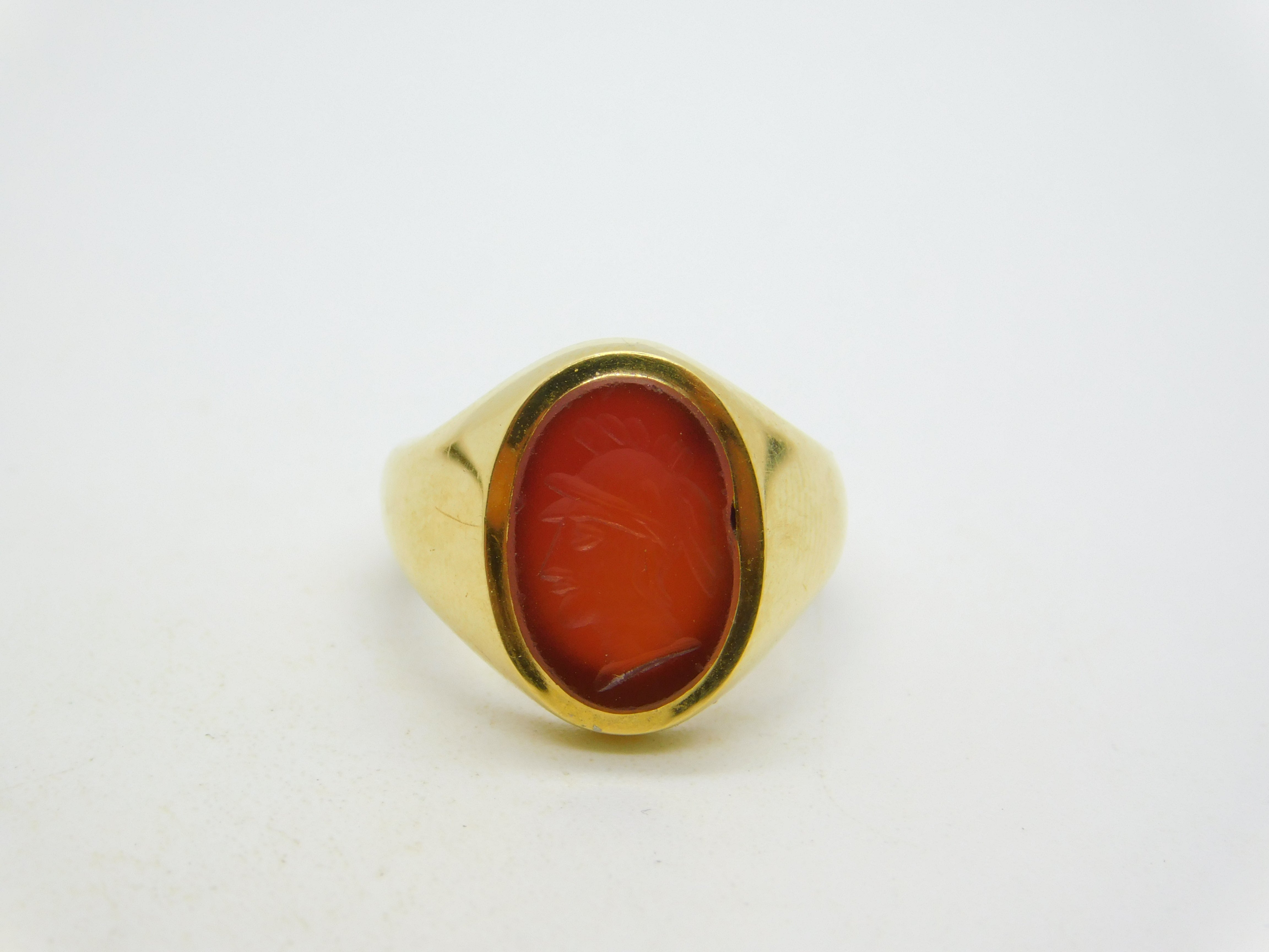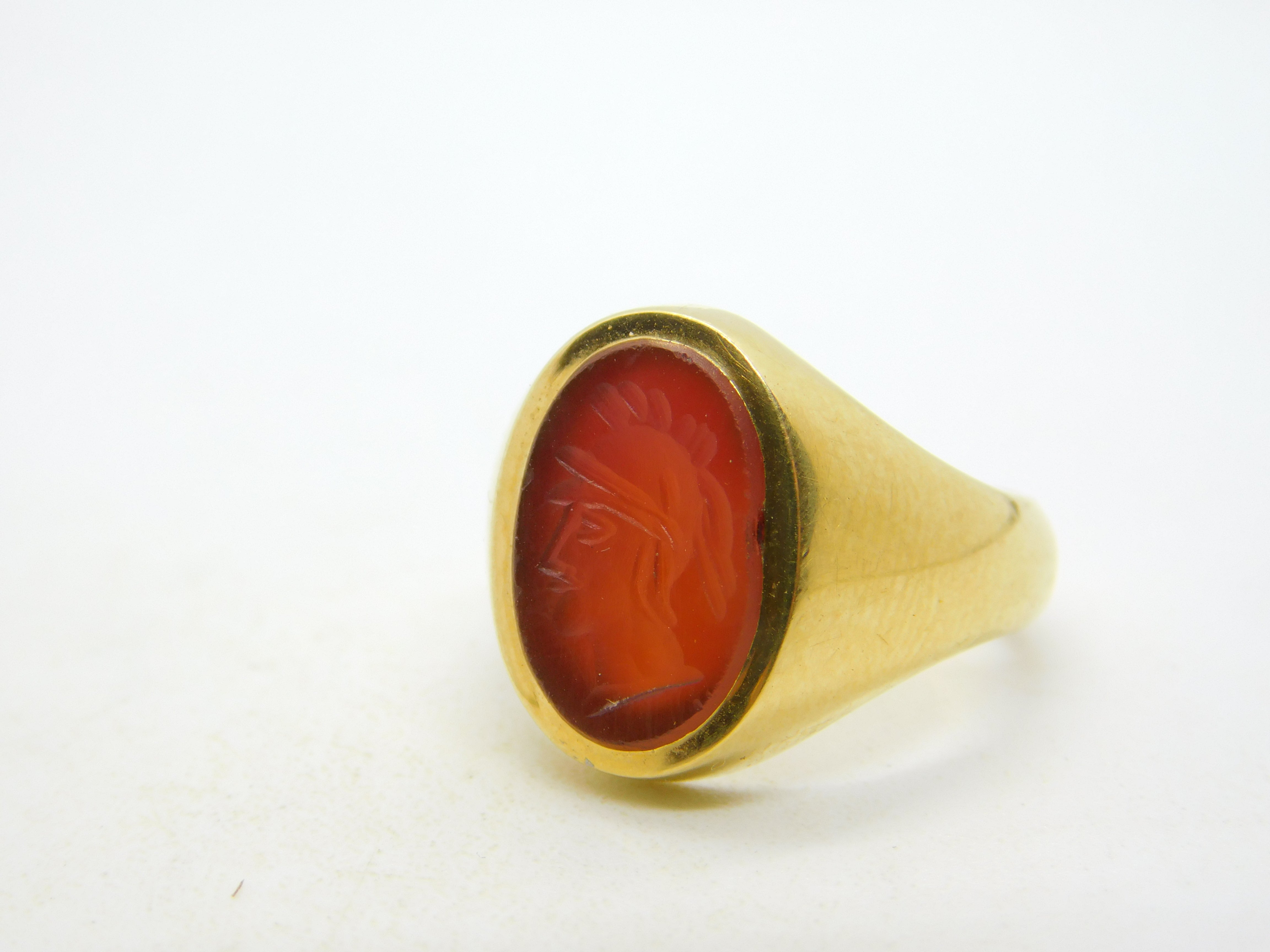 18ct Yellow Gold Carnelian Agate Centurion Intaglio Signet Ring Vintage 1968 London