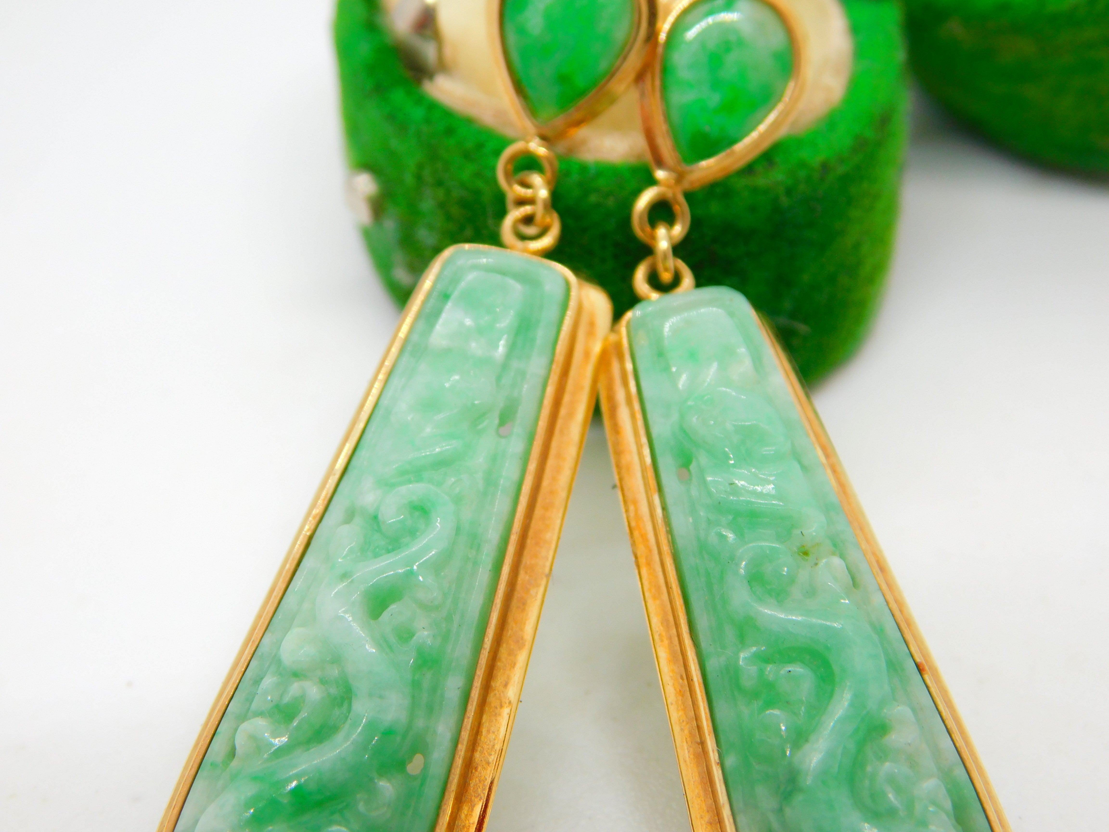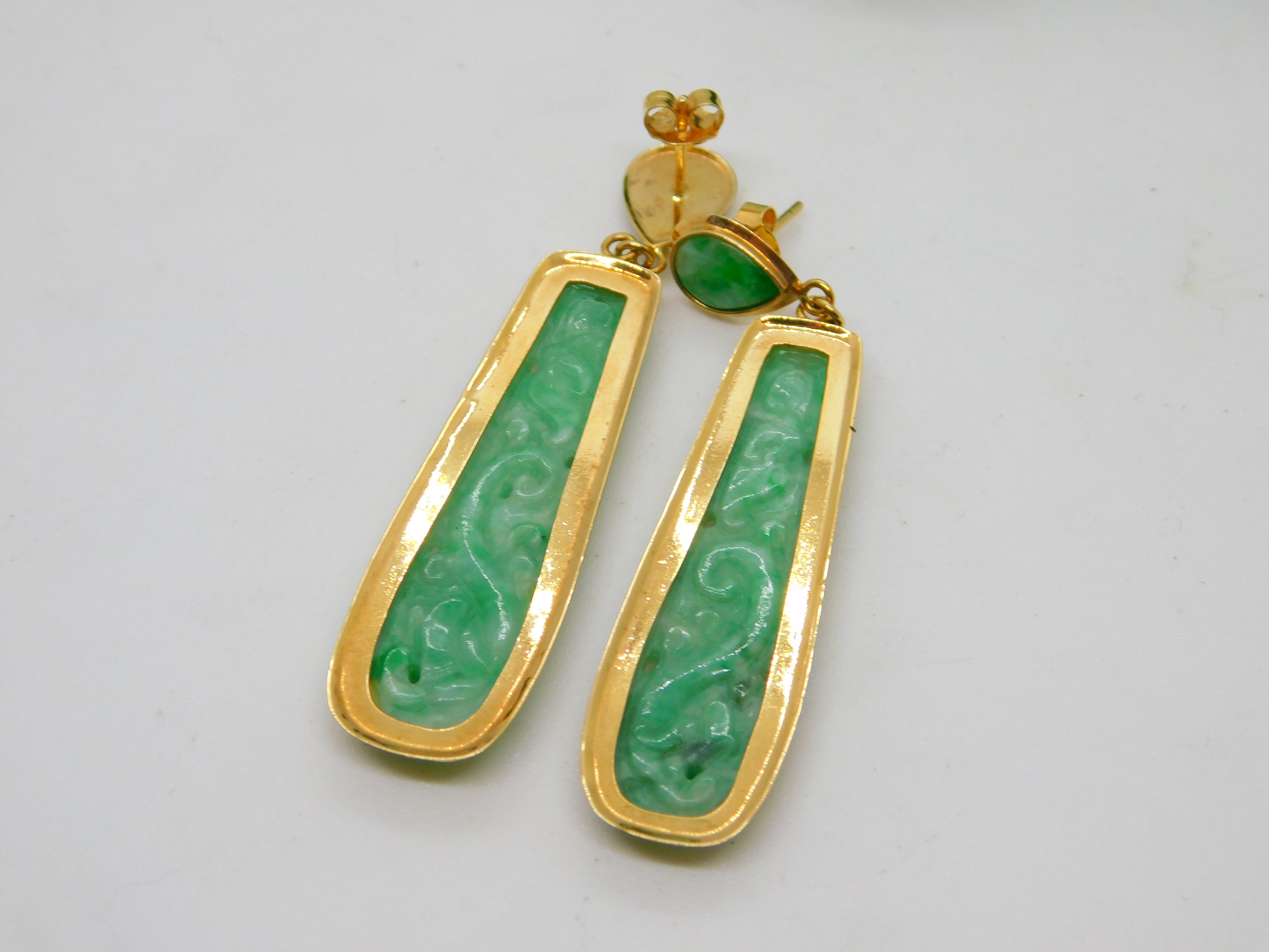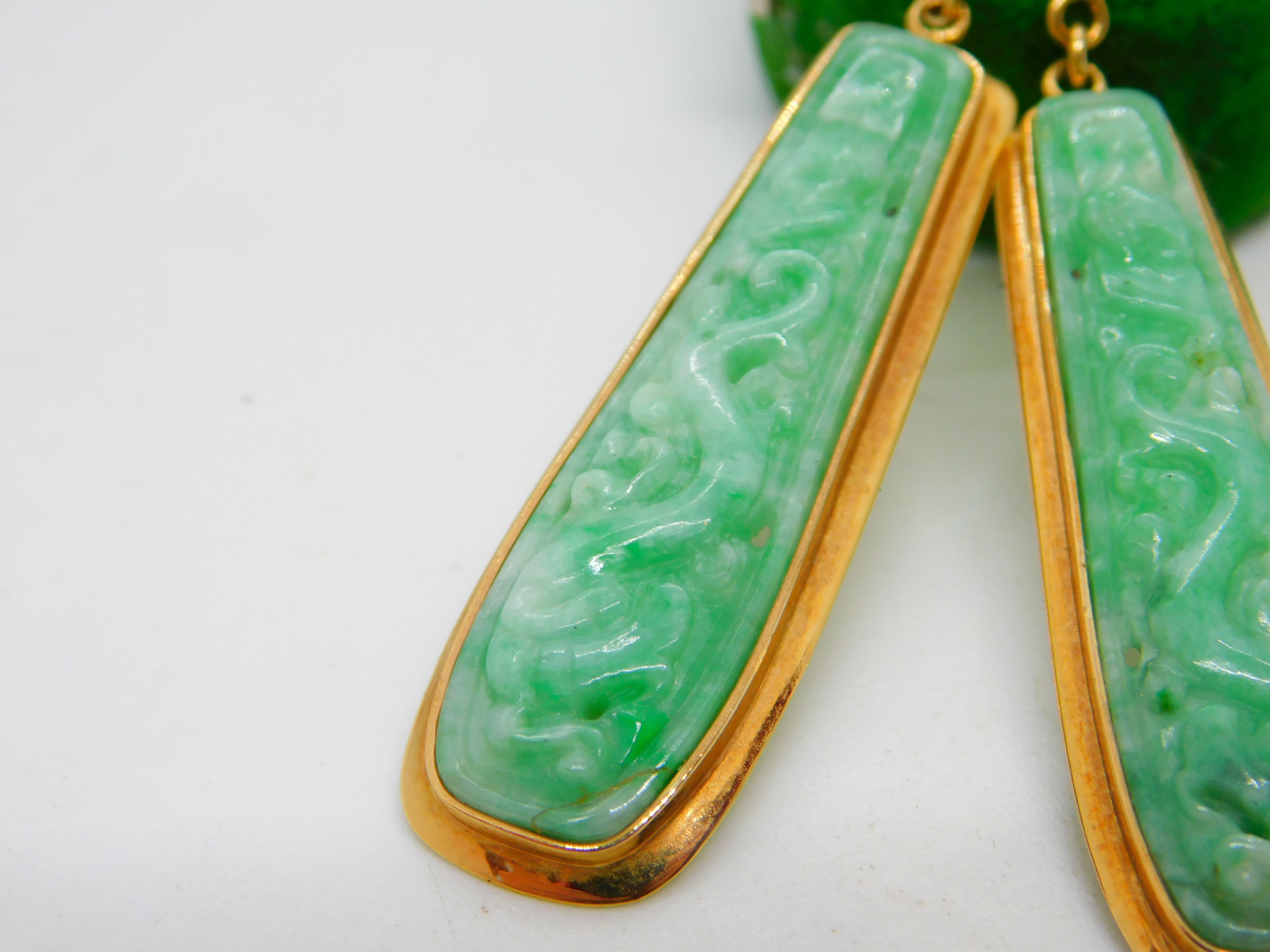 Details: A fantastic and wonderfully designed vintage 18ct yellow gold & carved apple-green jade drop earrings with lovely detailing hallmarked '750' to the backs c1970. This is a wonderful item that would make a perfect gift or addition to any collection. The BOX pictured is for PRESENTATION ONLY and is NOT included in the listings but used to frame the pictures unless specifically stated otherwise.