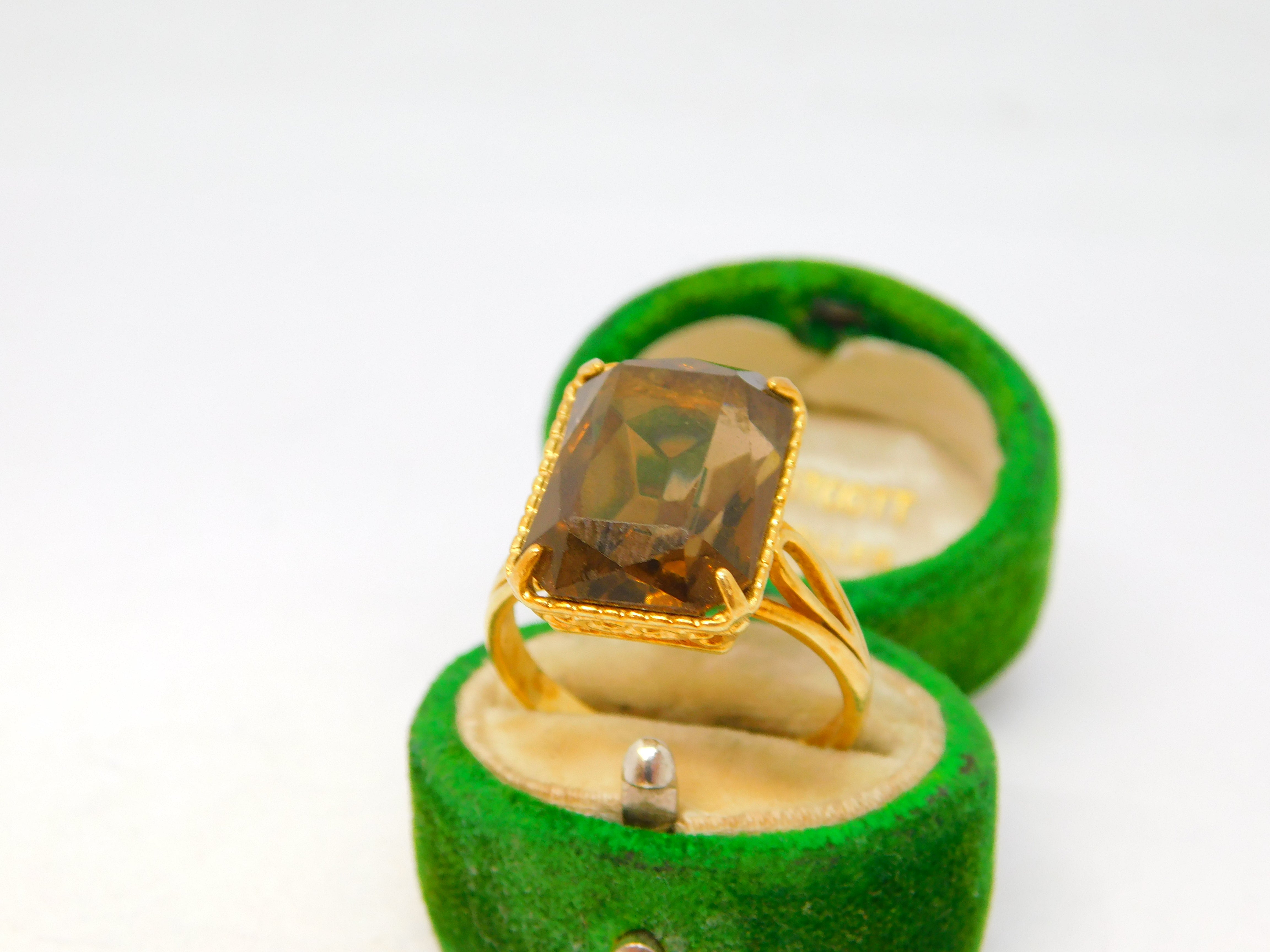 Details: A fantastic and wonderfully designed vintage 18ct yellow gold & large faceted citrine set dress ring hallmarked to the interior band c1970. This is a wonderful item that would make a perfect gift or addition to any collection. The BOX pictured is for PRESENTATION ONLY and is NOT included in the listings but used to frame the pictures unless specifically stated otherwise.