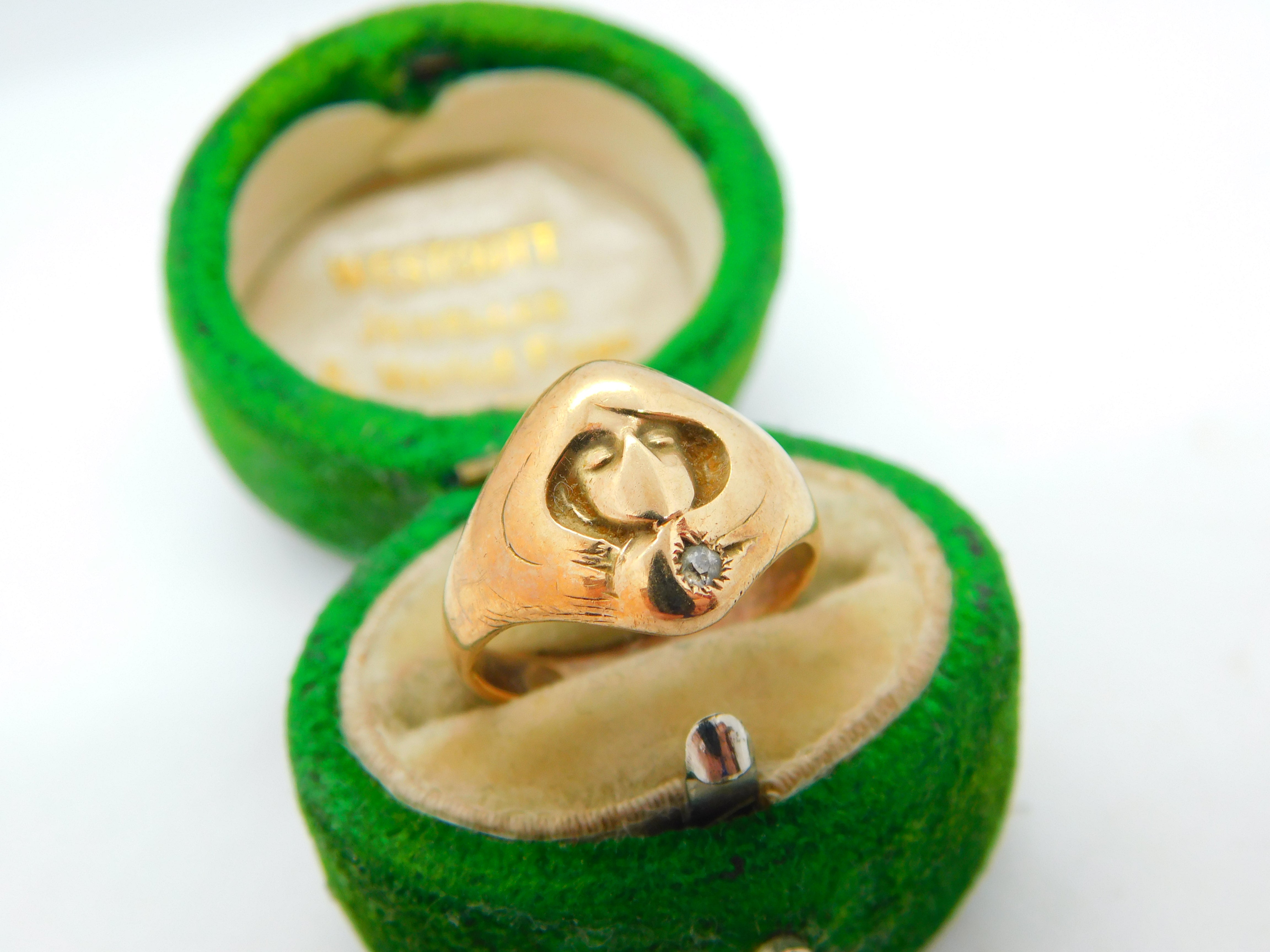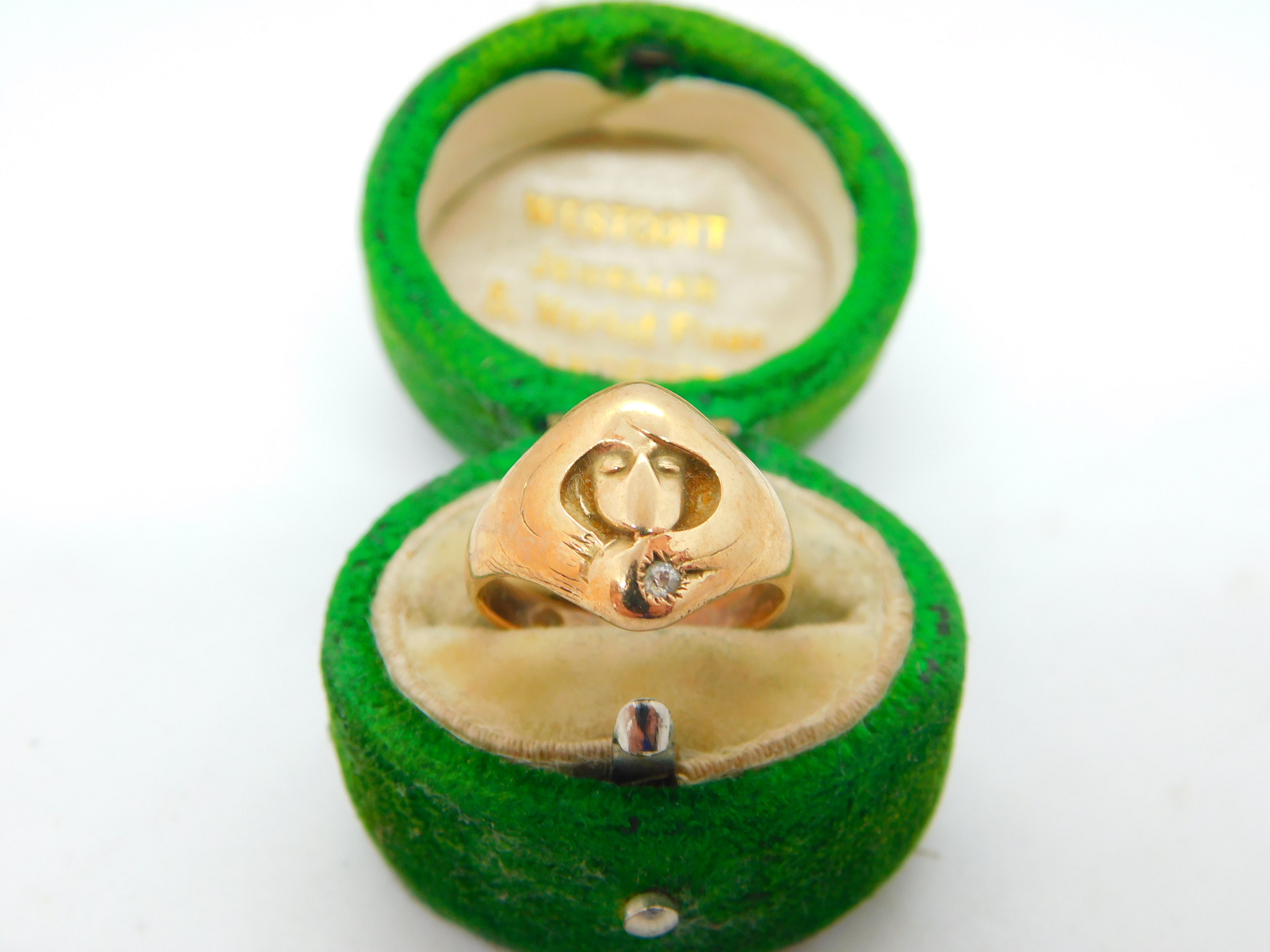 Details: A fantastic and wonderfully designed antique 18ct yellow gold signet ring depicting the face of a lady in art nouveau style set with a diamond to the bottom edge c1930, the gold has been XRF tested as it is unmarked. This is a wonderful item that would make a perfect gift or addition to any collection. The BOX pictured is for PRESENTATION ONLY and is NOT included in the listings but used to frame the pictures unless specifically stated otherwise.
