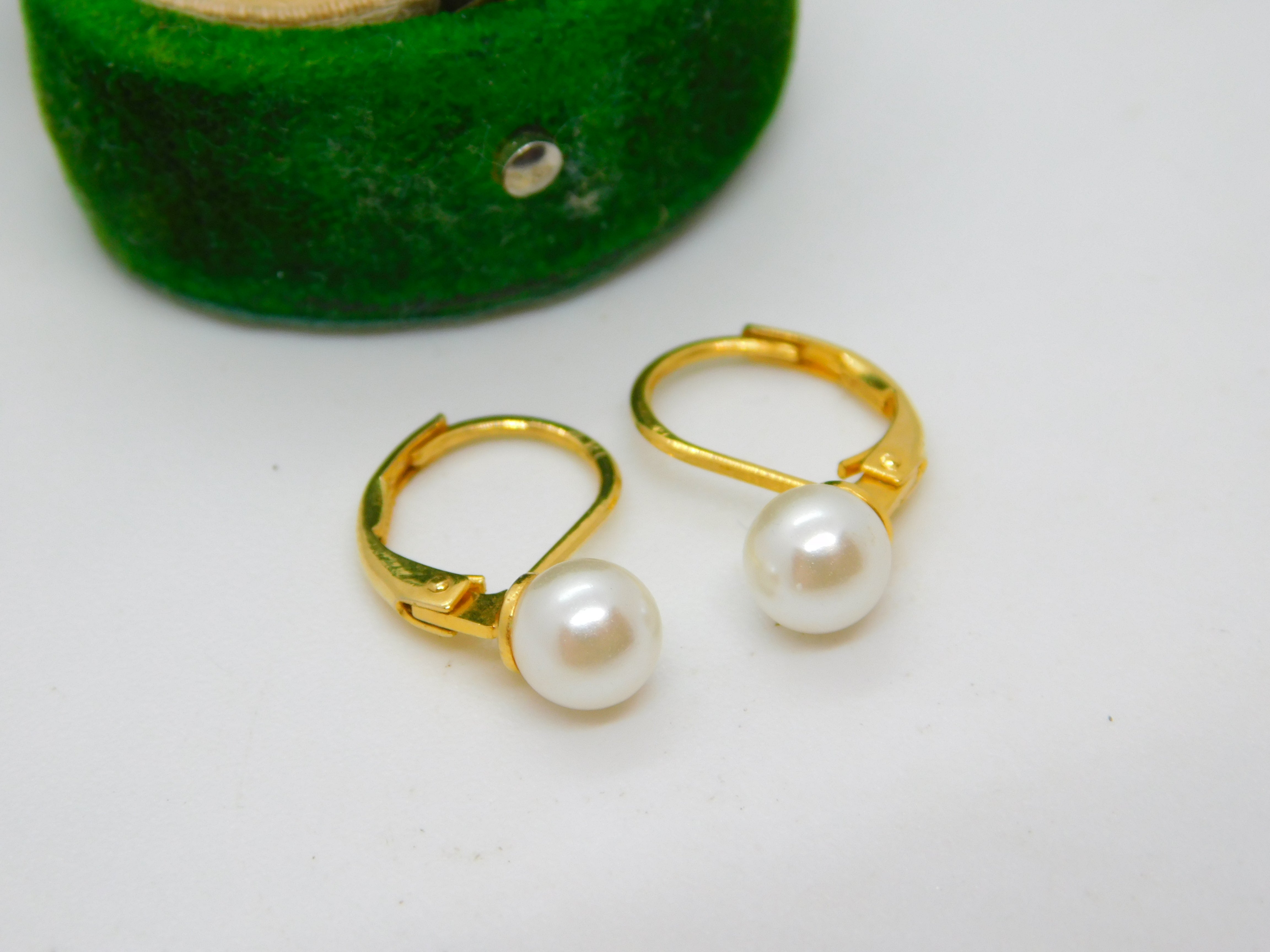 18ct Yellow Gold & Pearl Set Hook Hoop Earrings Vintage c1980