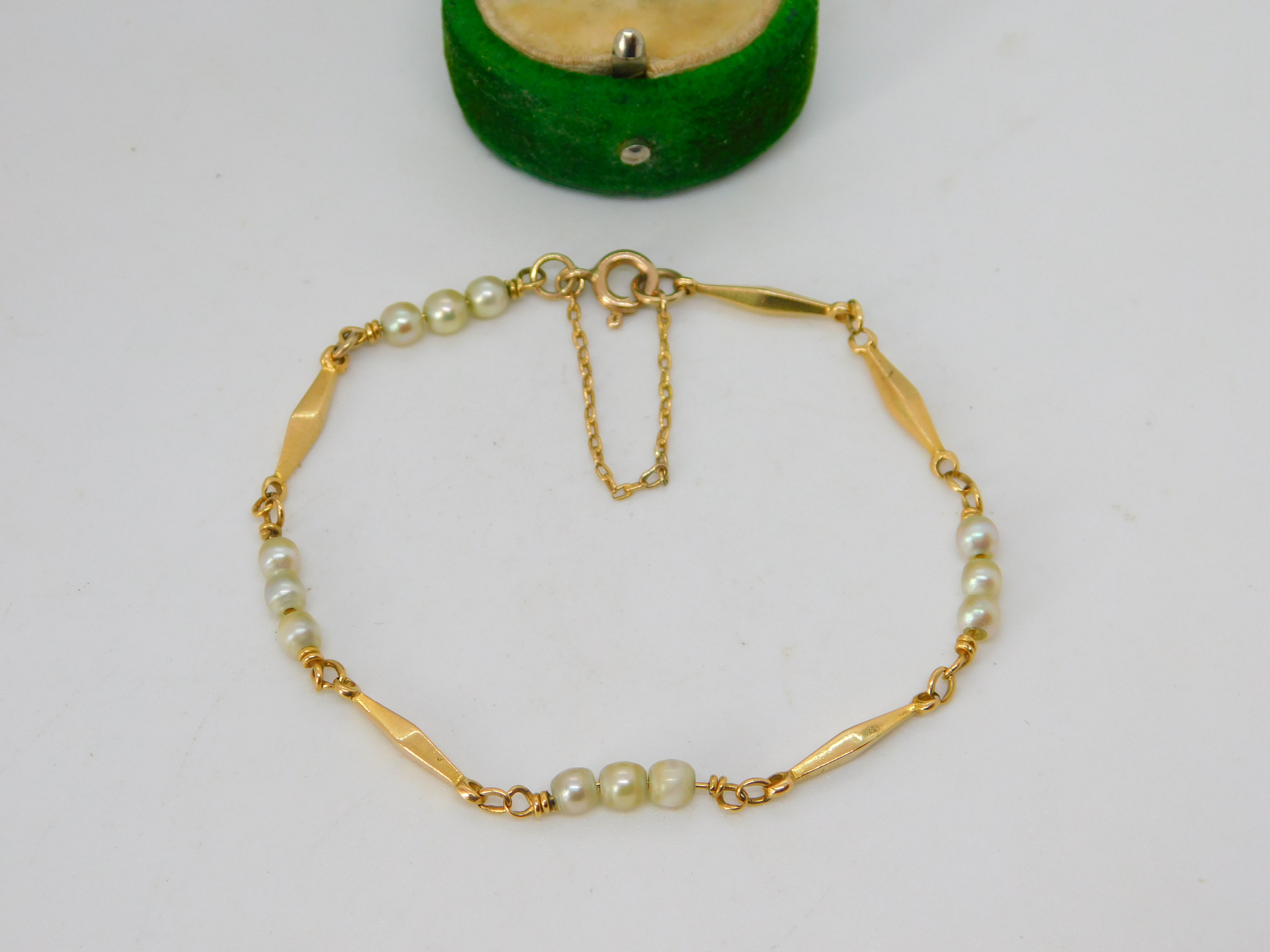 Details: A fantastic and wonderfully designed antique art deco 18ct yellow gold panel bracelet interspersed with pearls c1930, the gold has been XRF tested as it is unmarked. This is a wonderful item that would make a perfect gift or addition to any collection. The BOX pictured is for PRESENTATION ONLY and is NOT included in the listings but used to frame the pictures unless specifically stated otherwise.
