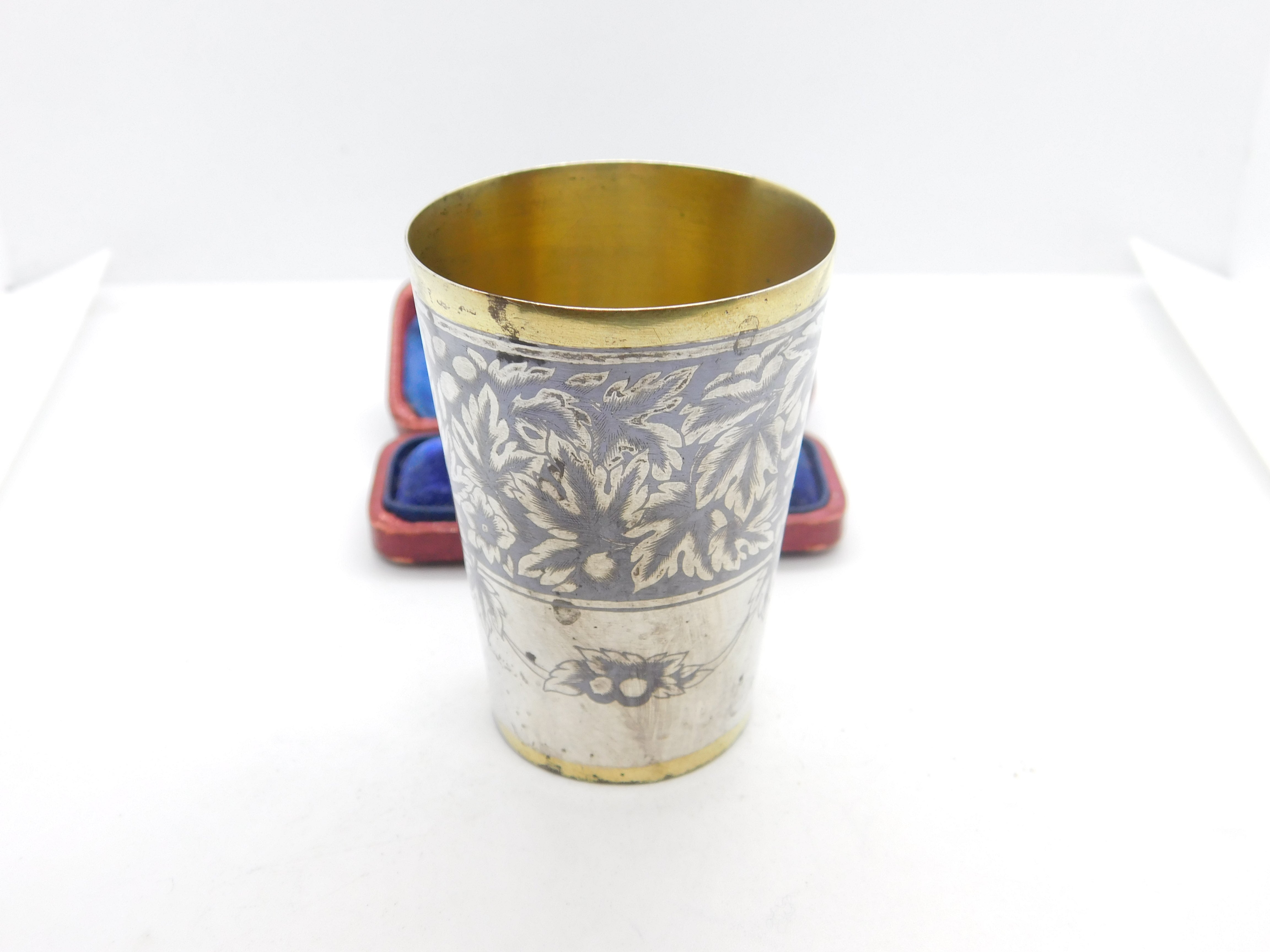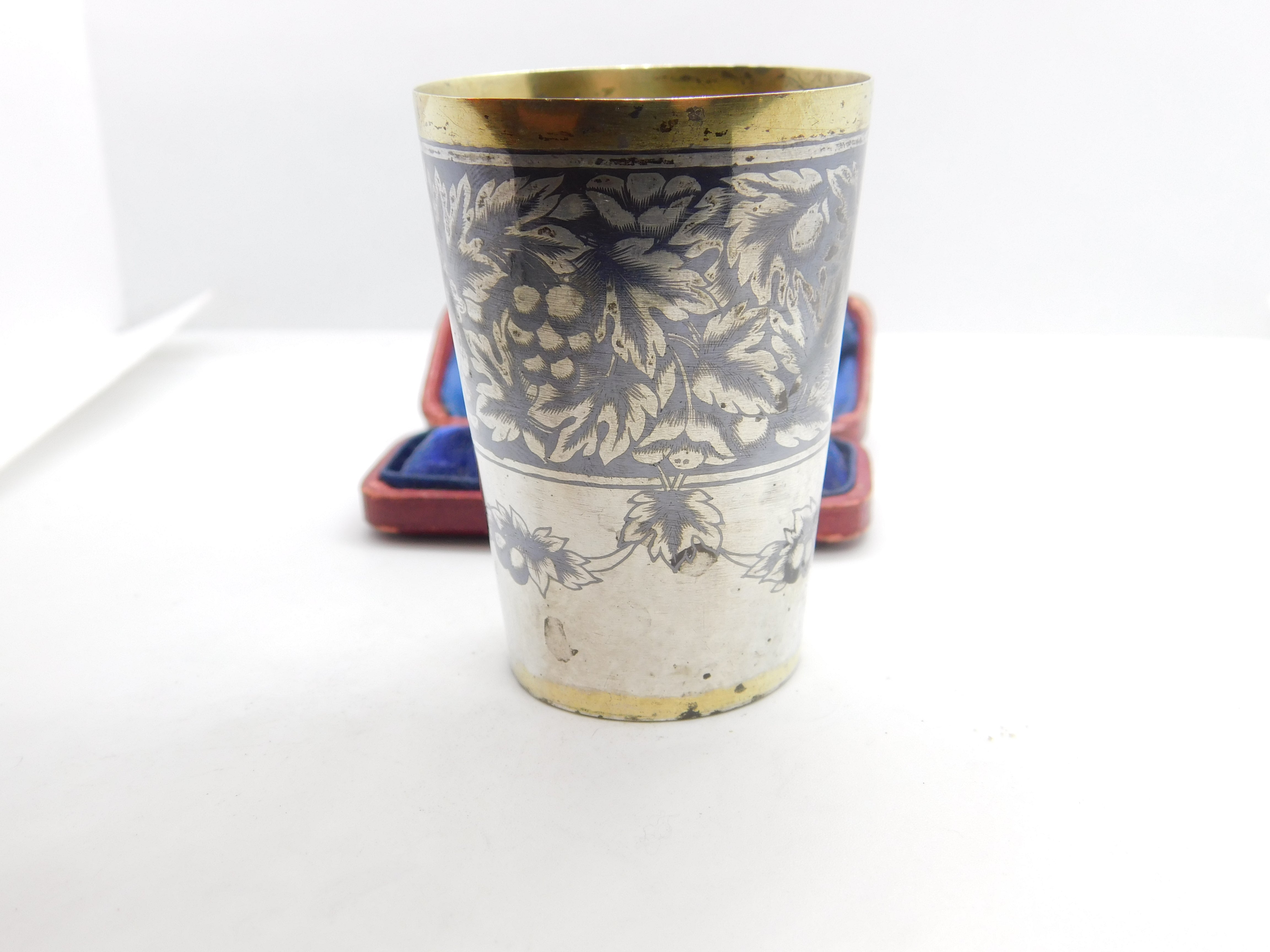Details: A fantastic and wonderfully designed antique Victorian Russian 875 grade silver gilt and floral niello enamel vodka shot or tot cup with lovely detailing hallmarked to the base c1880. Needs a good polish but a beautiful example. This is a wonderful item that would make a perfect gift or addition to any collection. The BOX pictured is for PRESENTATION ONLY and is NOT included in the listings but used to frame the pictures unless specifically stated otherwise.