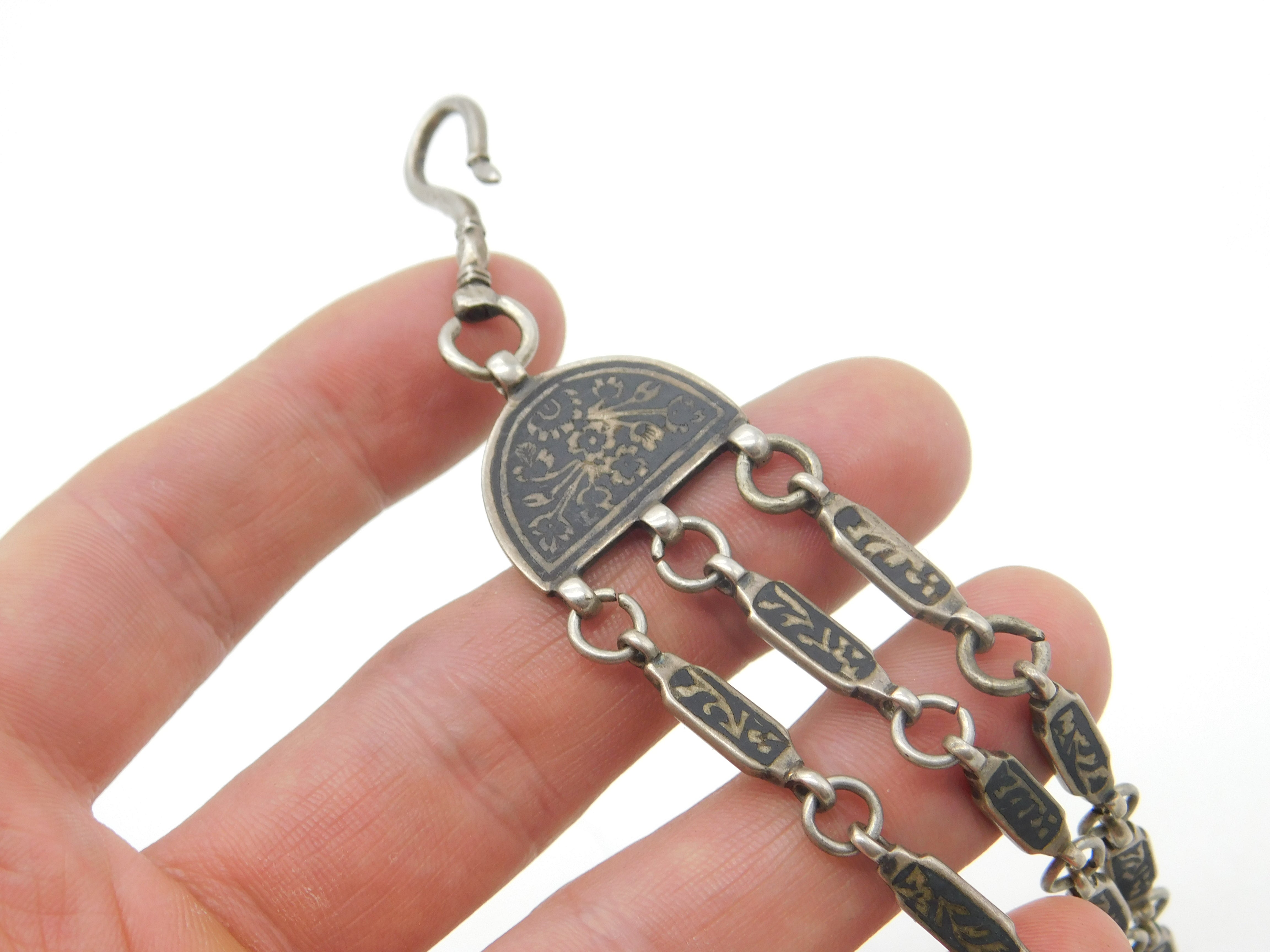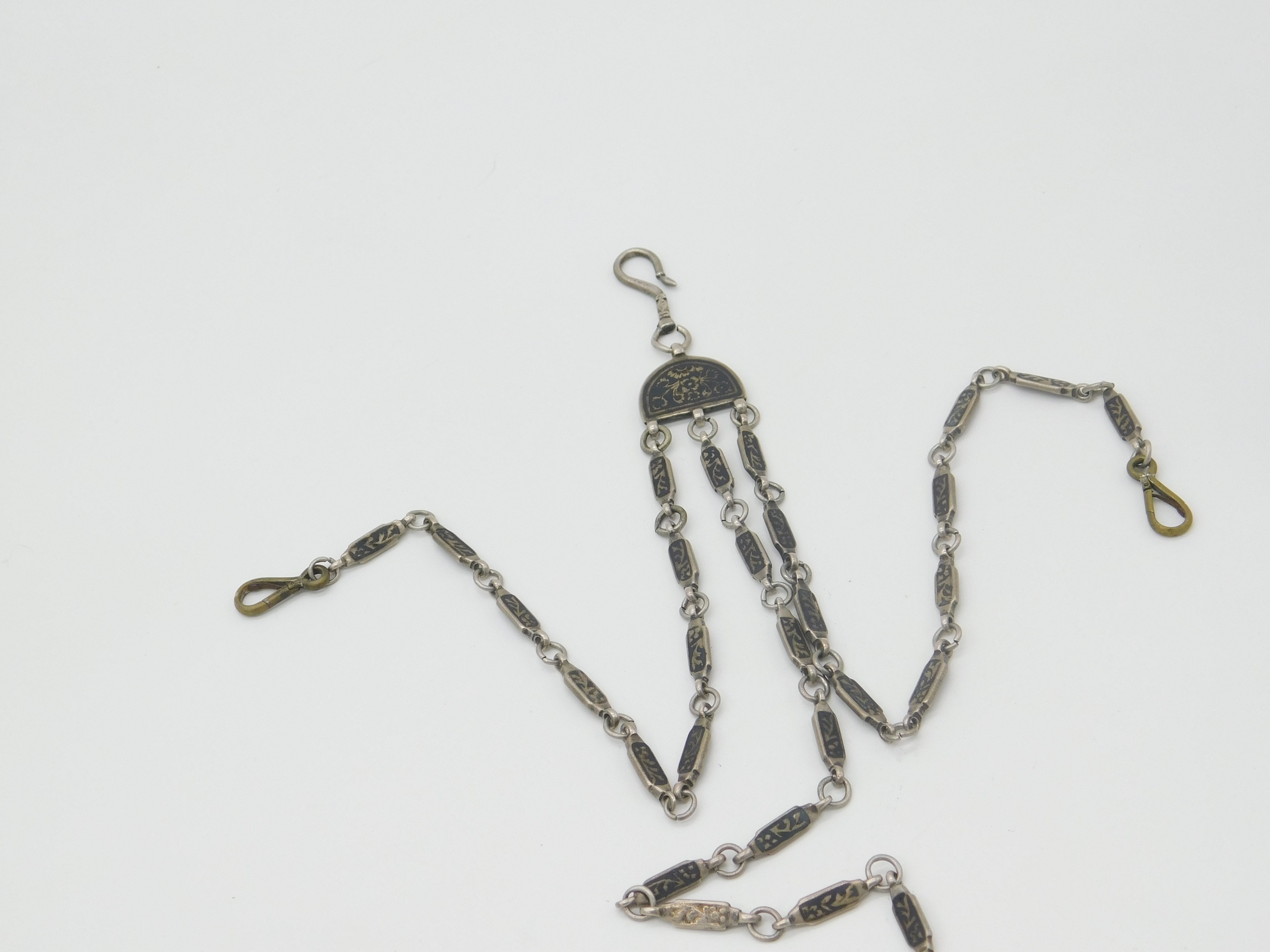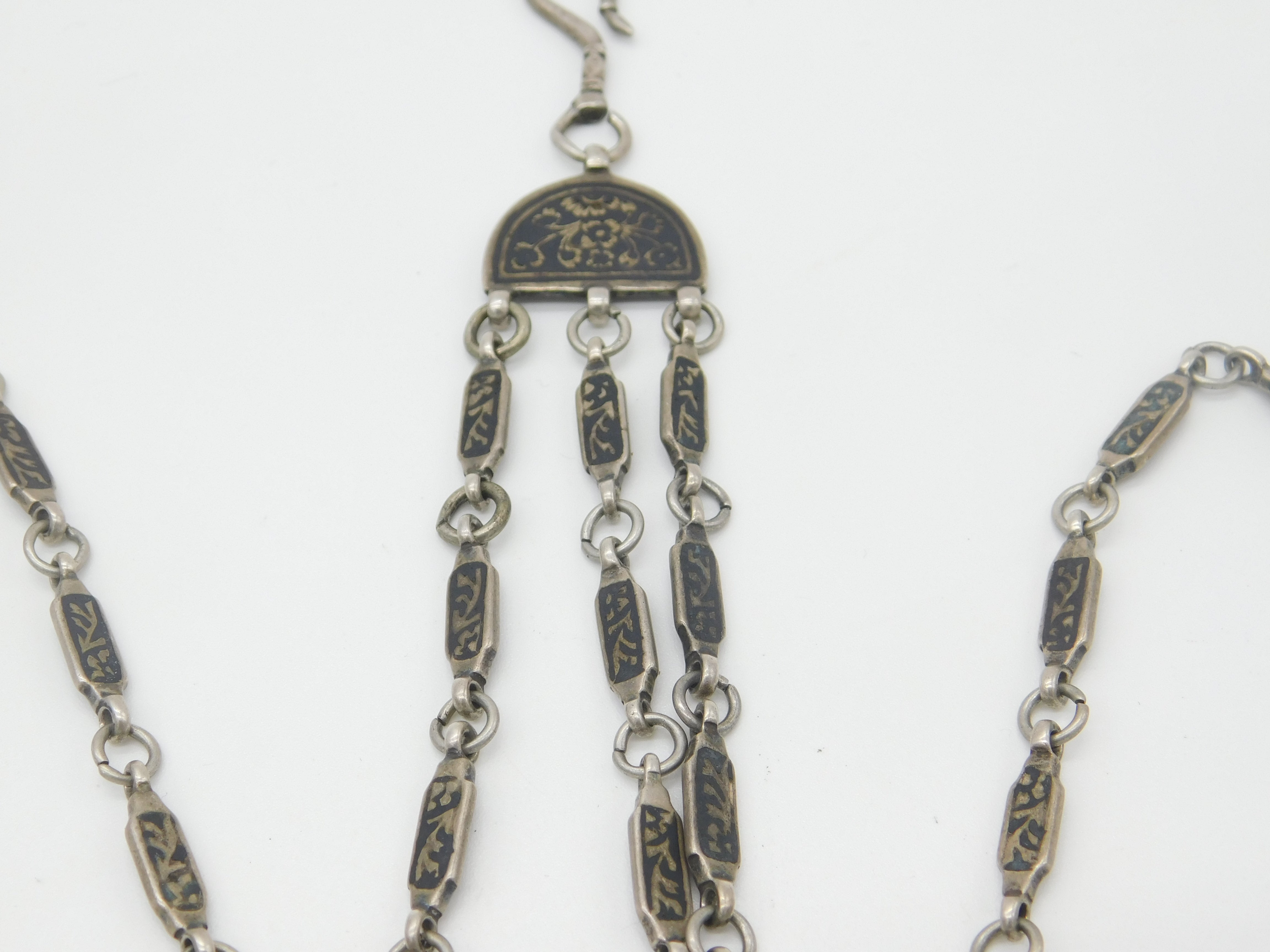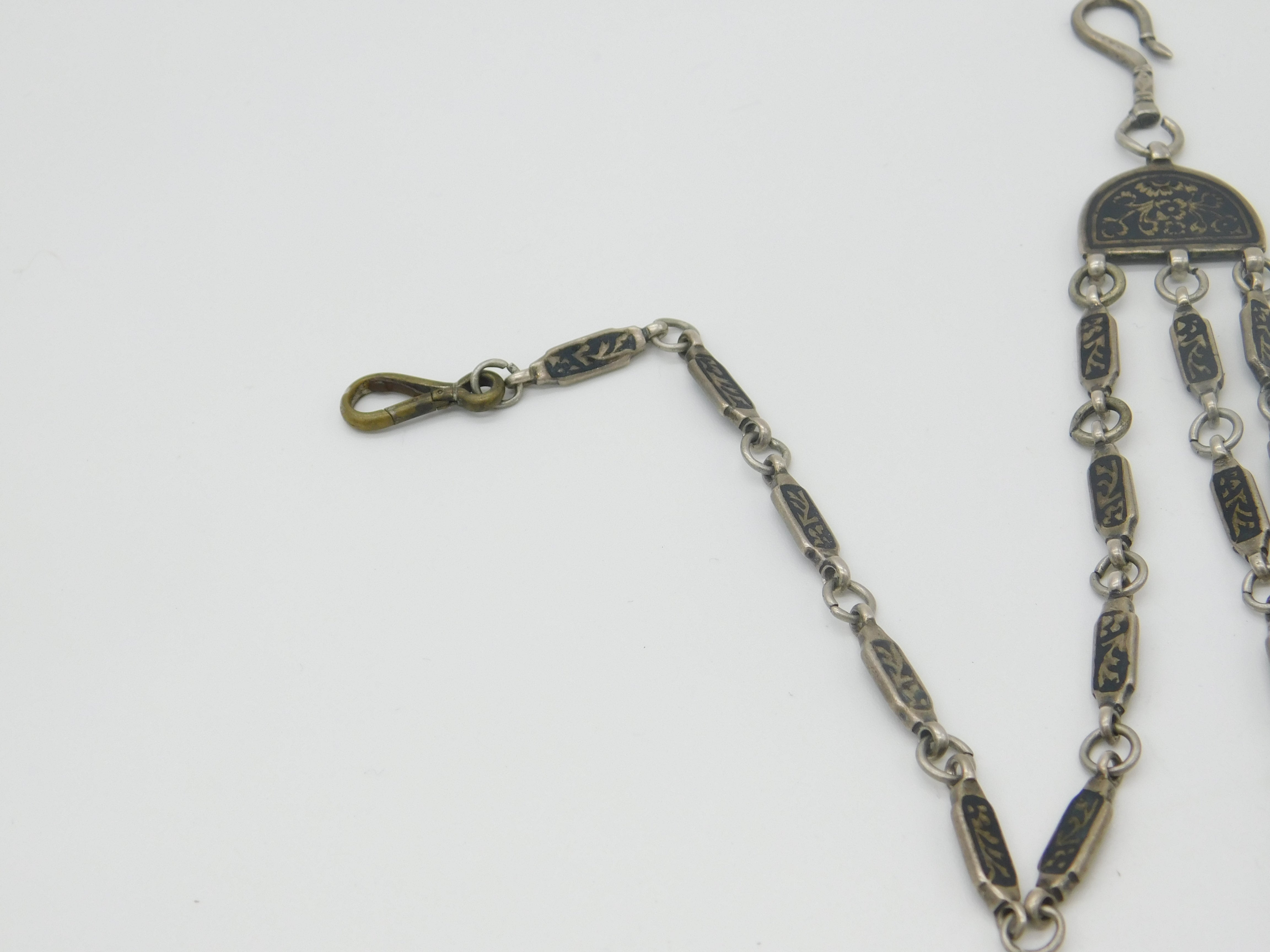 Russian White Metal & Niello Enamel Sewing Chatelaine with Clips Antique c1860