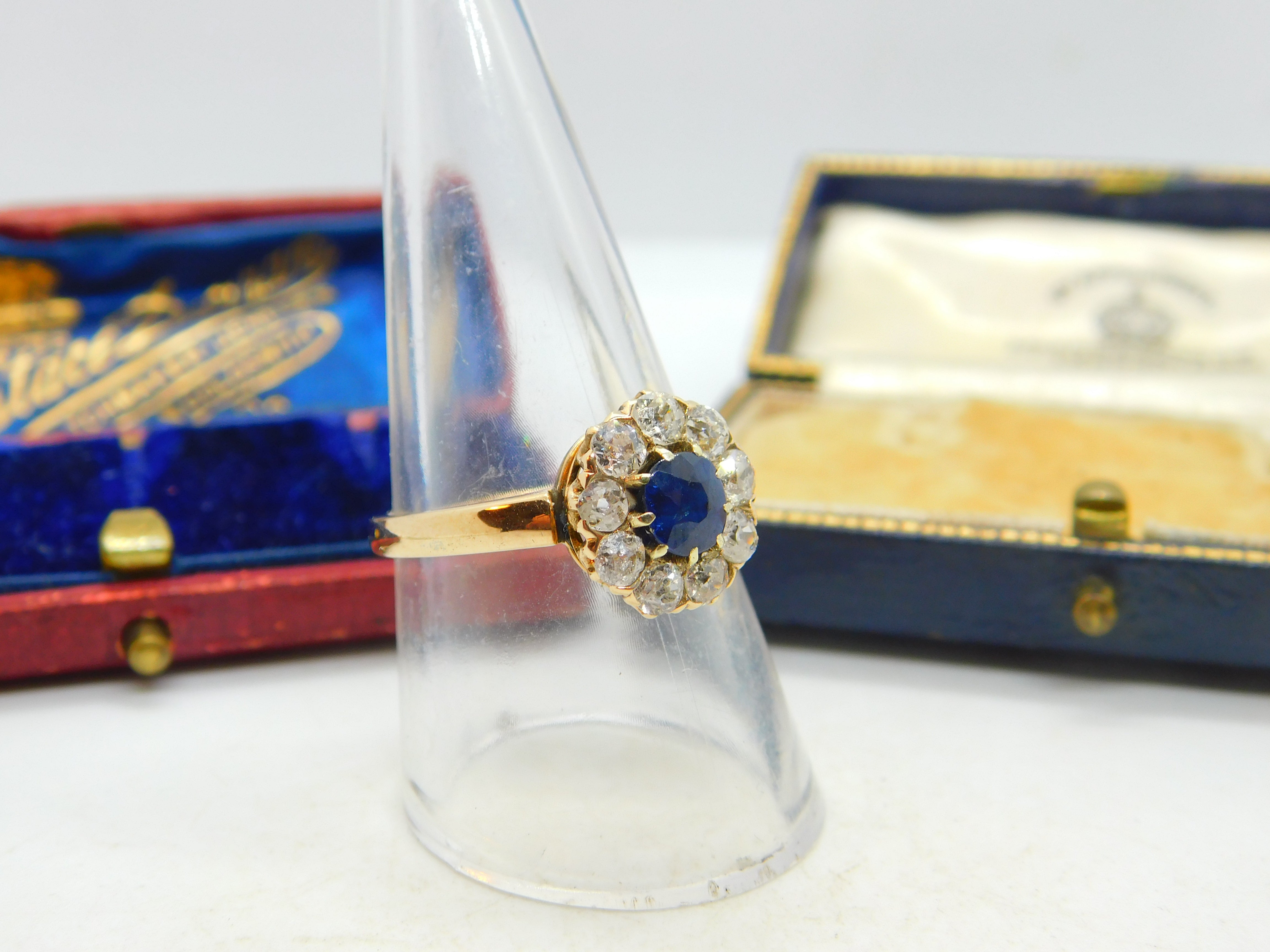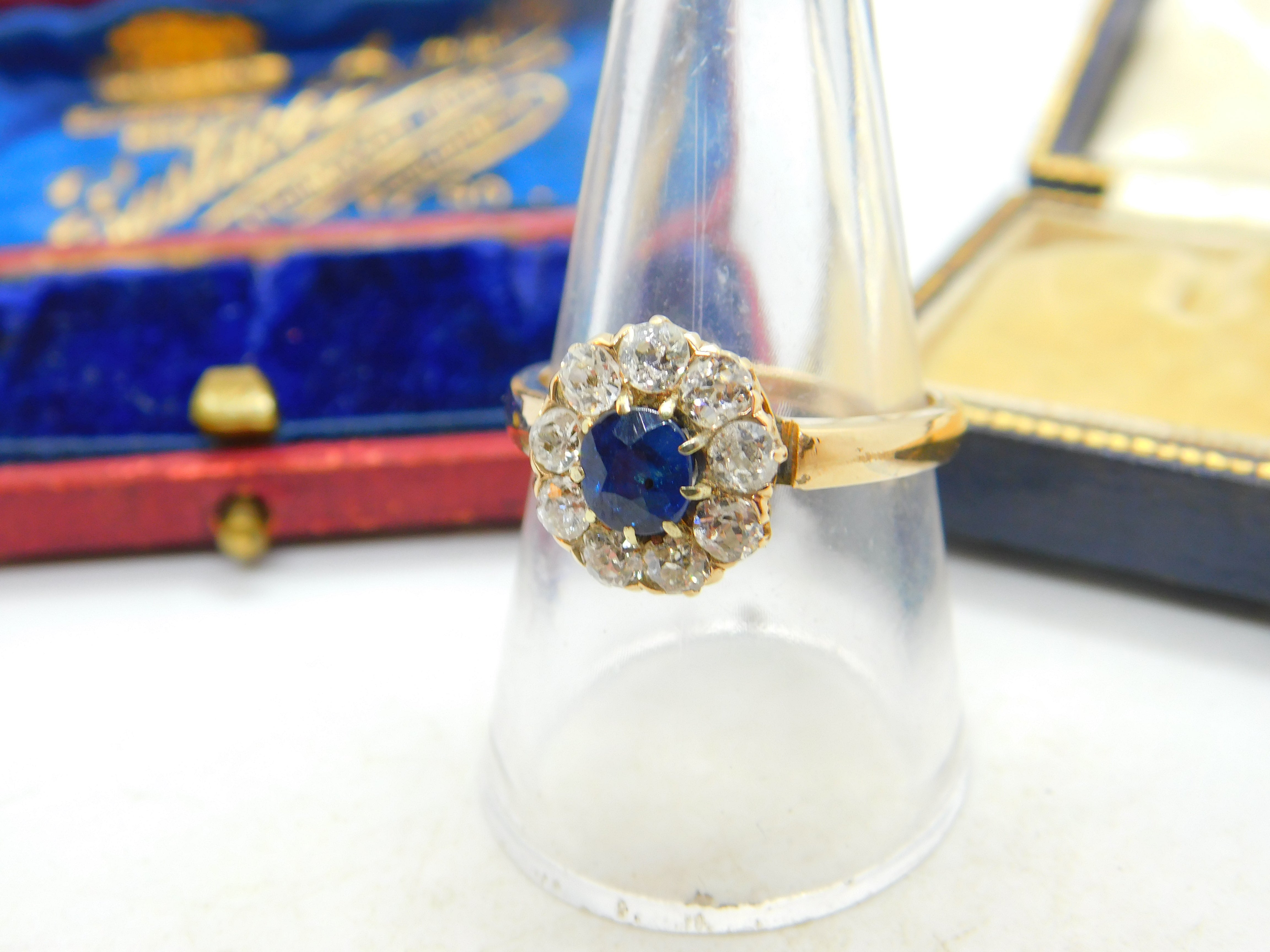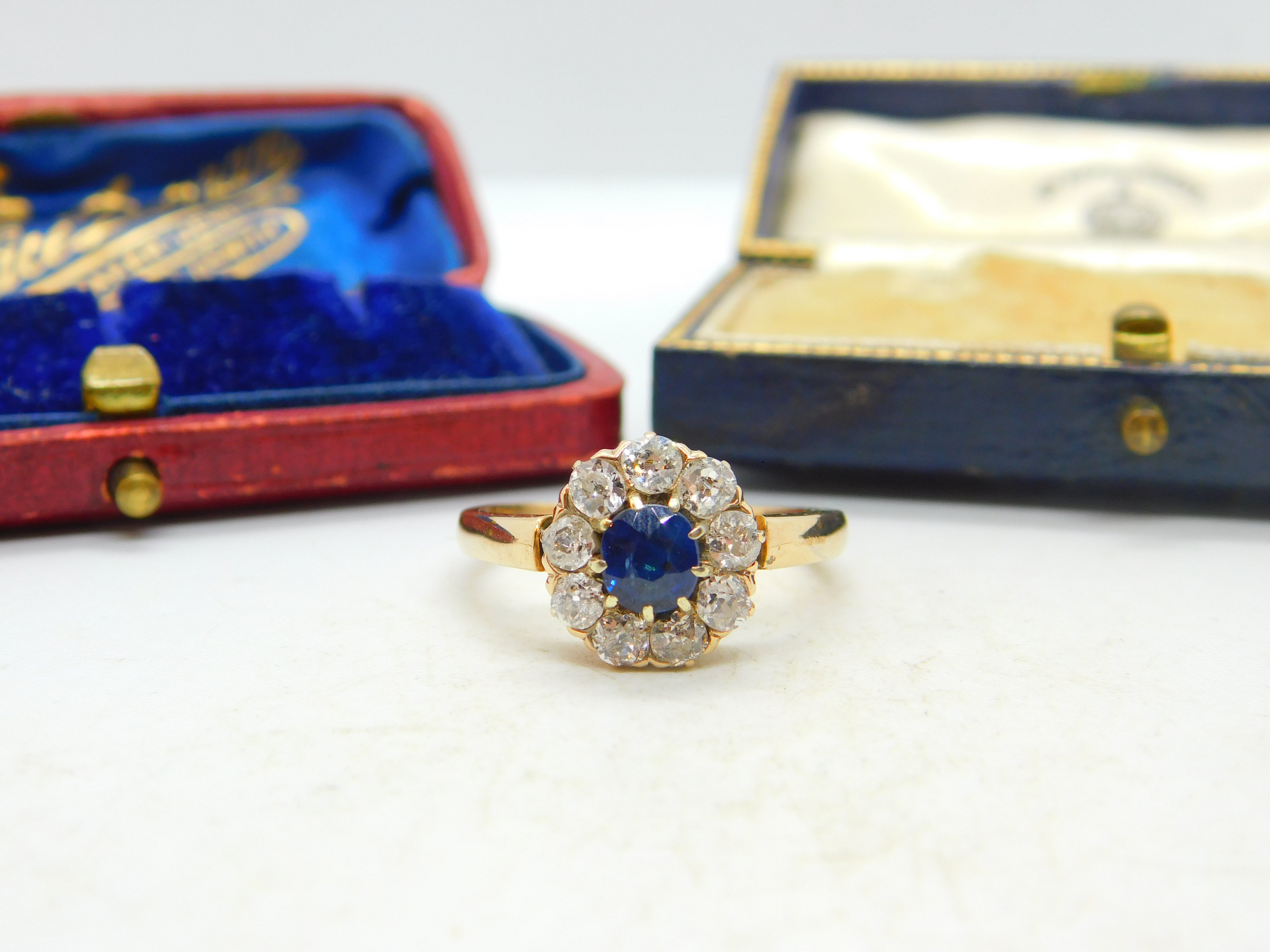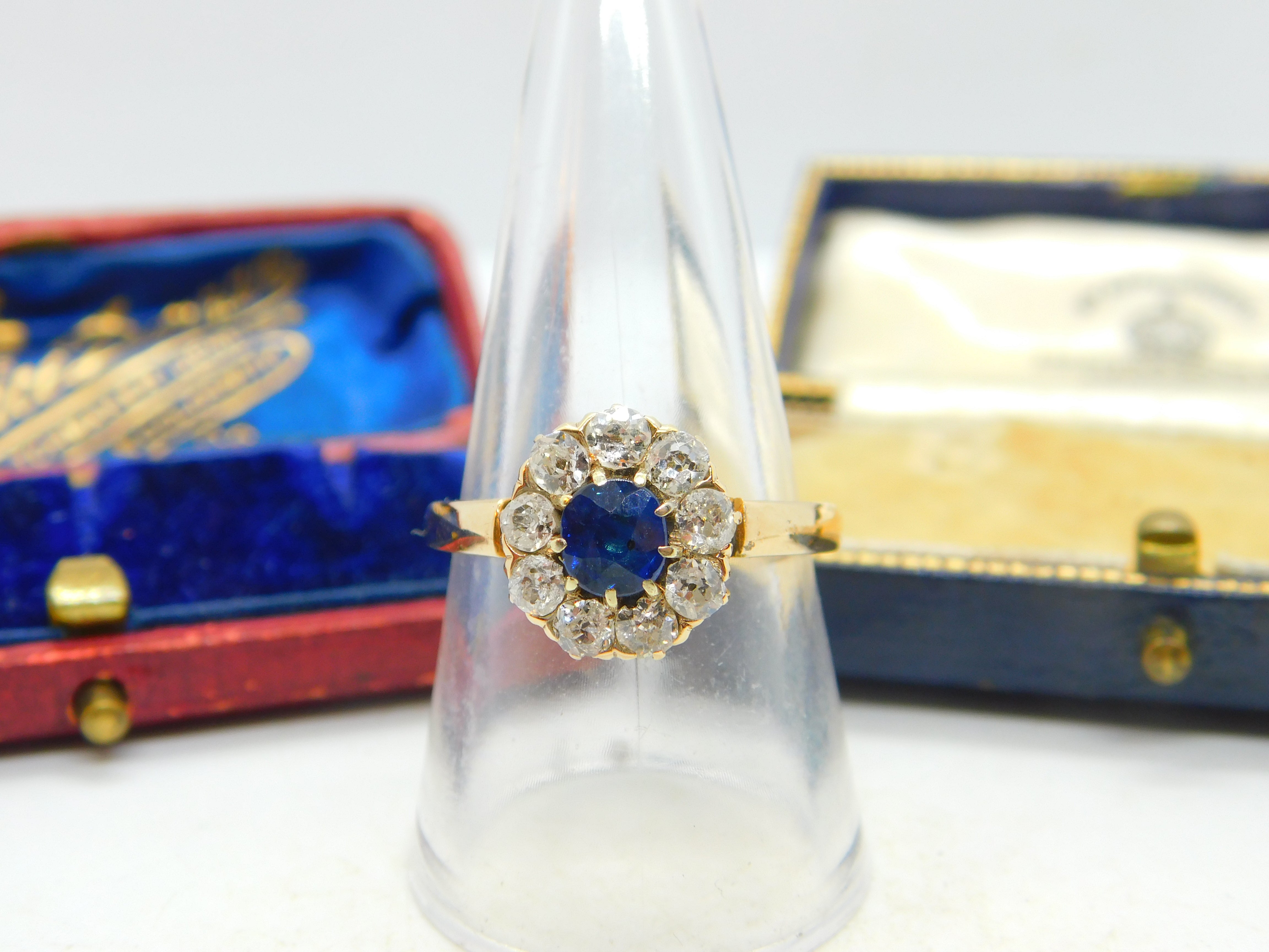 Sapphire and 2ct Diamond 14ct Yellow Gold Cluster Ring Vintage Art Deco c1920