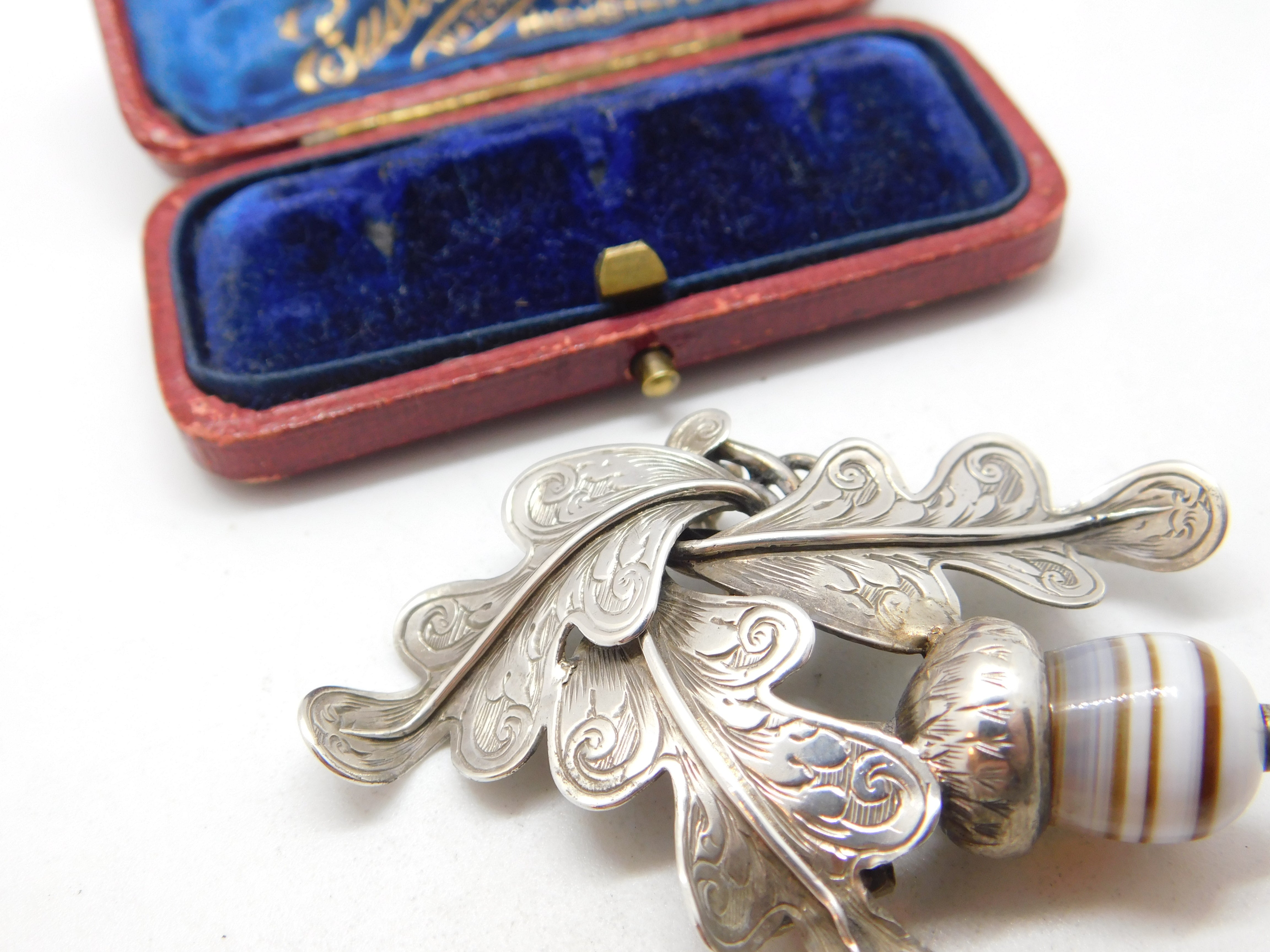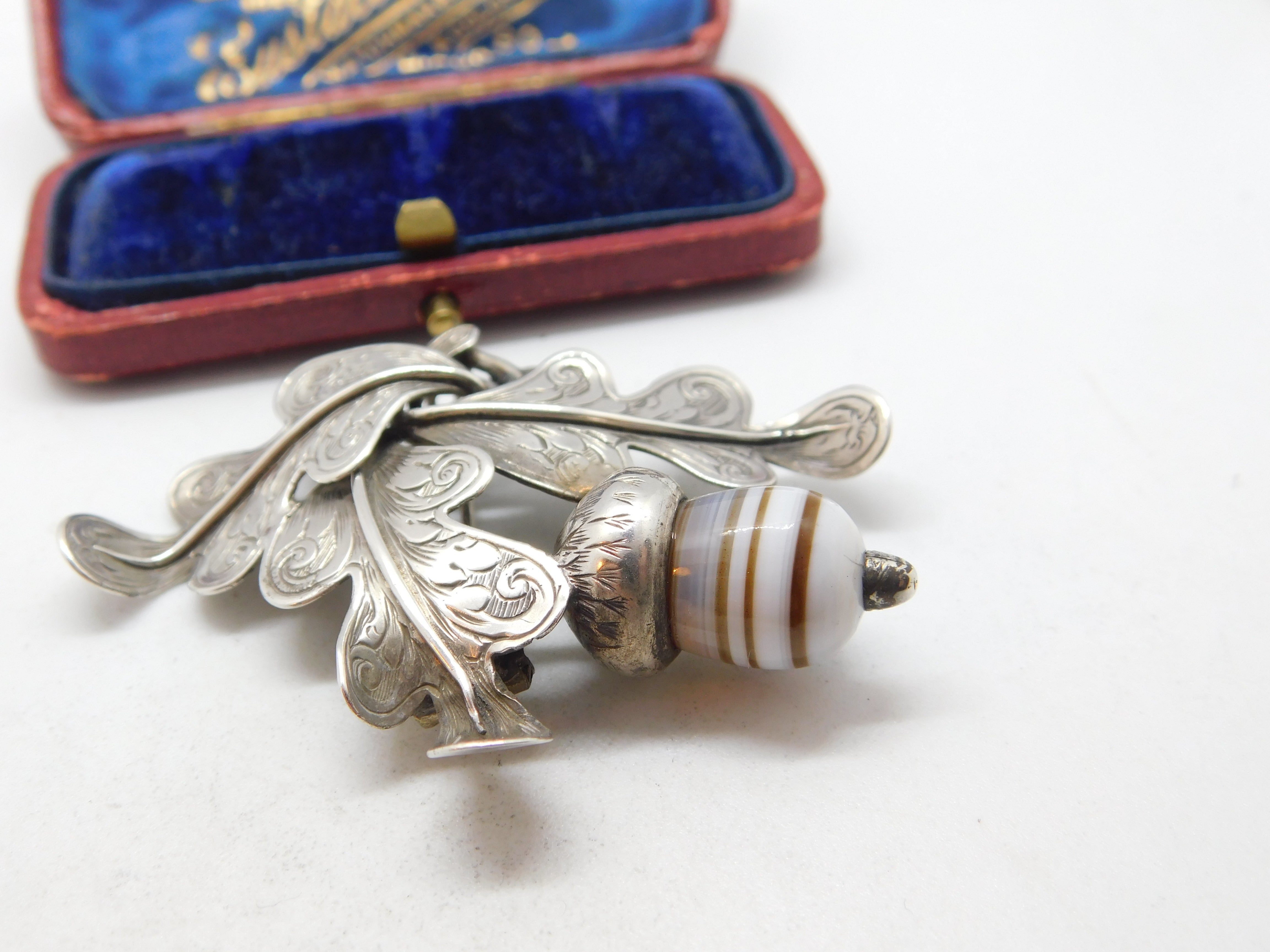 Details: A fantastic and wonderfully designed antique Victorian Scottish sterling silver brooch in the form of an oak leaf with carved banded agate in the form of an acorn c1860 - the silver has been XRF tested. A charming example of Scottish jewellery. This is a wonderful item that would make a perfect gift or addition to any collection. The BOX pictured is for PRESENTATION ONLY and is NOT included in the listings but used to frame the pictures unless specifically stated otherwise.