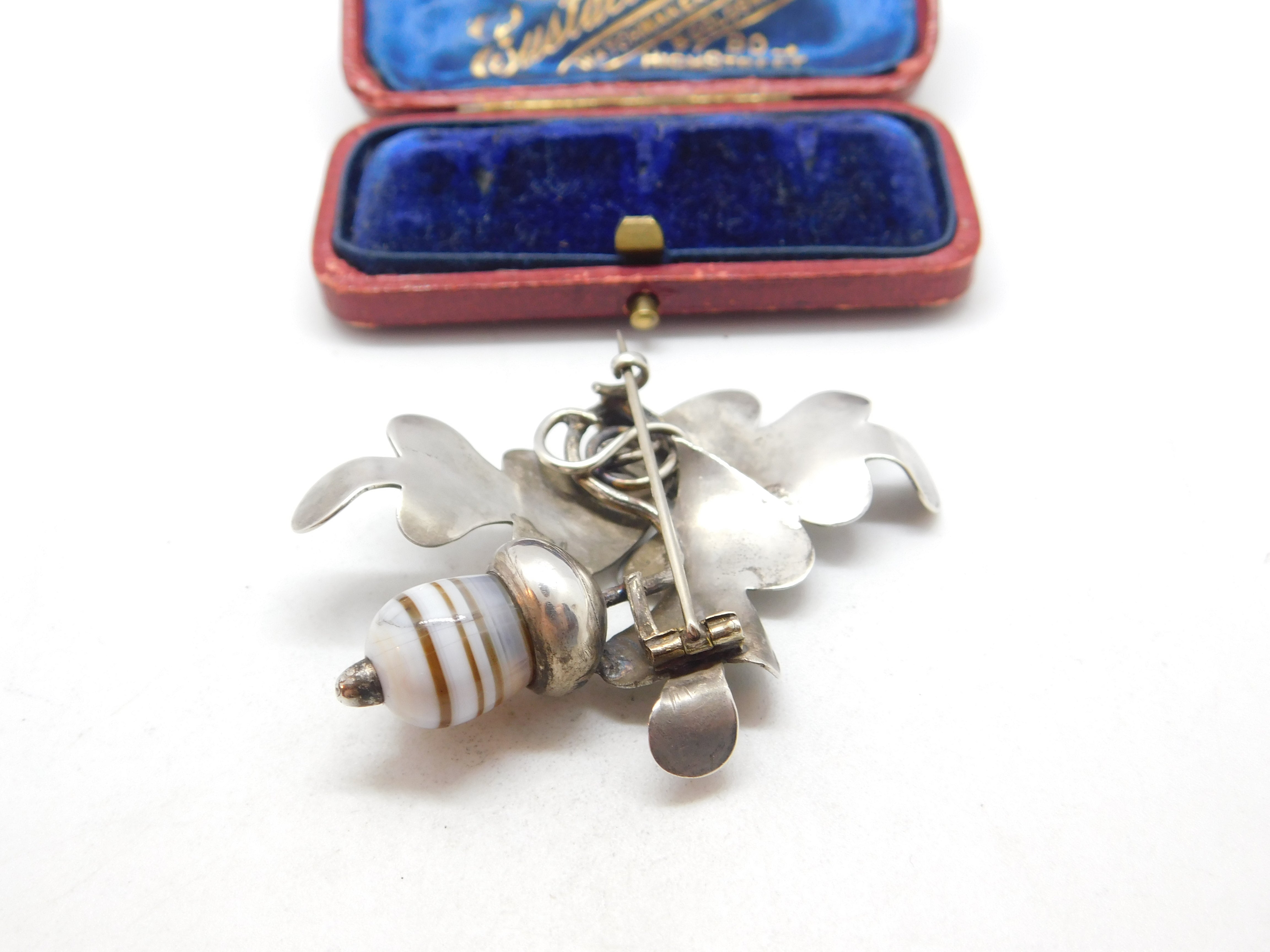 Scottish Victorian Sterling Silver Oak Leaf & Banded Agate Acorn Brooch c1860