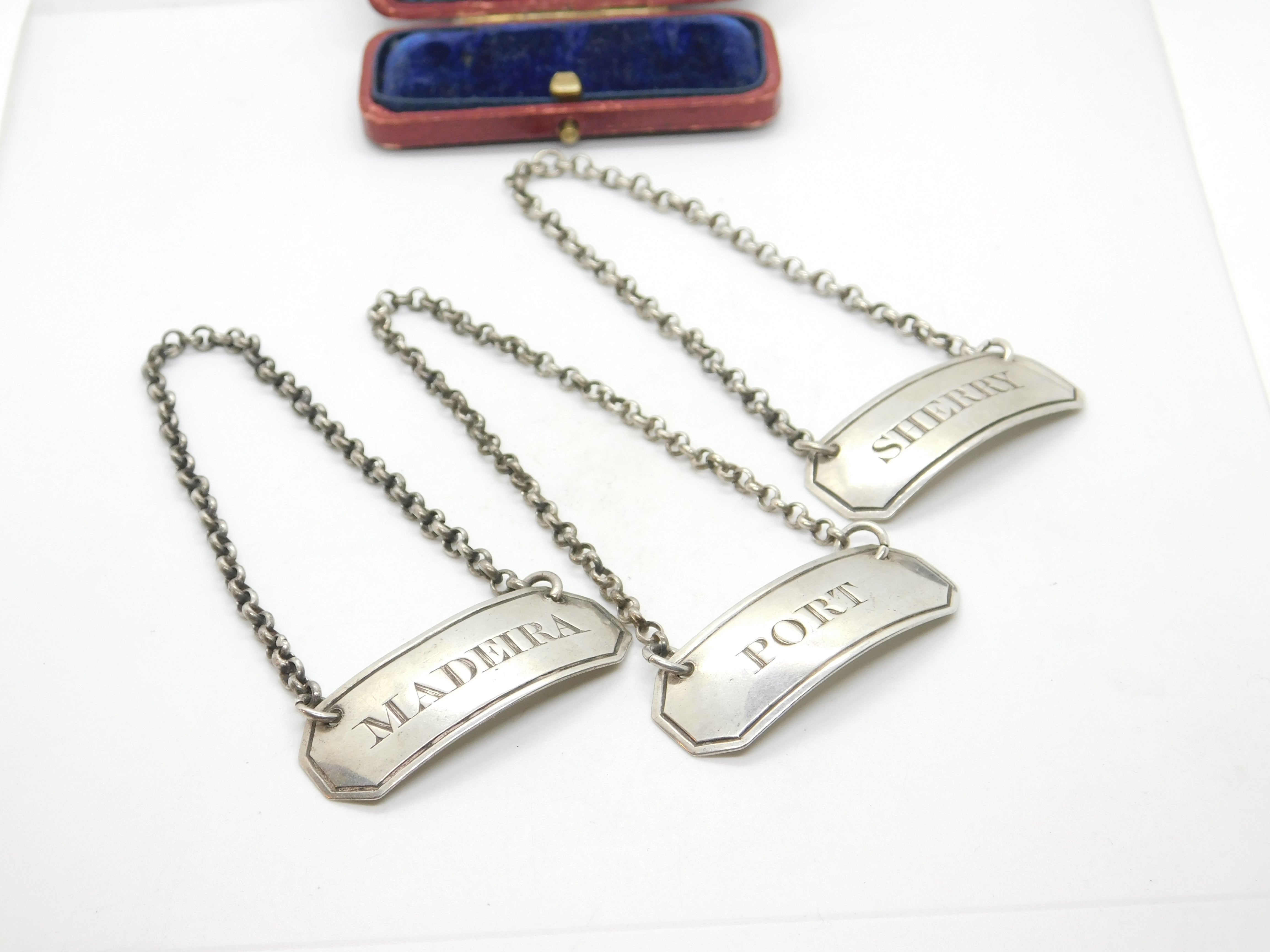 Details: A fantastic and wonderfully designed matched set of three Georgian George III sterling silver decanter labels for Port, Sherry & Madeira all hallmarked Birmingham 1807 to the reverse by Joseph Willmore. Very unusual to have a complete three piece set and all good condition. This is a wonderful item that would make a perfect gift or addition to any collection. The BOX pictured is for PRESENTATION ONLY and is NOT included in the listings but used to frame the pictures unless specifically stated otherwise.