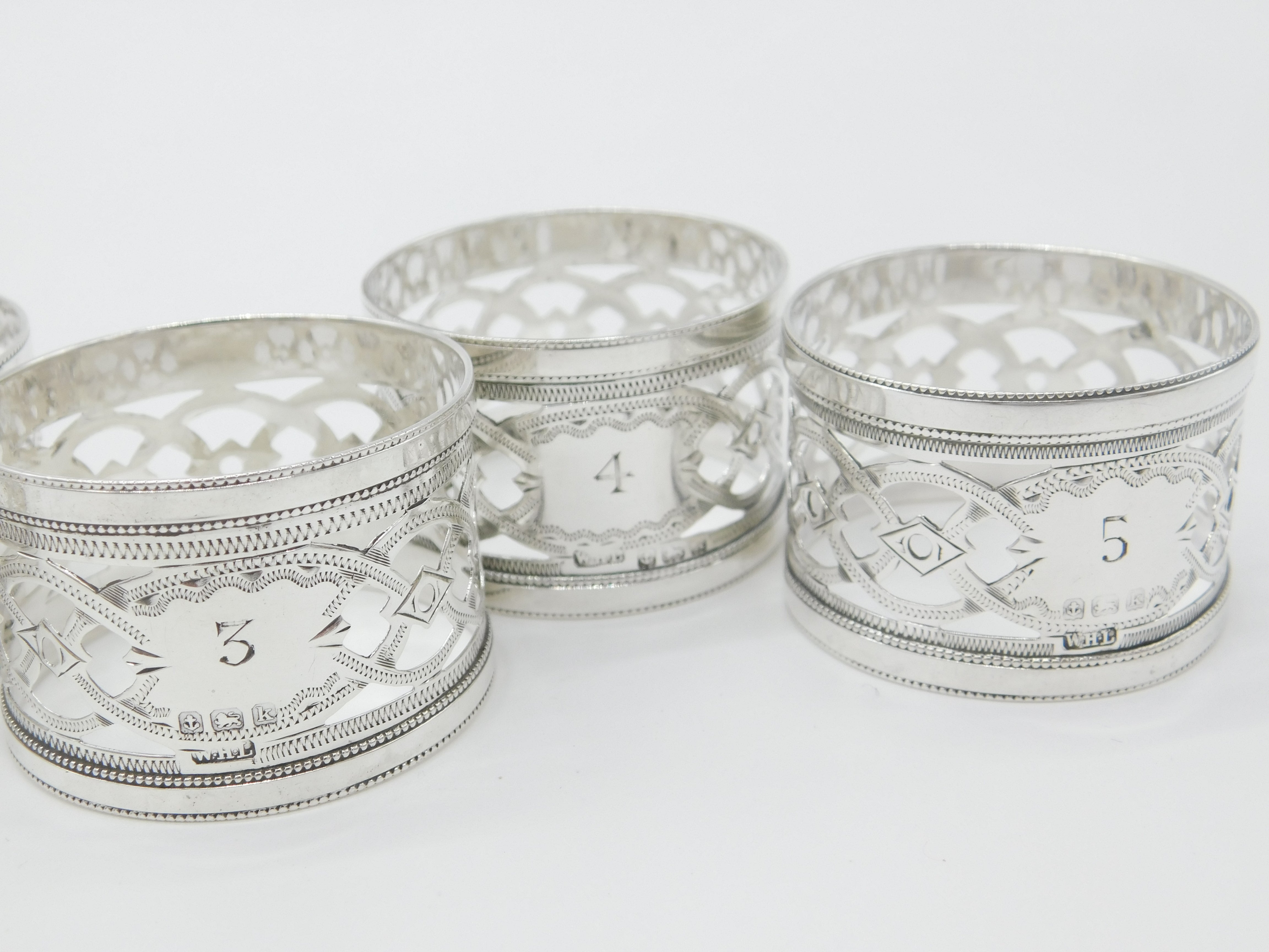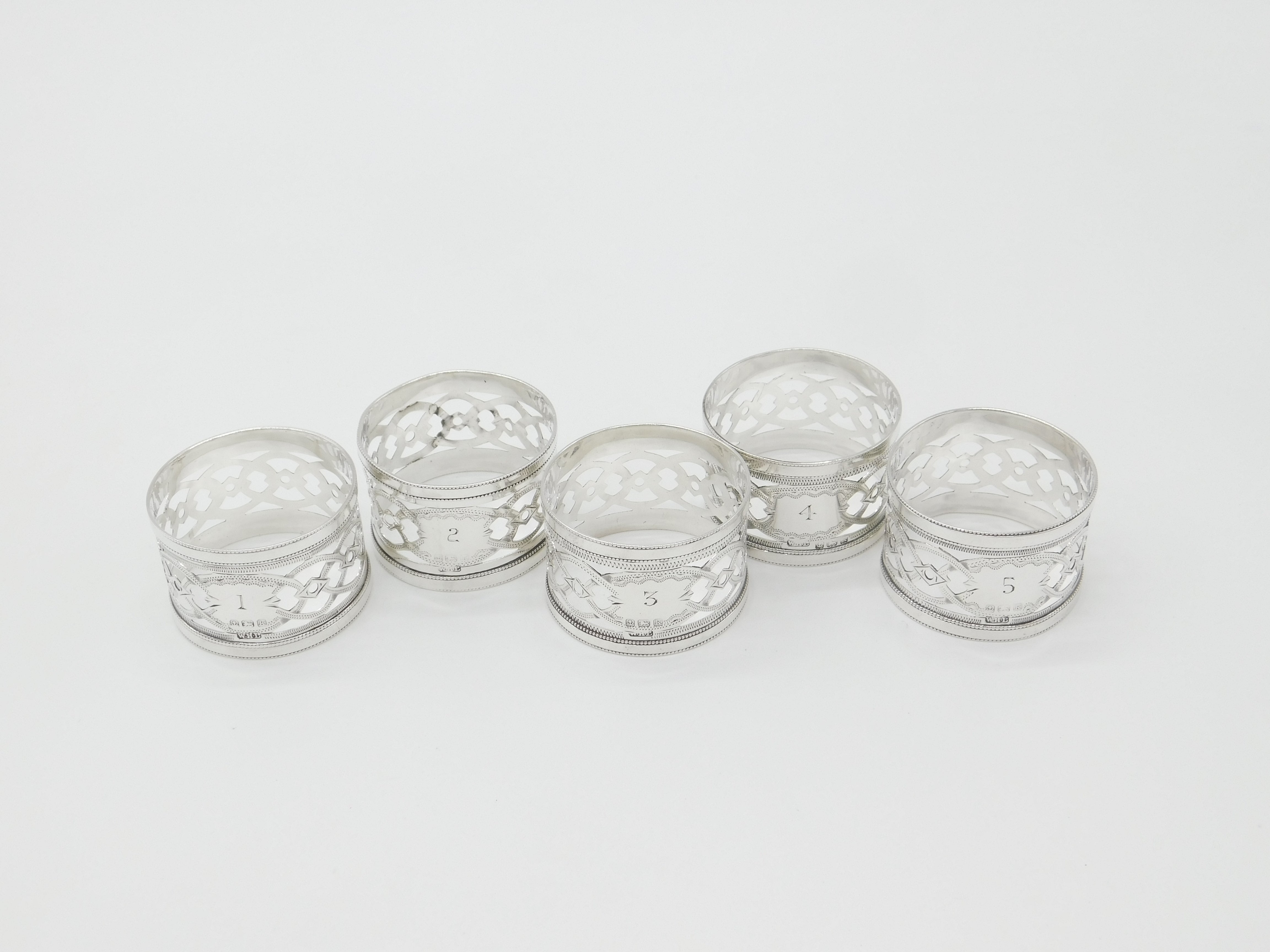 Details: A fantastic and wonderfully designed set of five antique Edwardian sterling silver pierced napkin rings numbered 1,2,3,4,5, hallmarked Birmingham 1909 by William Henry Leather. This is a wonderful item that would make a perfect gift or addition to any collection. The BOX pictured is for PRESENTATION ONLY and is NOT included in the listings but used to frame the pictures unless specifically stated otherwise.