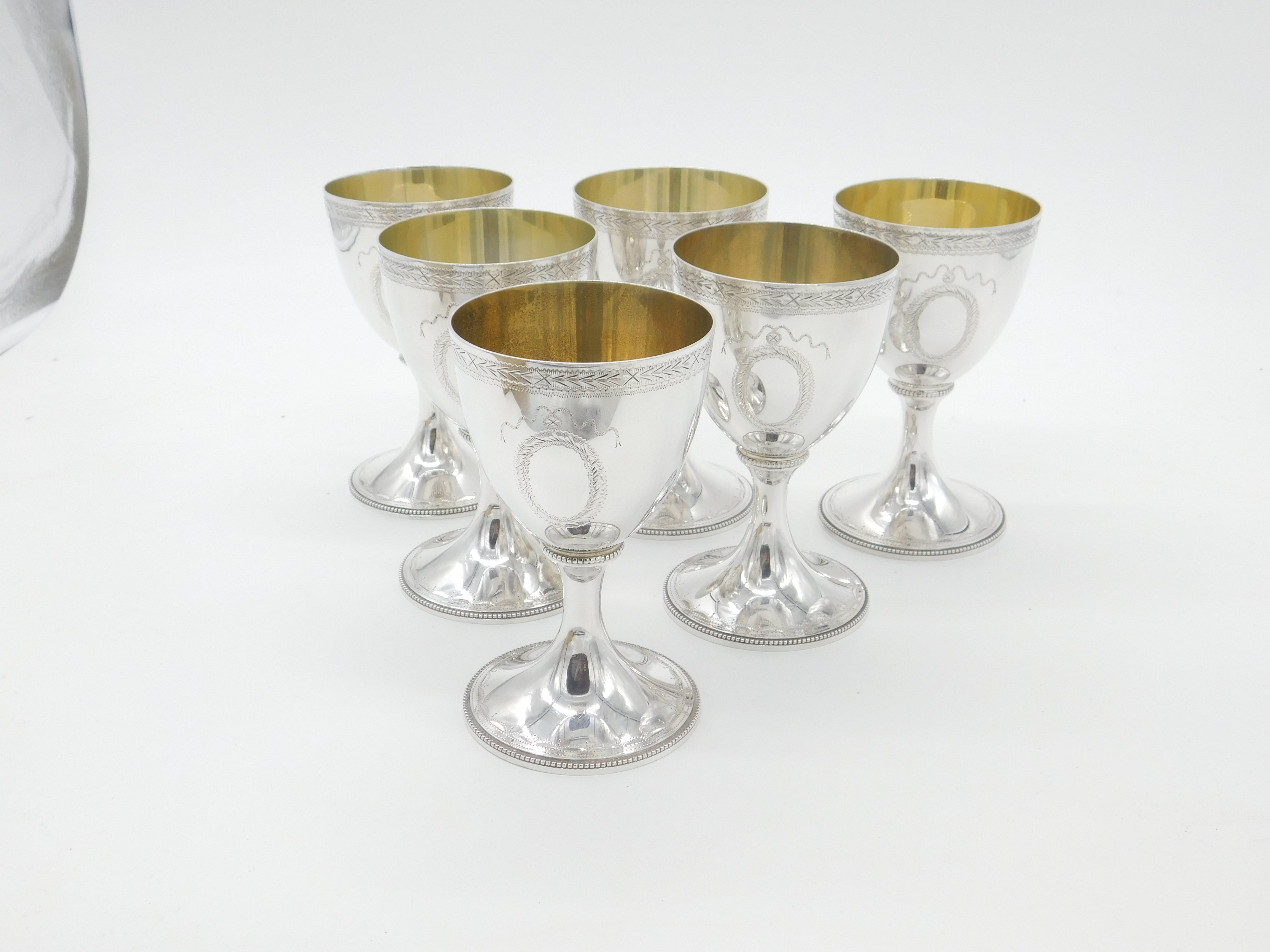 Details: A fantastic and wonderfully designed vintage set of six sterling silver wine goblets or chalices with stunning gilded interior and lovely floral cartouche each hallmarked to the base London 1968 by CJ Vander. These would make a stunning addition to any dining table. Great heavy guage and unusual to have a complete set. This is a wonderful item that would make a perfect gift or addition to any collection. The BOX pictured is for PRESENTATION ONLY and is NOT included in the listings but used to frame the pictures unless specifically stated otherwise.