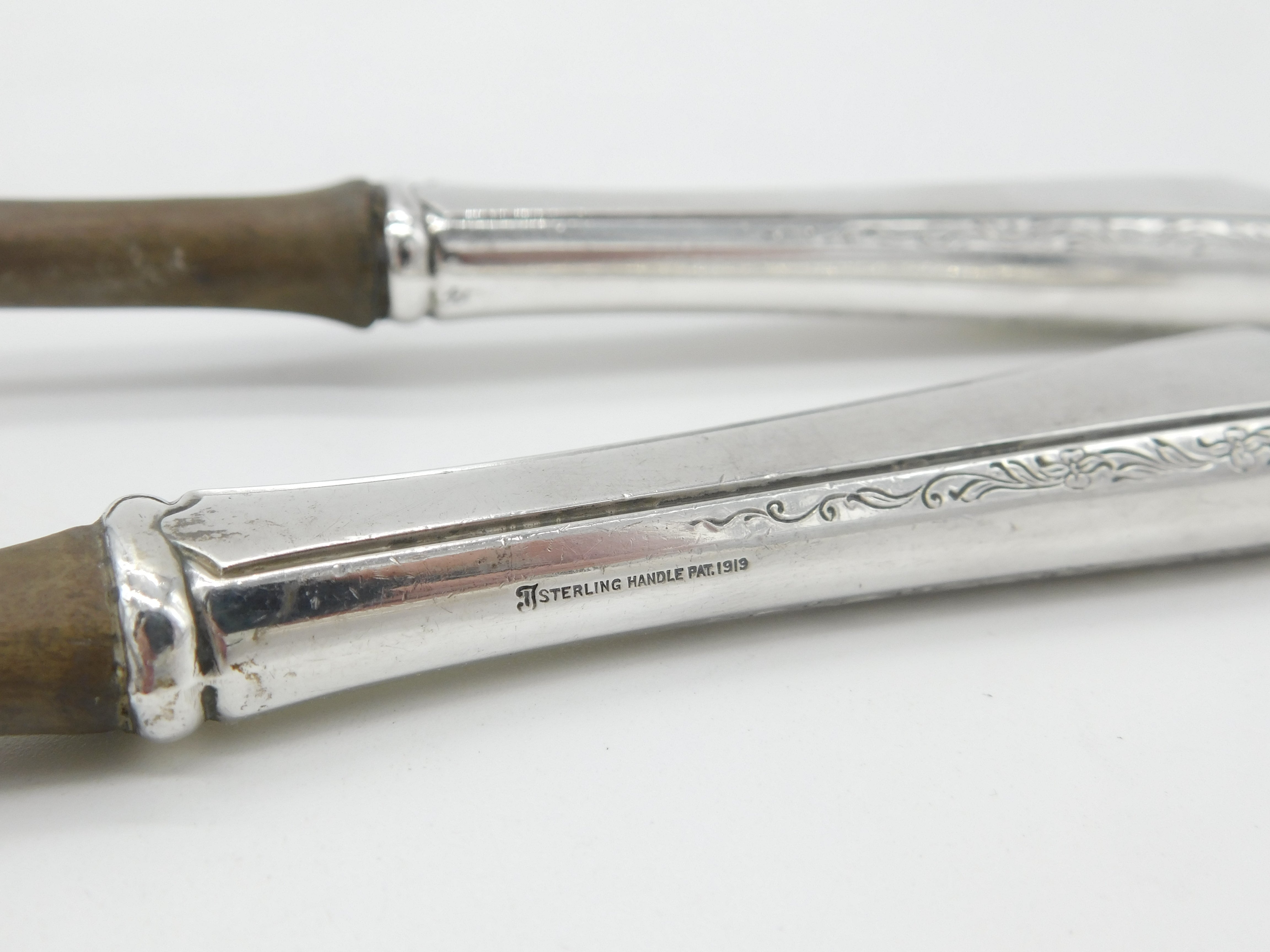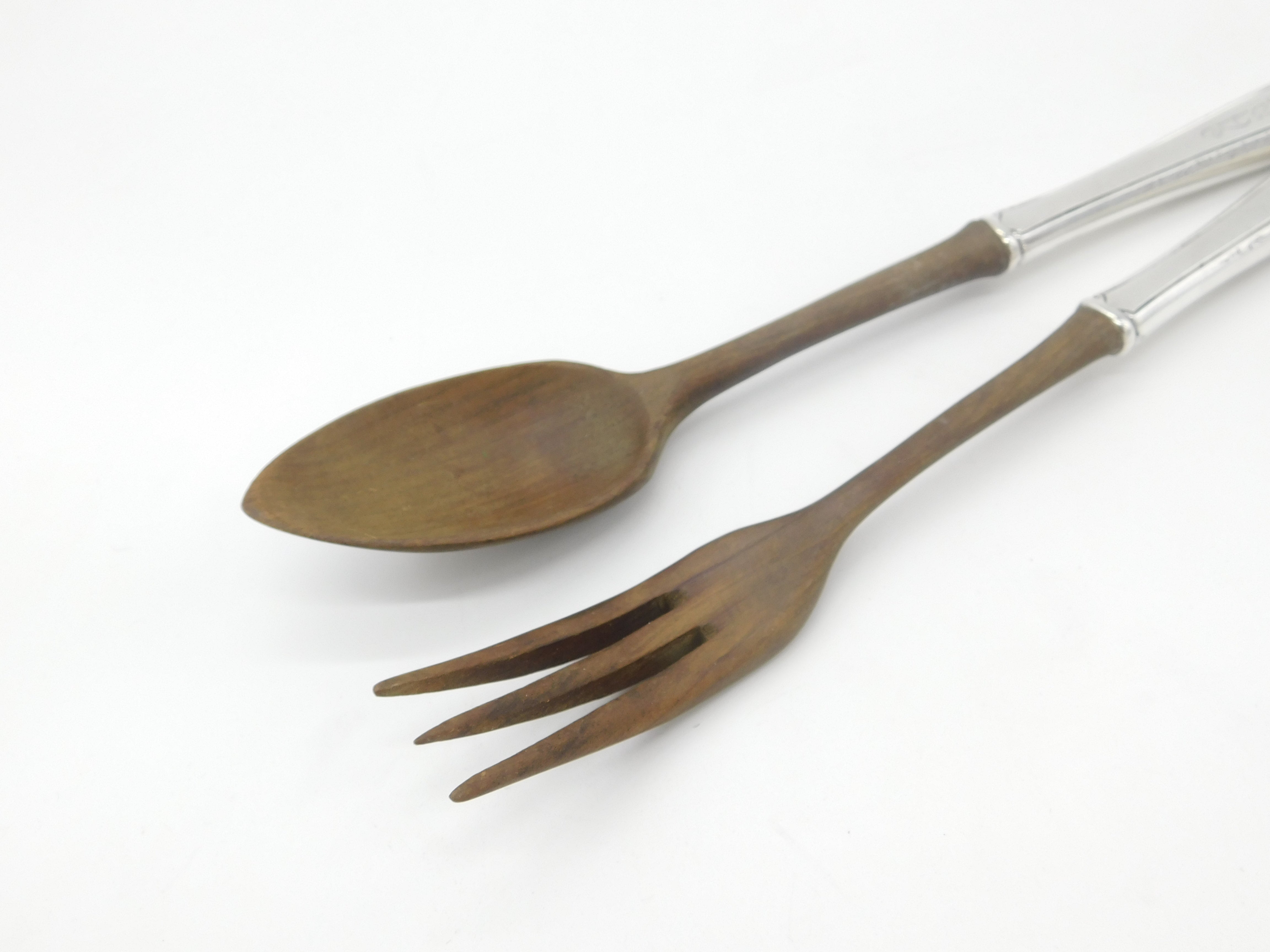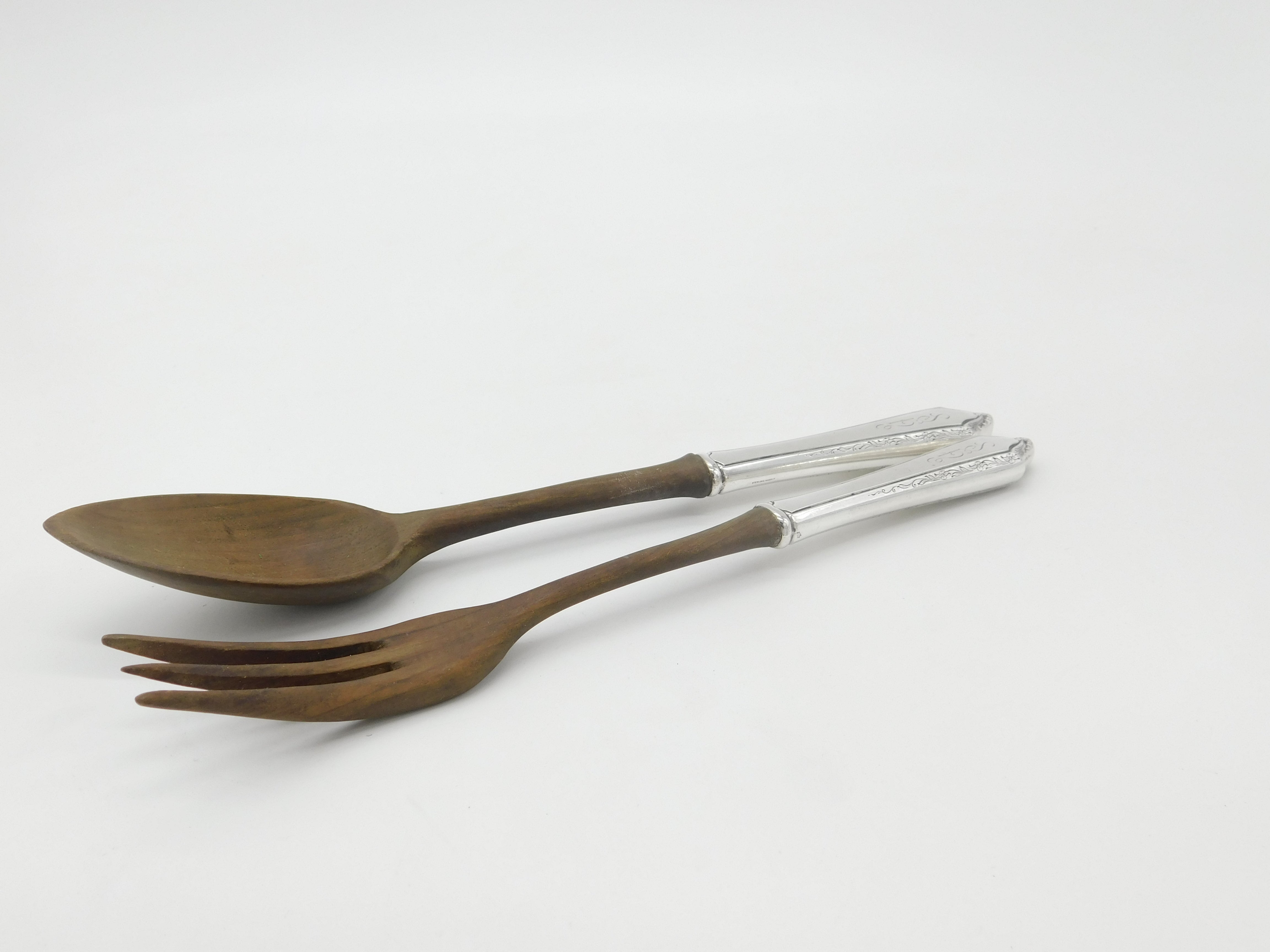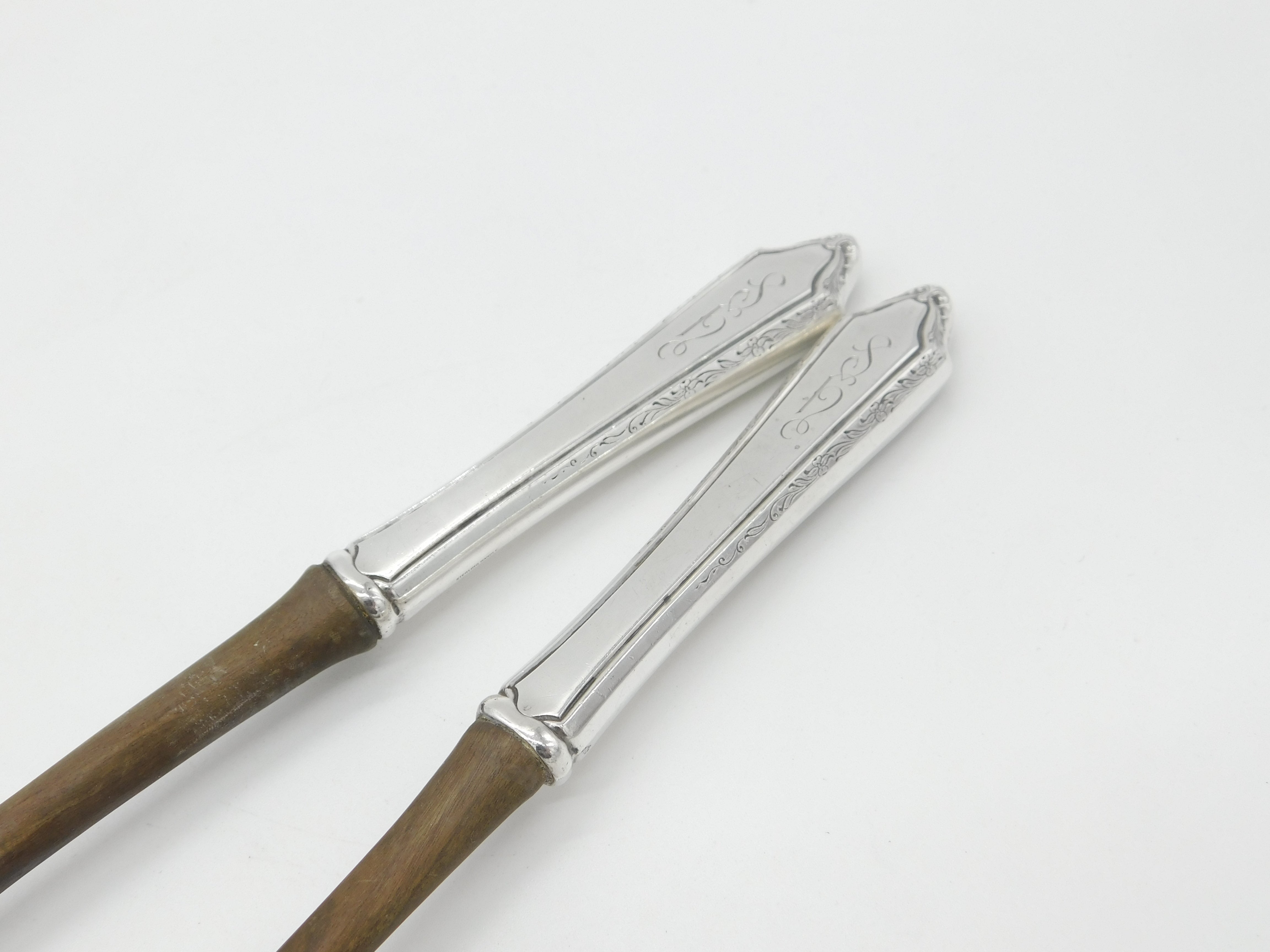 Set of Sterling Silver Handled & Olive Wood Salad Servers Antique c1920 Art Deco