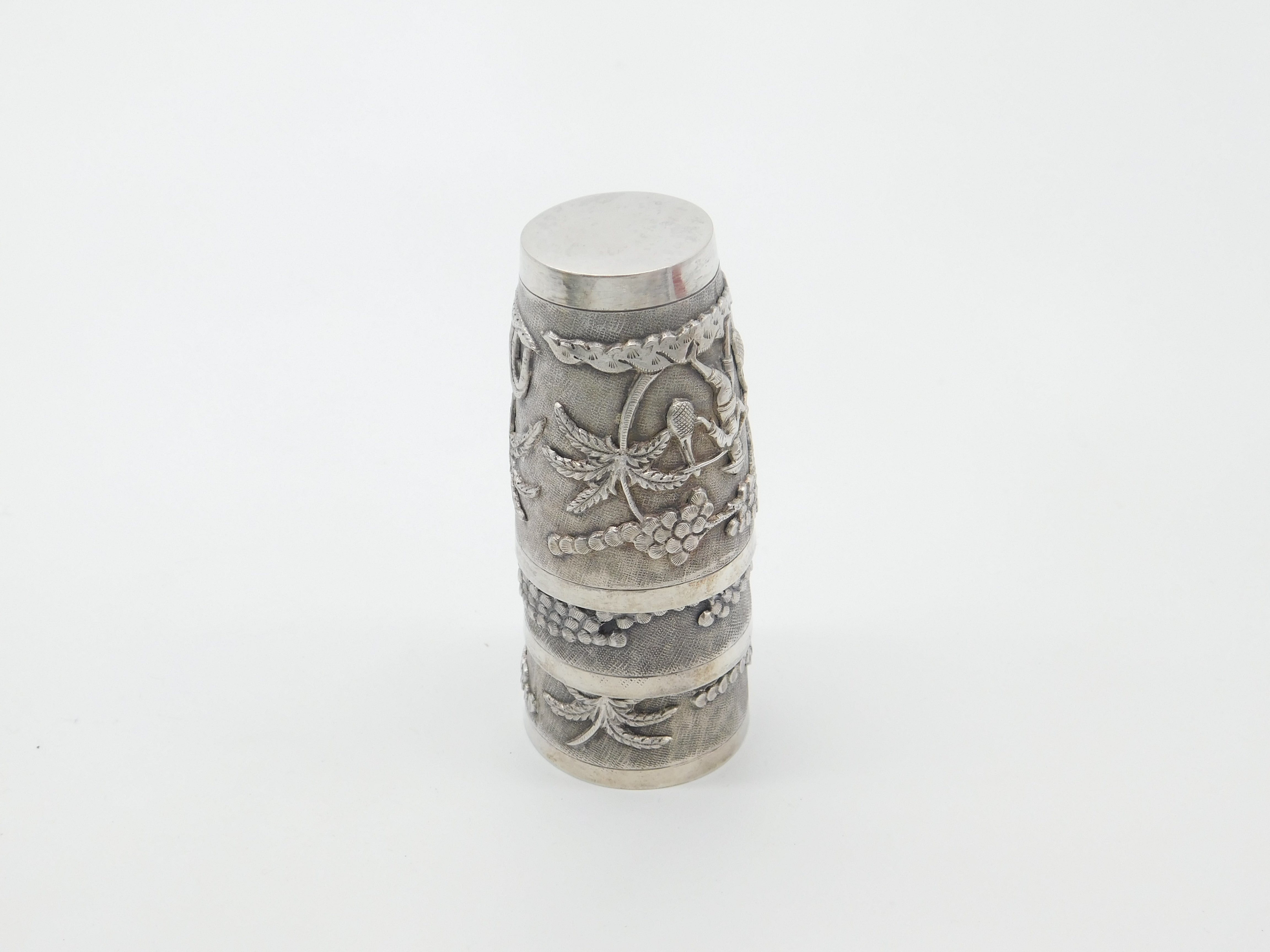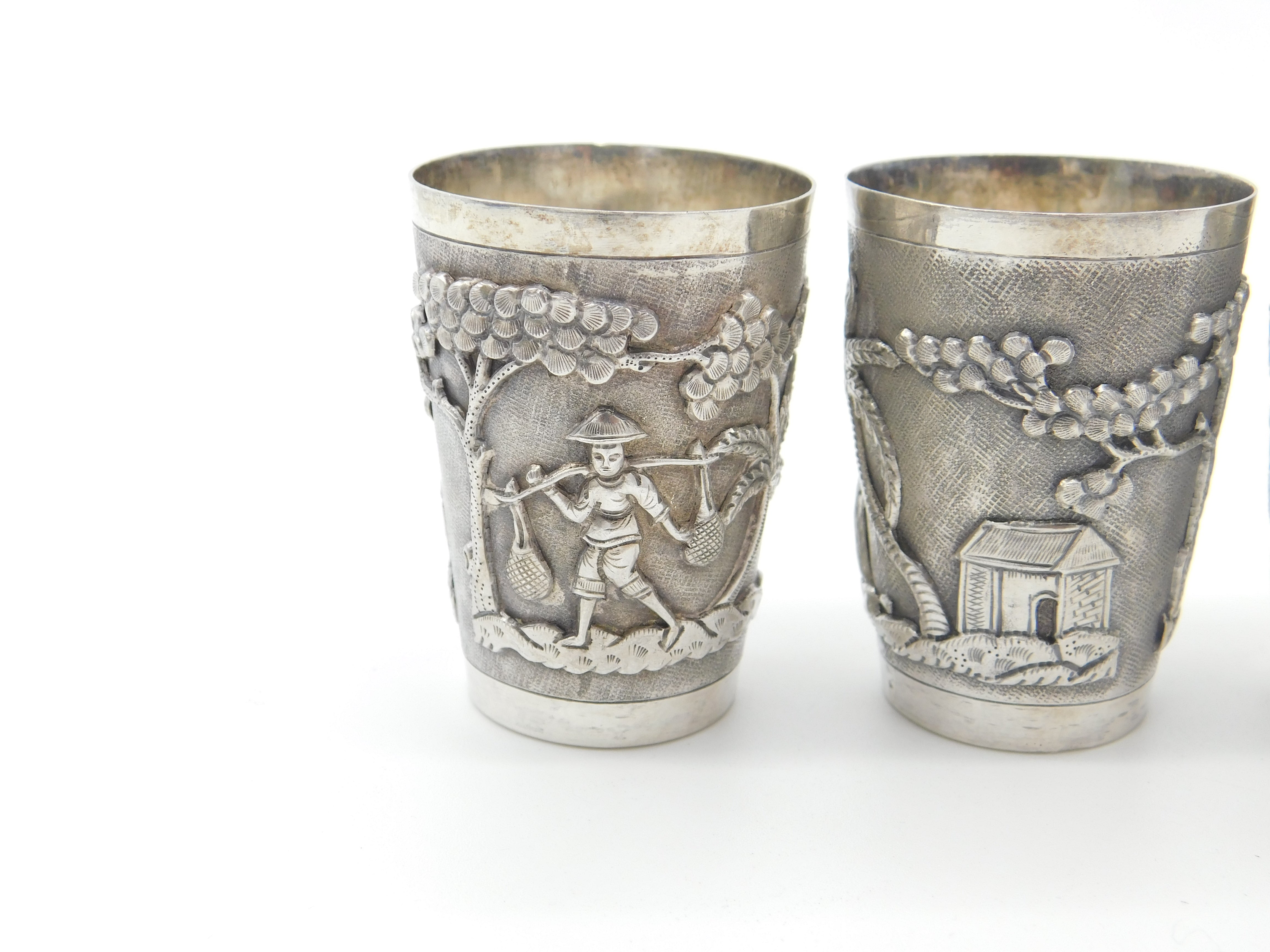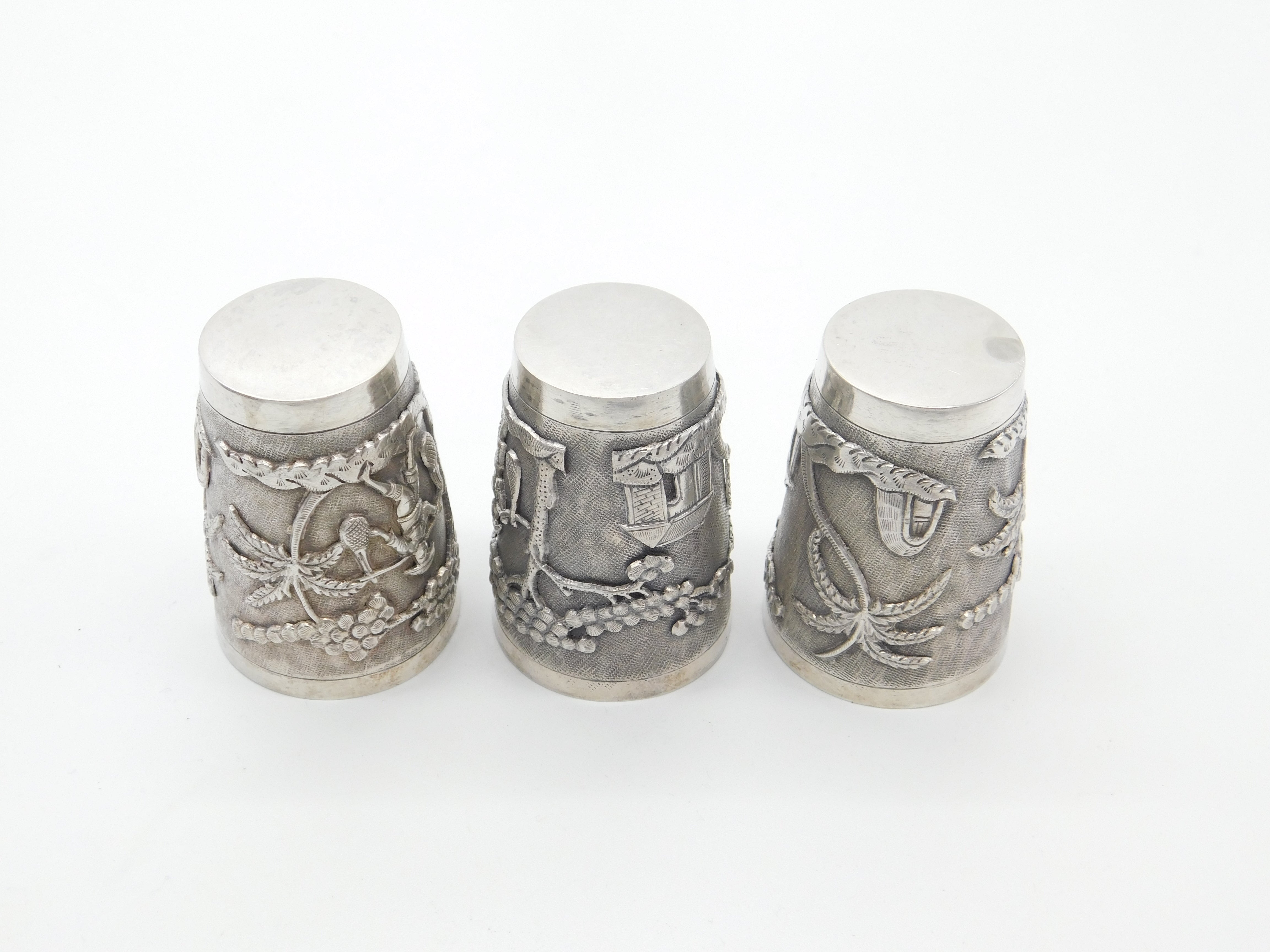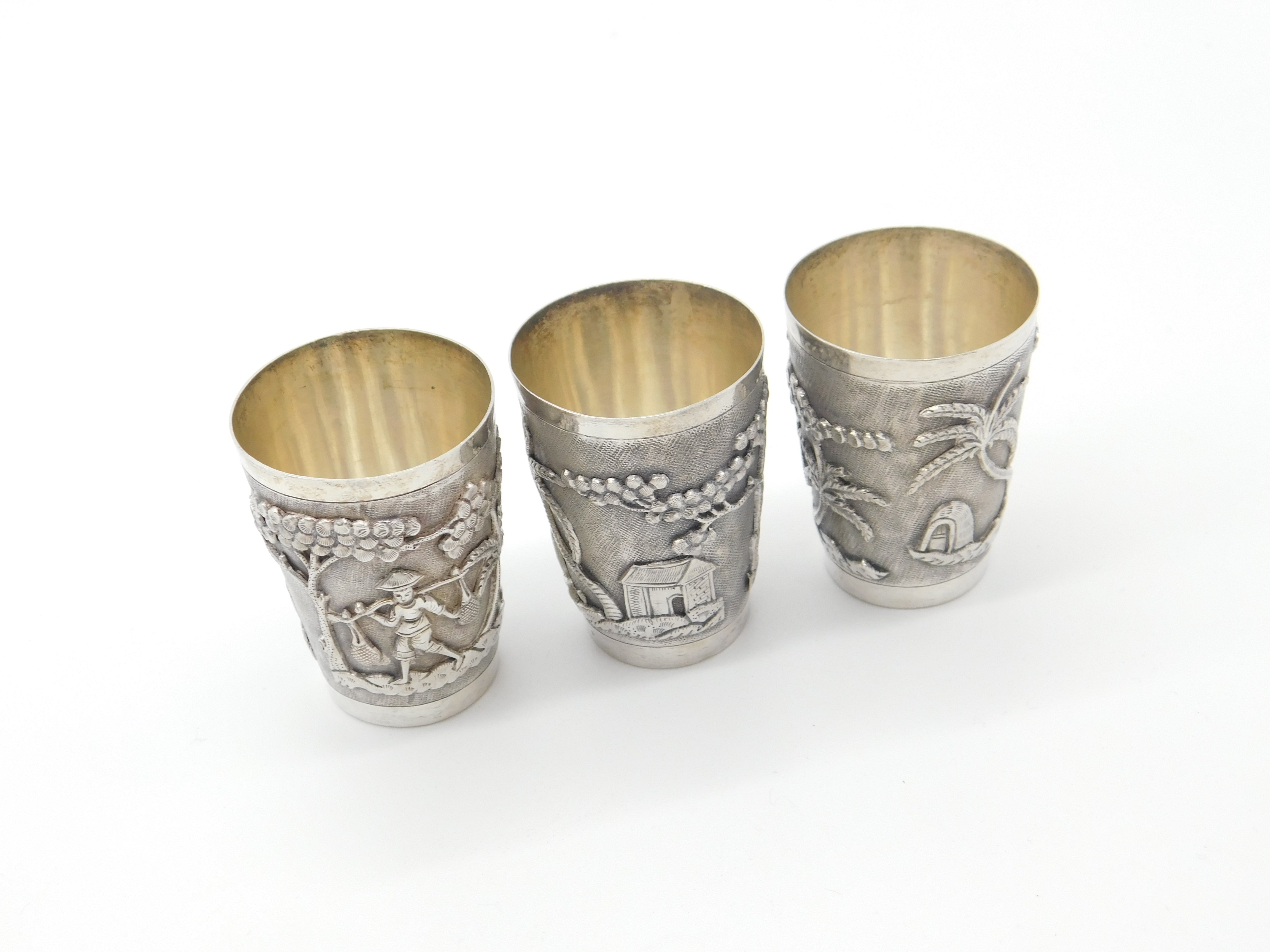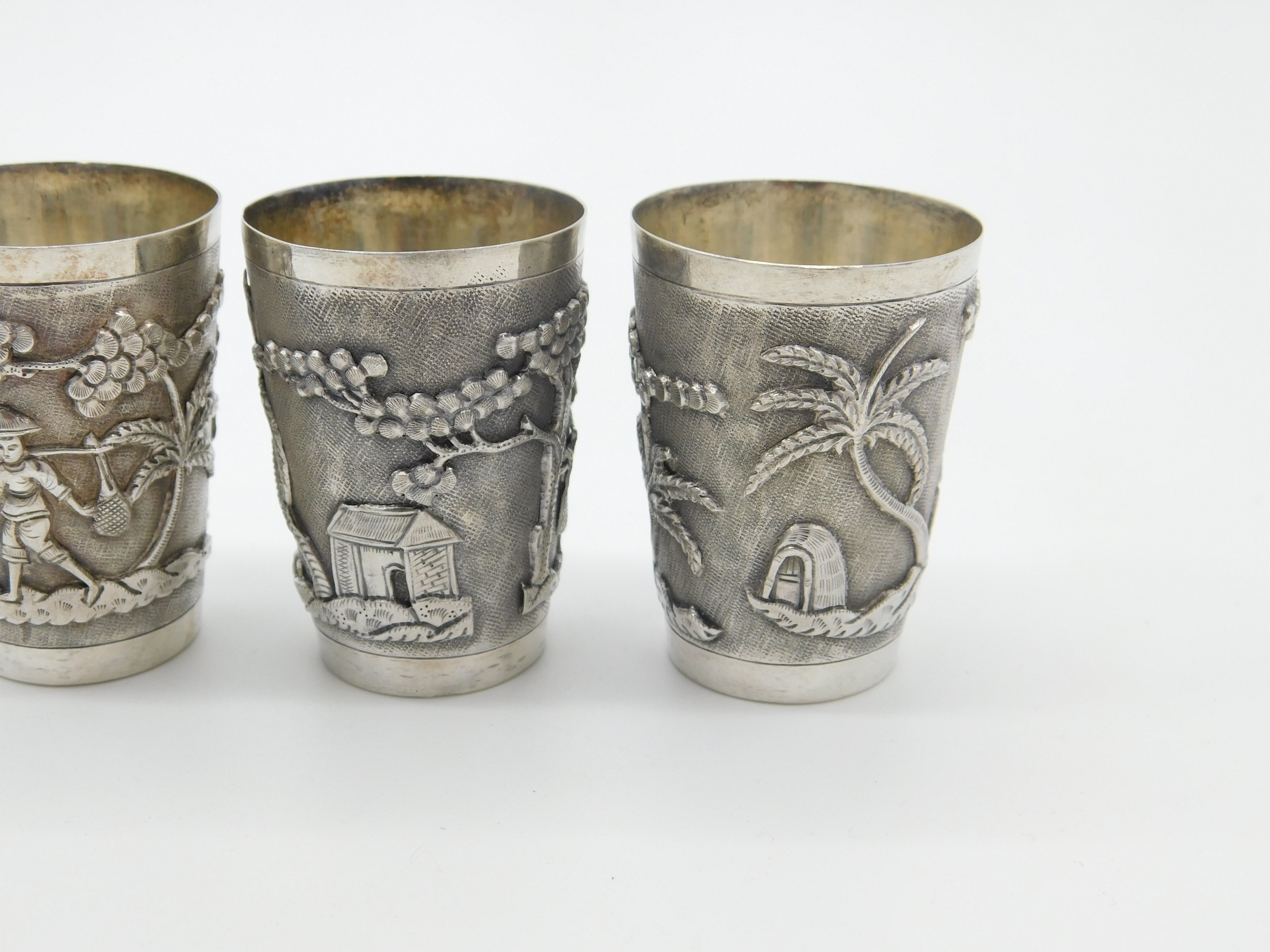 Set Of Three Sterling Silver Oriental Shot Cups Rural Scene Antique c1900