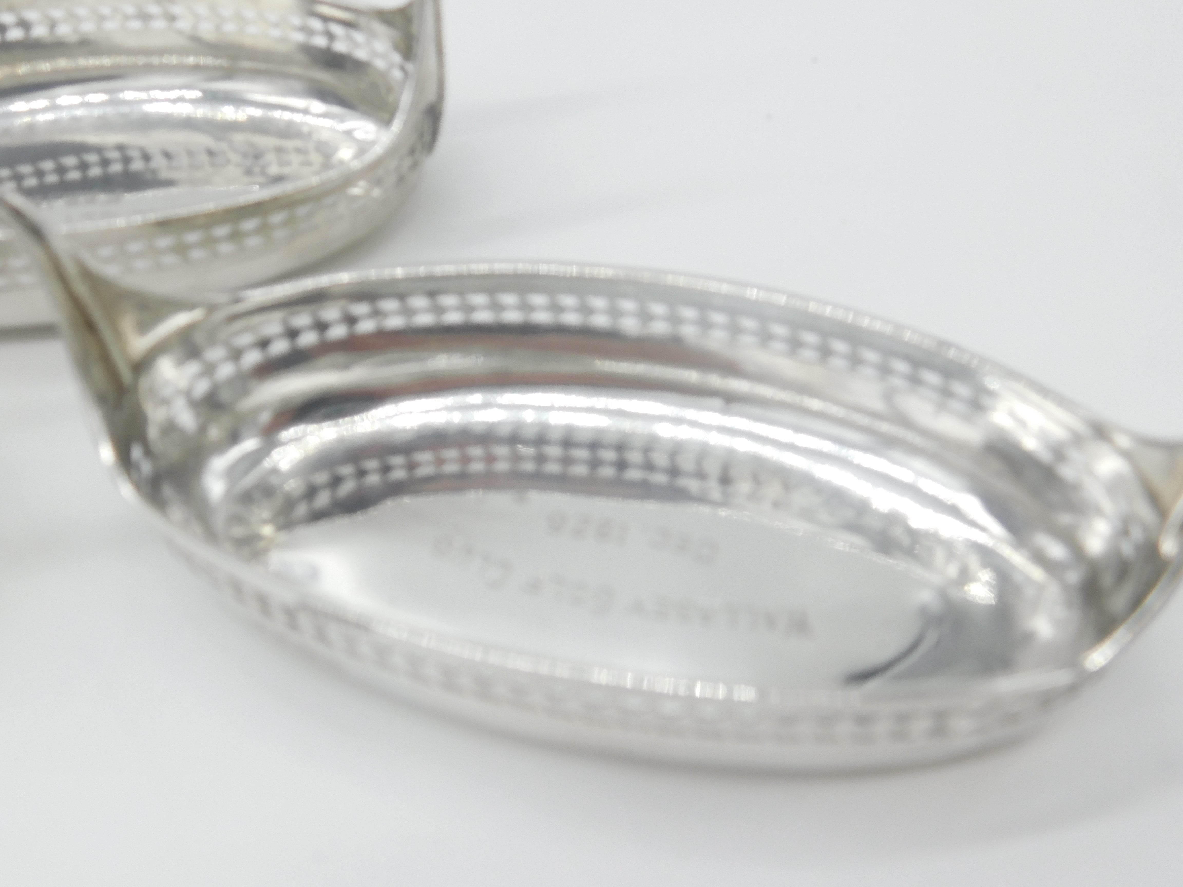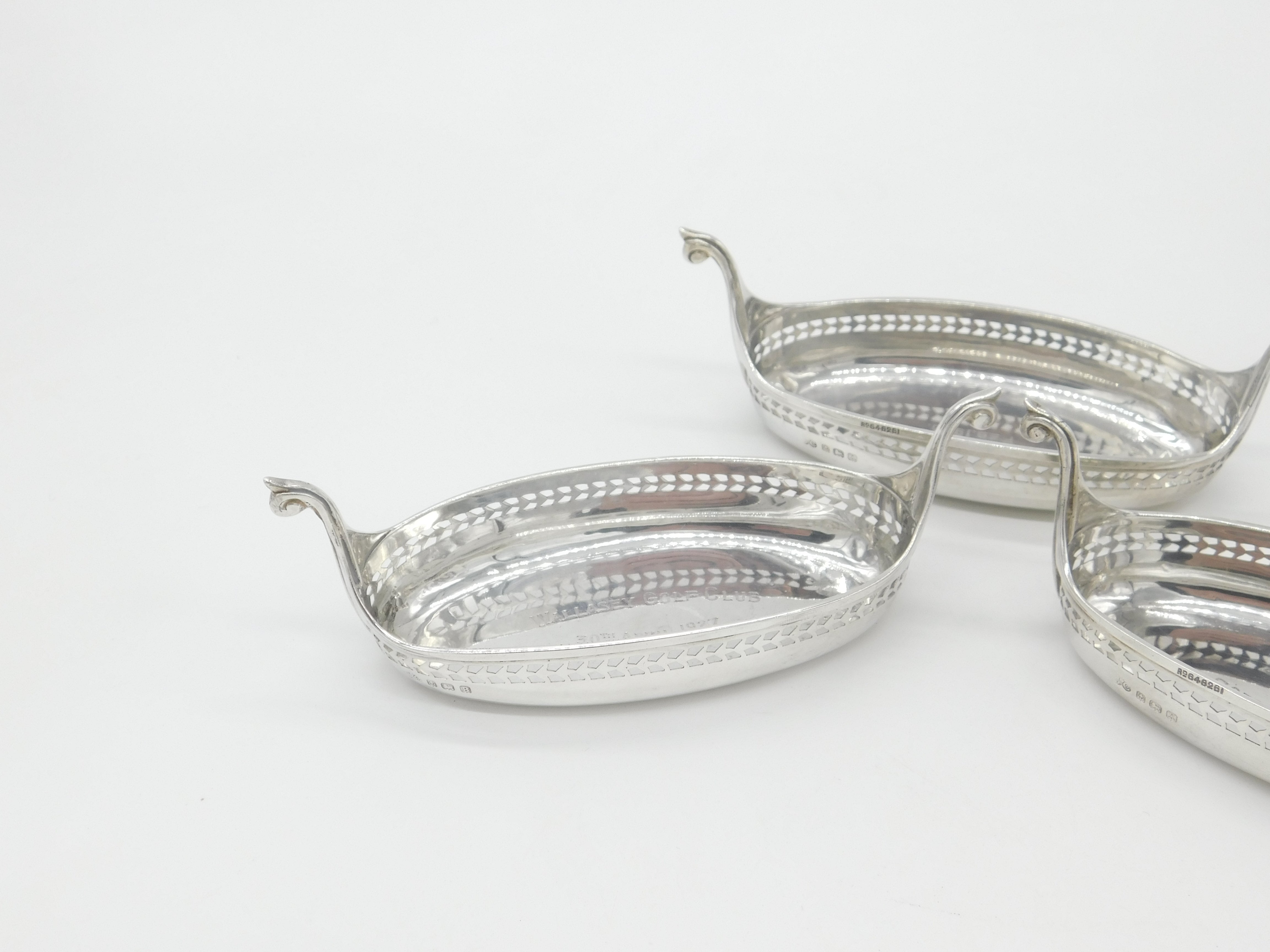 Details: A fantastic and wonderfully designed set of three antique sterling silver sweet treat dishes in the form of viking longboats with fun detailing hallmarked Birmingham each with different dates 1929 & 1922 all by Elkington & Co. The dishes are all engraved Wallasey Golf Club to the bottom please note and were almost certainly given as trophies. This is a wonderful item that would make a perfect gift or addition to any collection. The BOX pictured is for PRESENTATION ONLY and is NOT included in the listings but used to frame the pictures unless specifically stated otherwise.