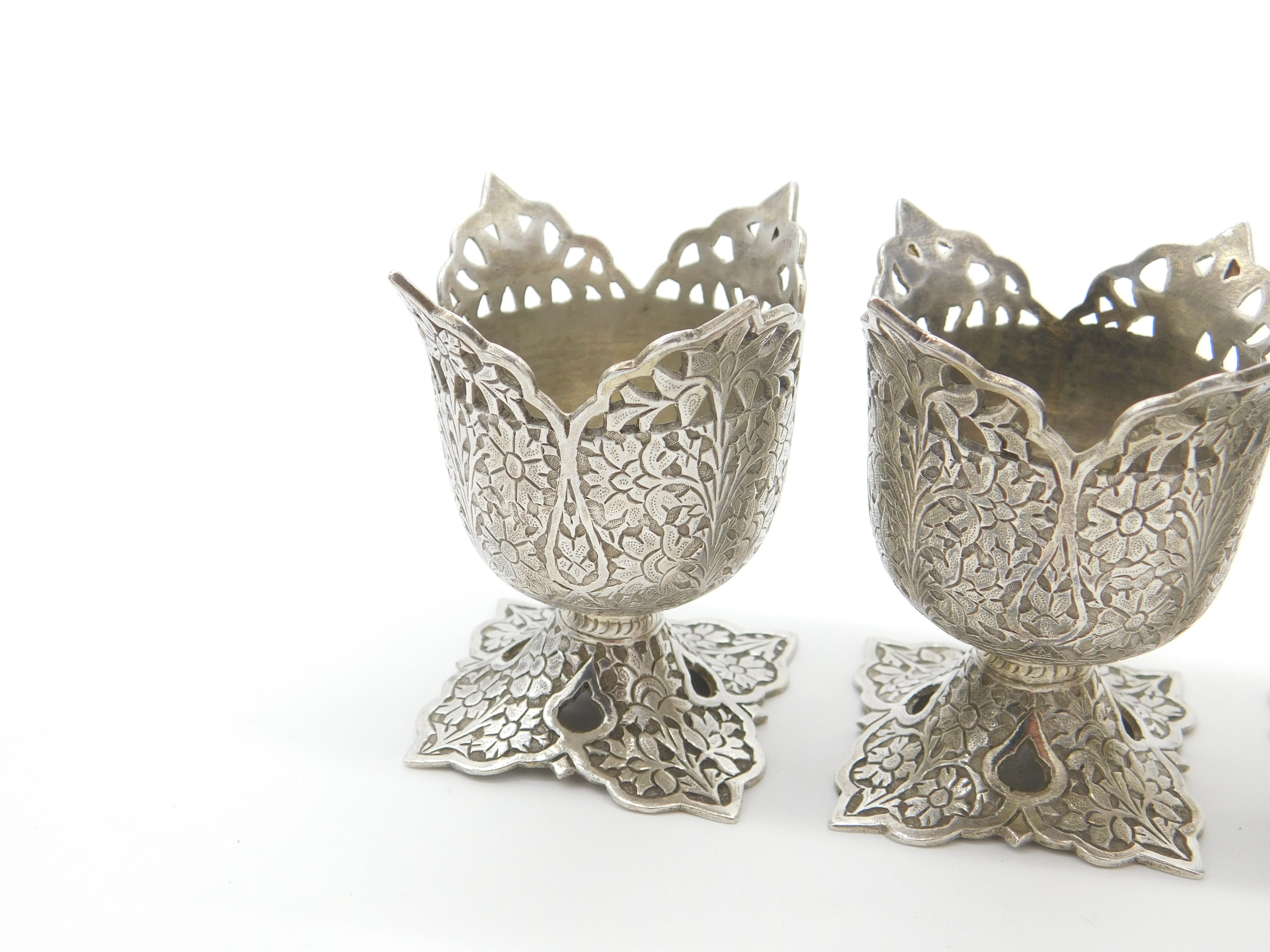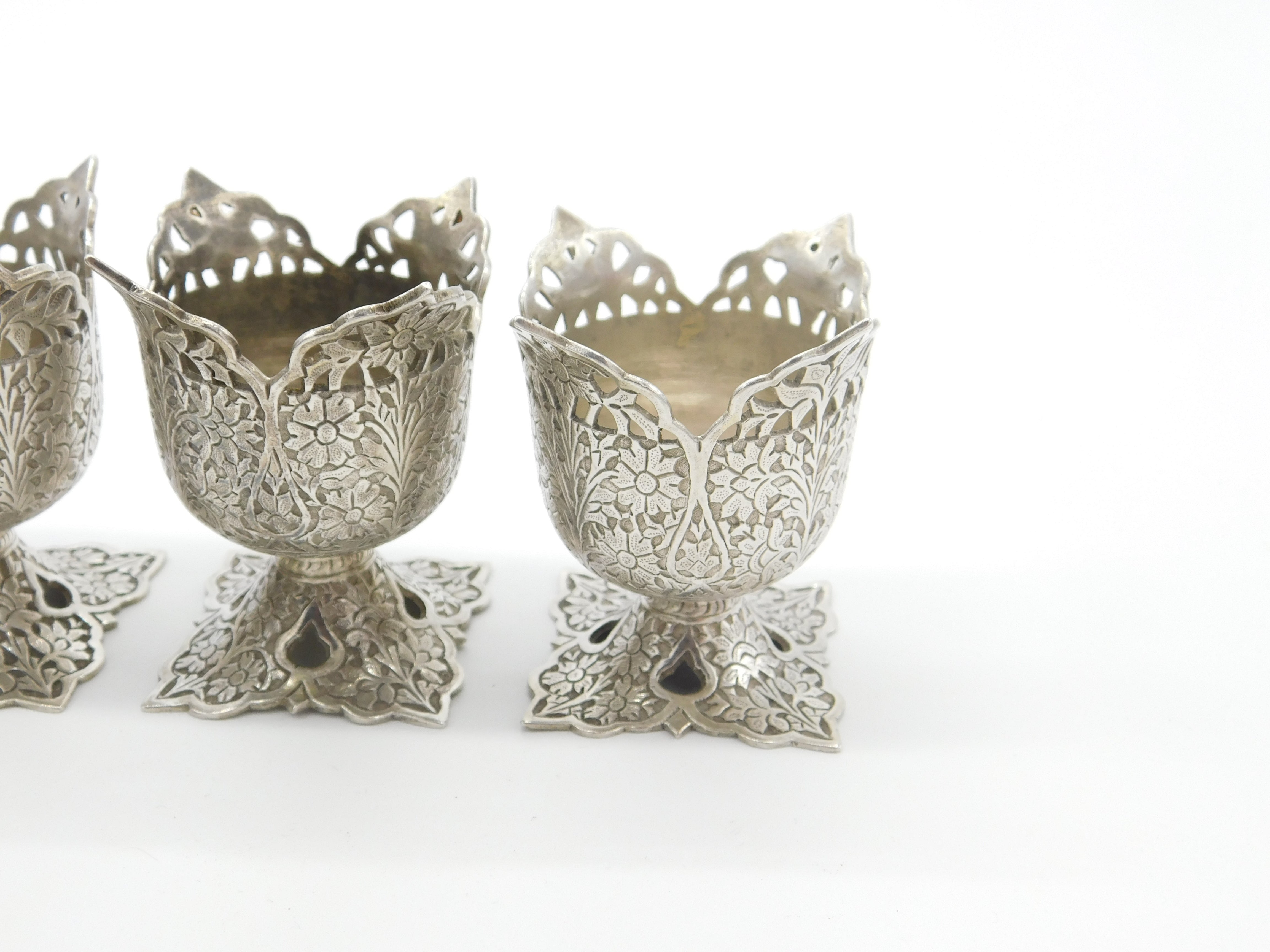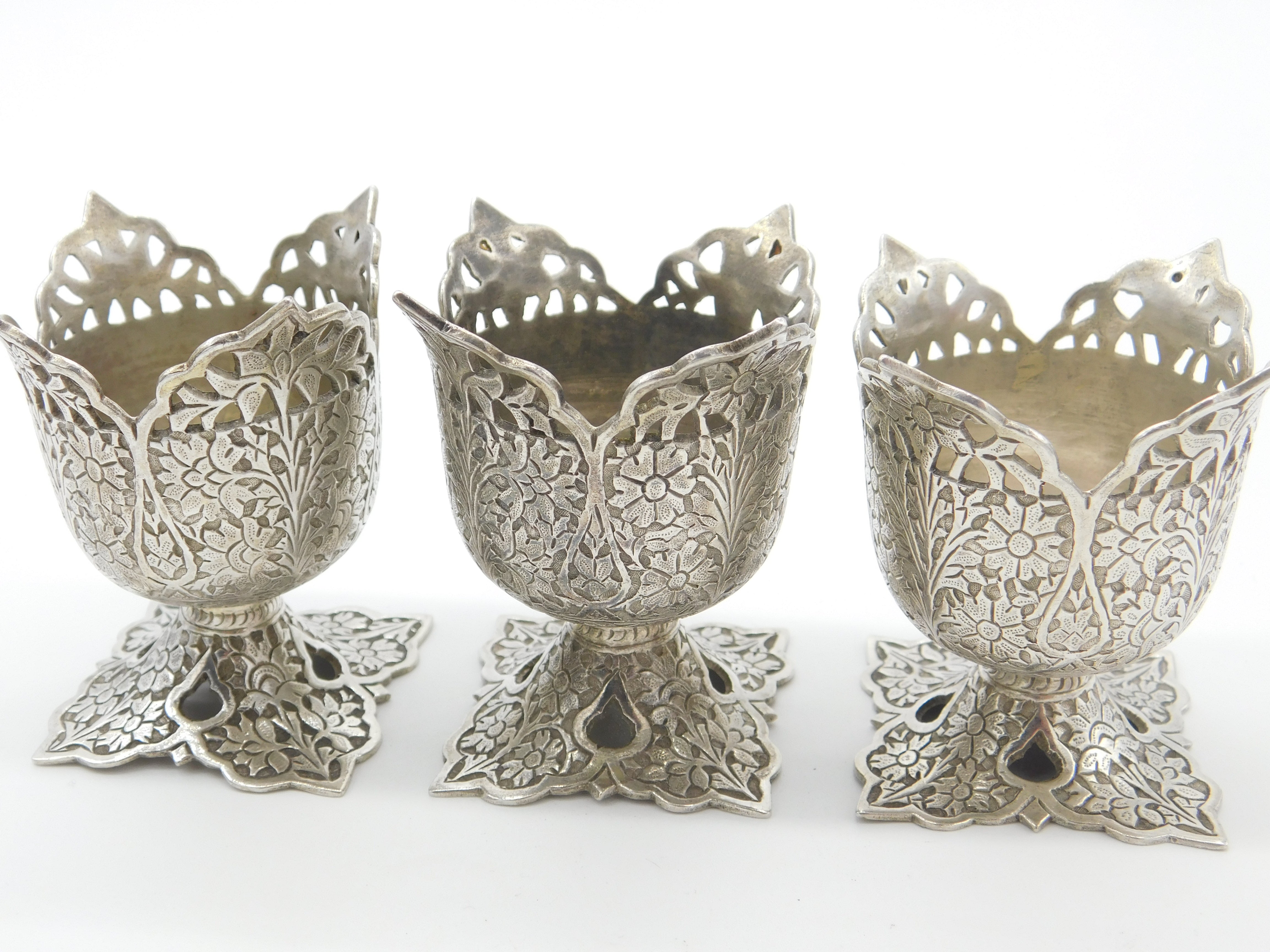 Details: A fantastic and wonderfully designed set of three antique Victorian sterling silver anglo-Indian egg cups with lovely floral patterns throughout c1900. The silver has been XRF tested. This is a wonderful item that would make a perfect gift or addition to any collection. The BOX pictured is for PRESENTATION ONLY and is NOT included in the listings but used to frame the pictures unless specifically stated otherwise.