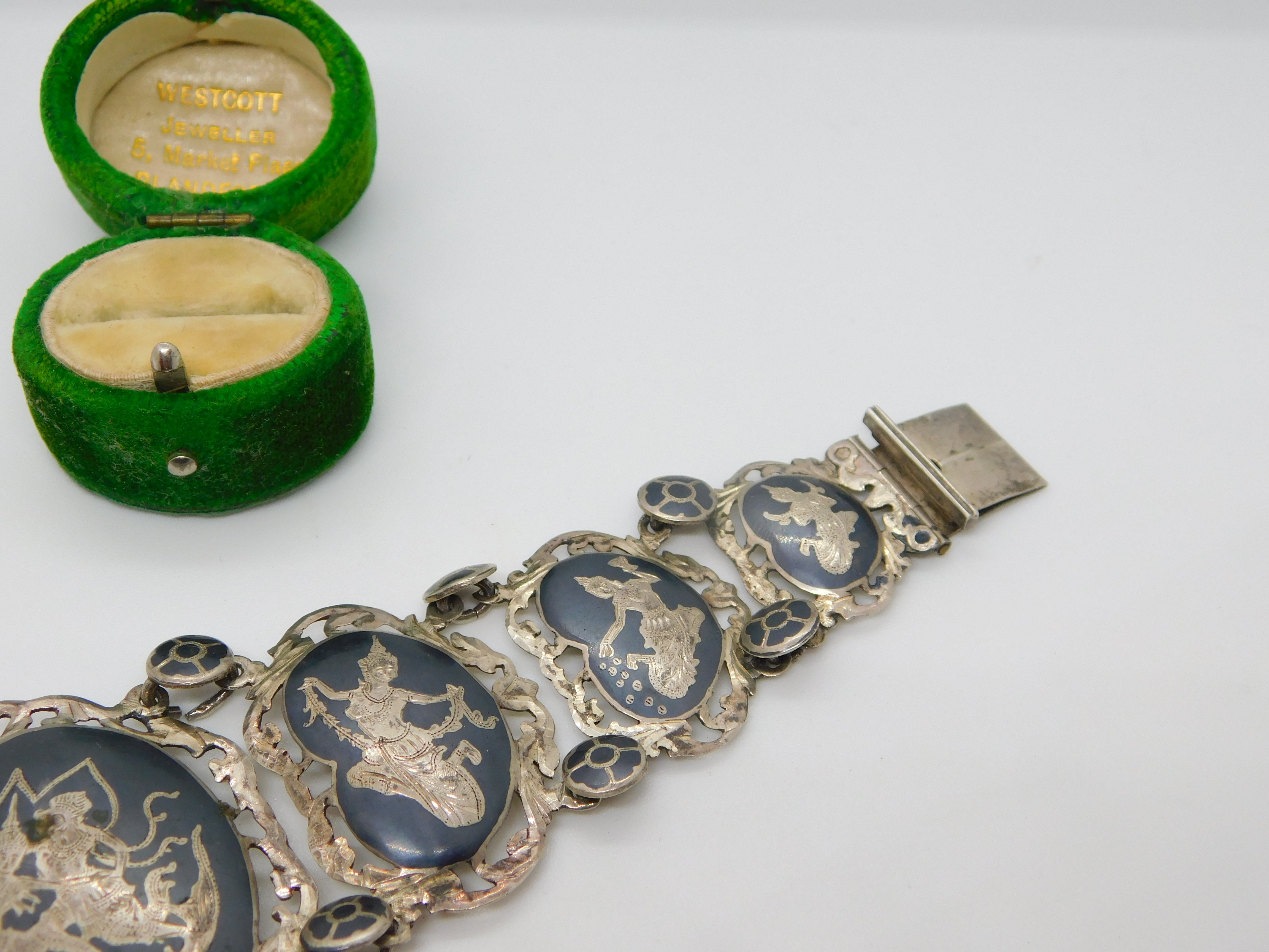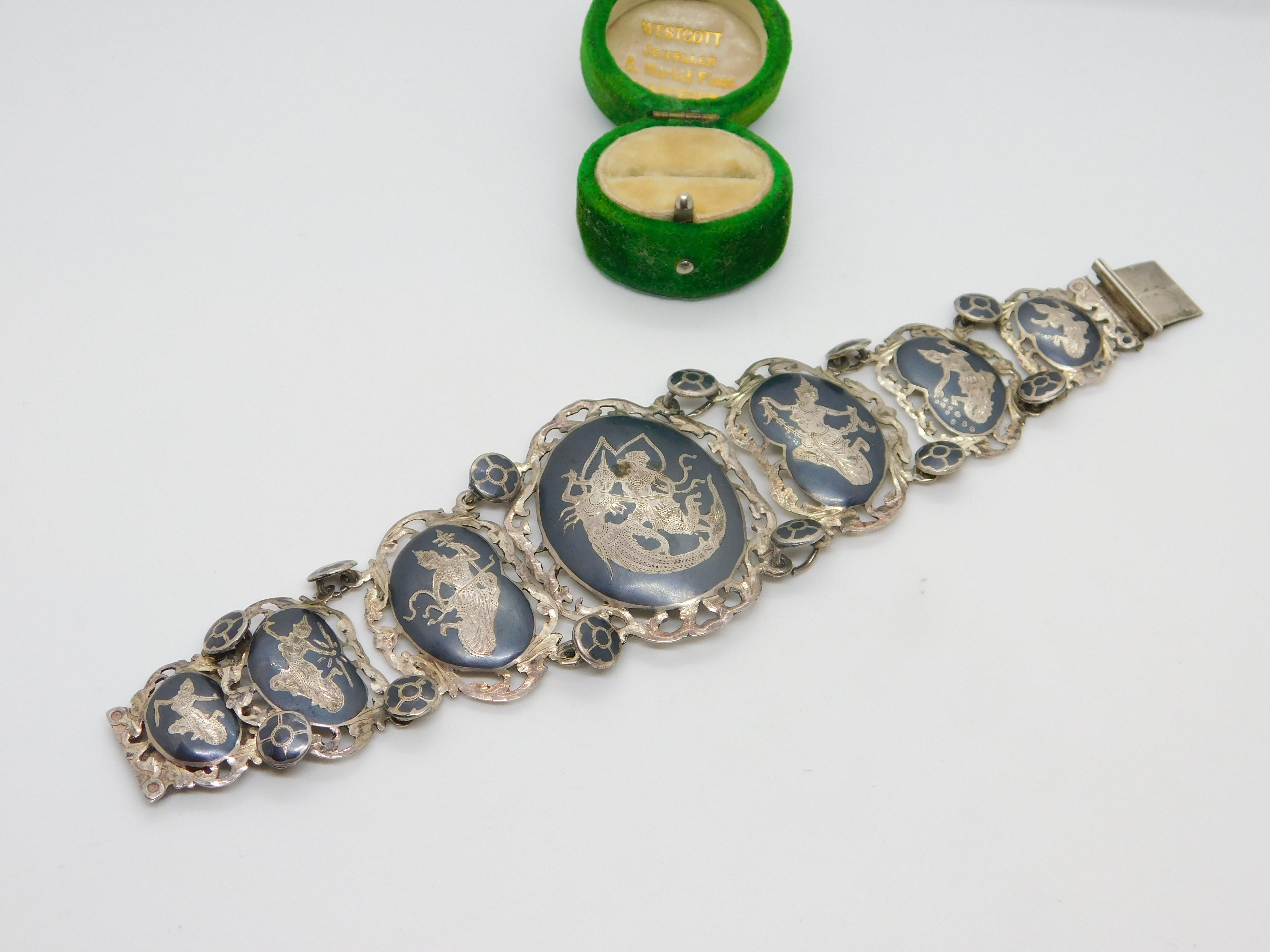 Details: A fantastic and wonderfully designed antique art deco Siam sterling silver black niello enamel dancing goddess bracelet with charming detailing hallmarked c1930. This is a wonderful item that would make a perfect gift or addition to any collection. The BOX pictured is for PRESENTATION ONLY and is NOT included in the listings but used to frame the pictures unless specifically stated otherwise.