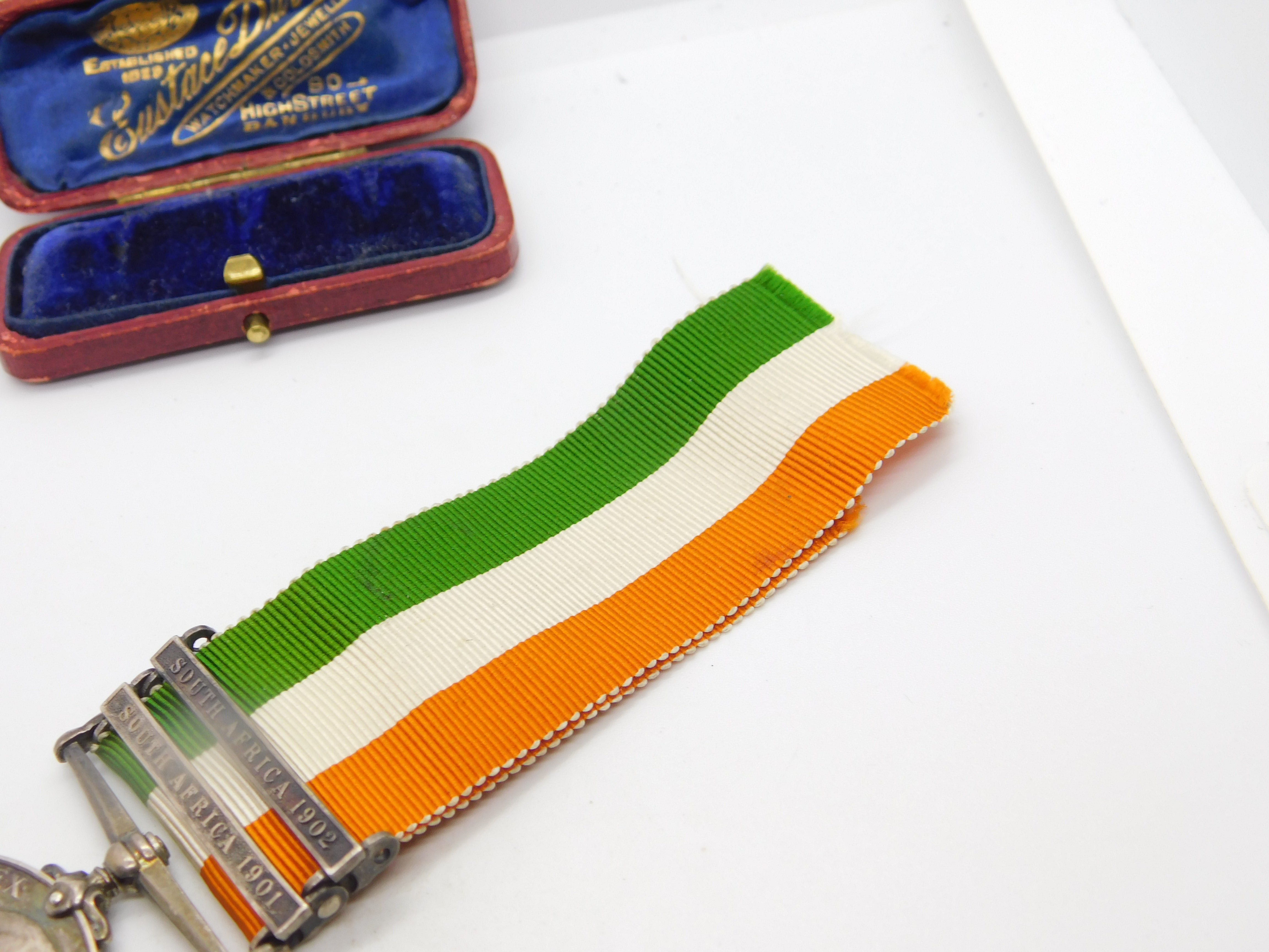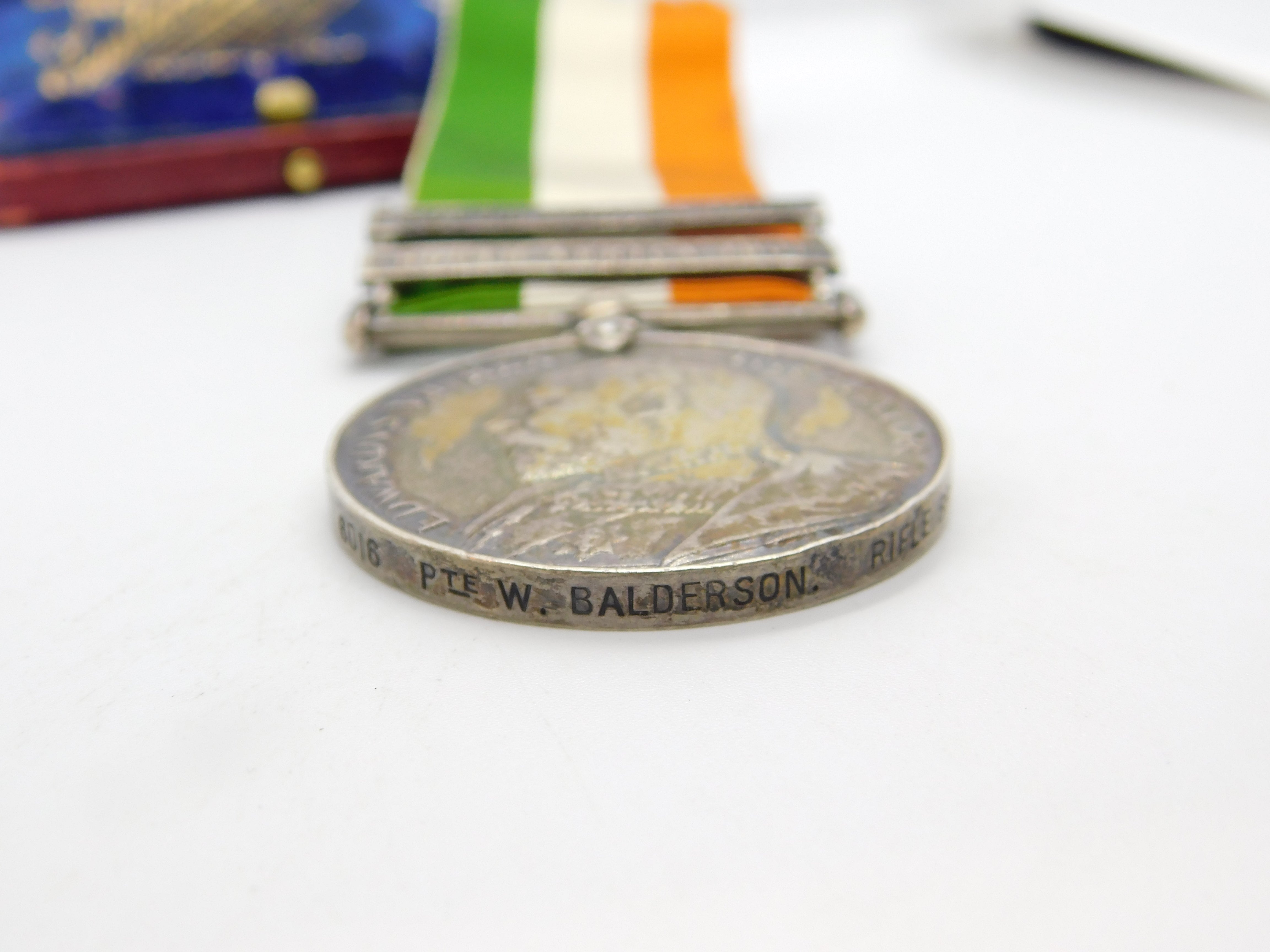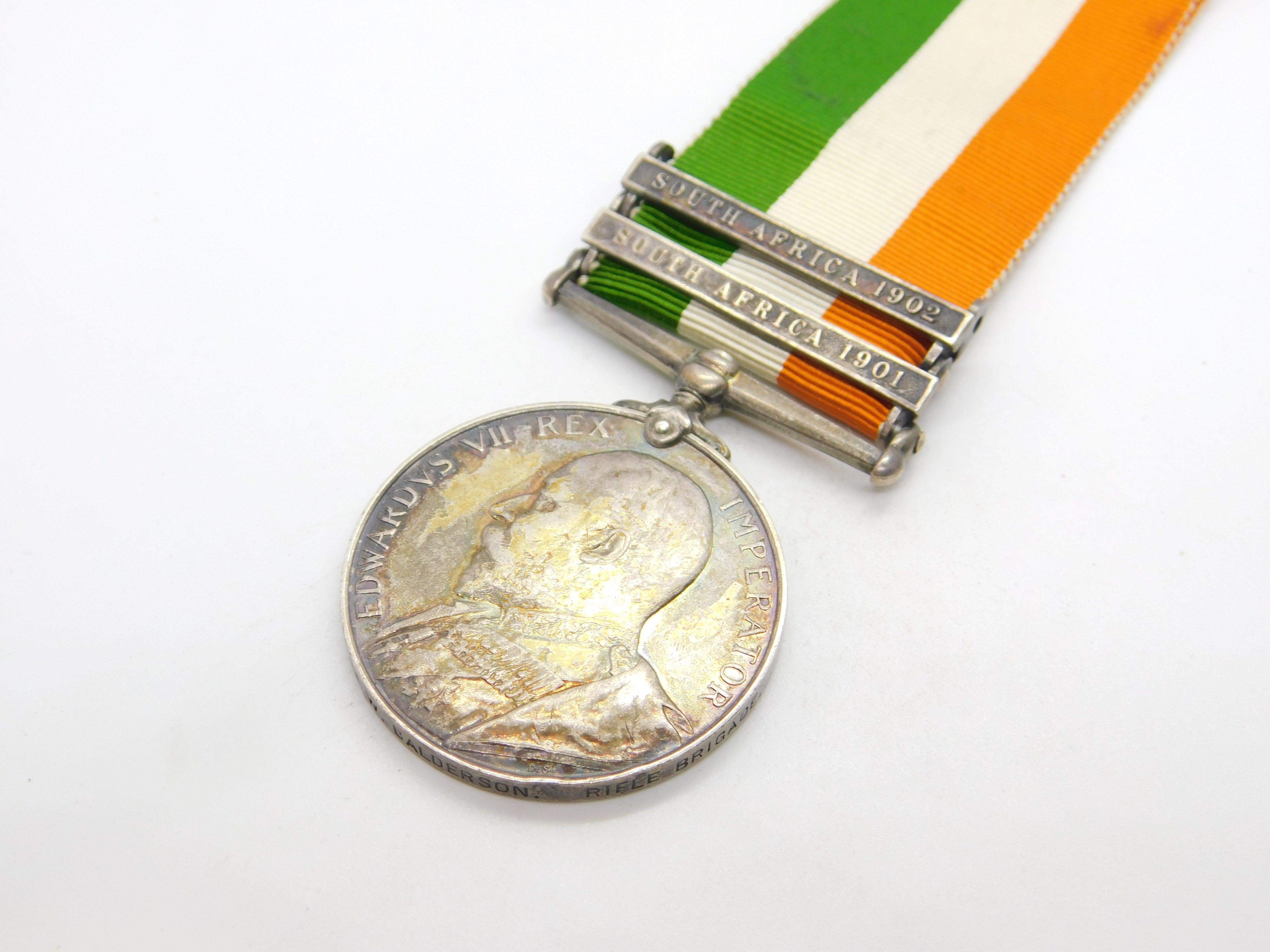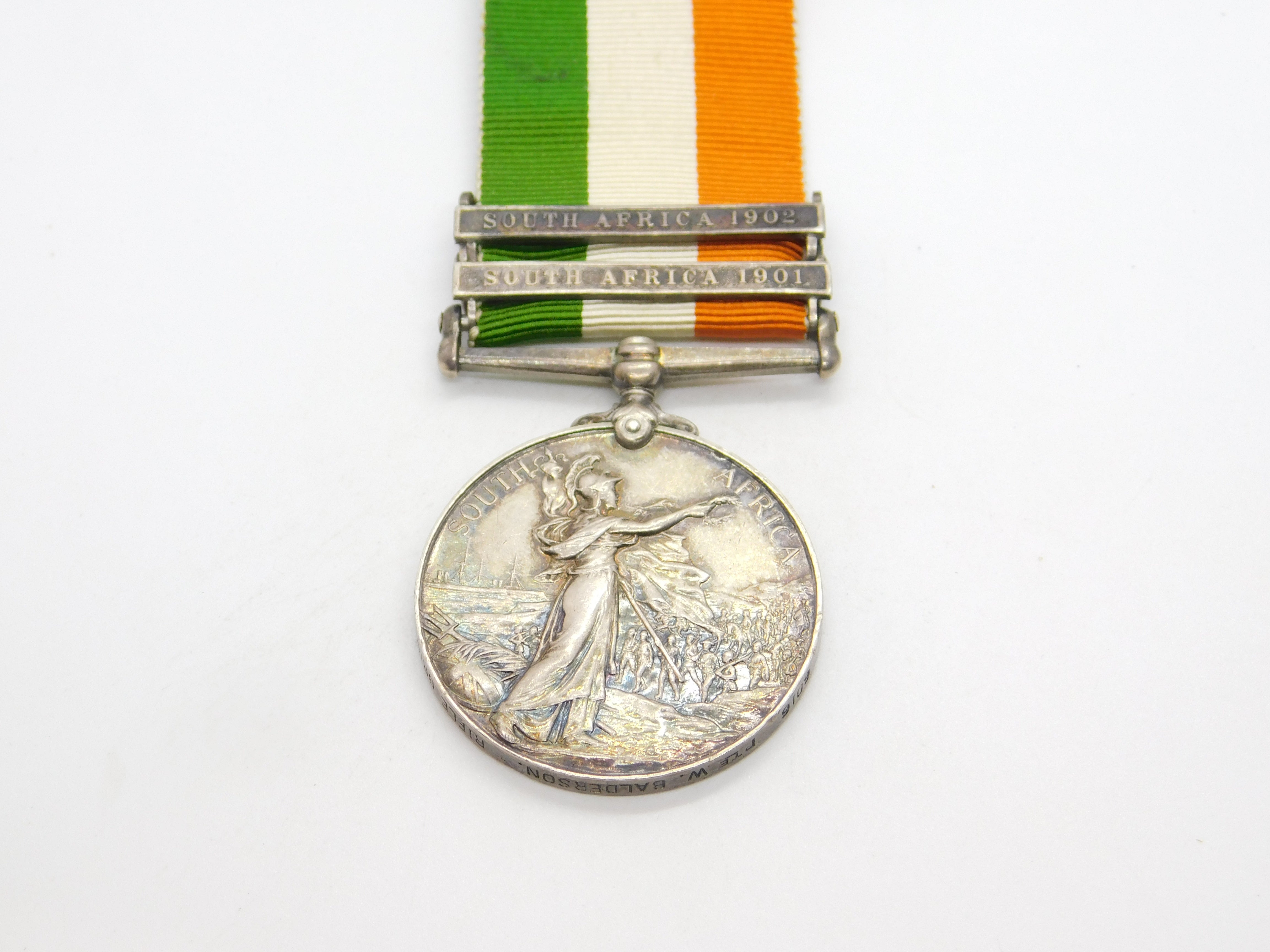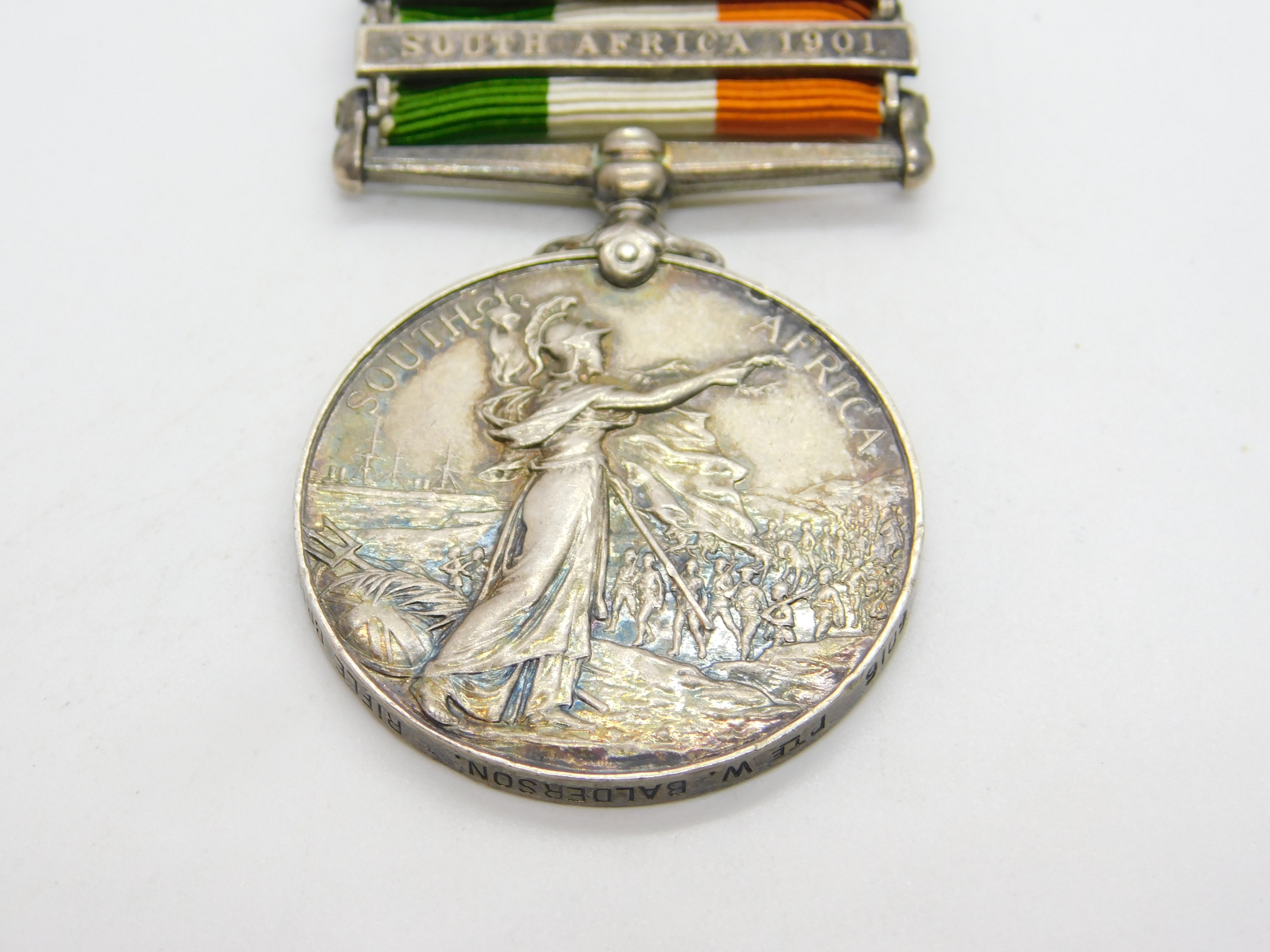 Details: A fantastic and wonderfully designed antique sterling silver original 1901-1902 Boer War Kings South Africa Service Medal issues to Pte. W. Balderson of the Rifle Brigade, 9109. Nice colour to the ribbon, a charming example. This is a wonderful item that would make a perfect gift or addition to any collection. The BOX pictured is for PRESENTATION ONLY and is NOT included in the listings but used to frame the pictures unless specifically stated otherwise.