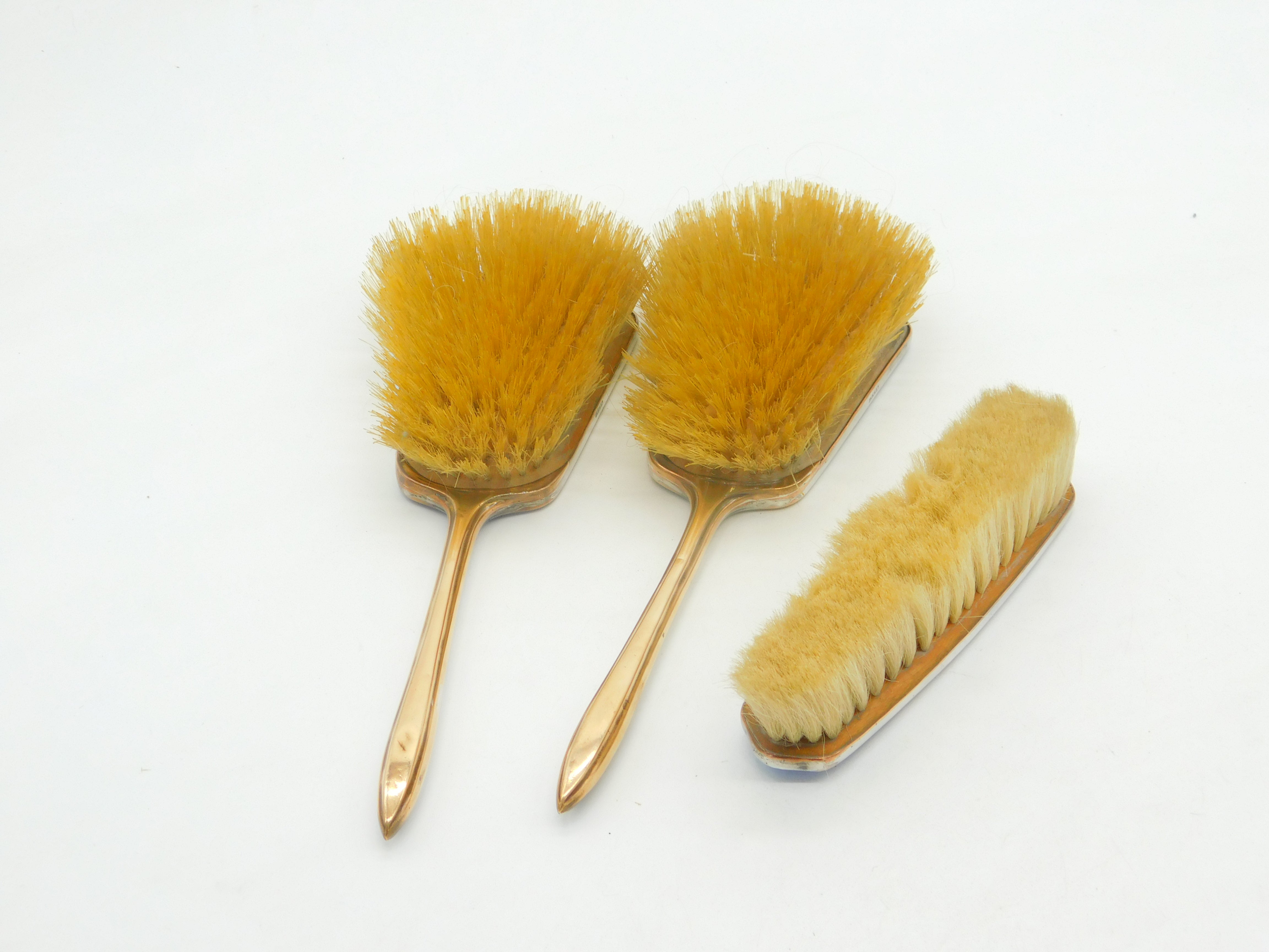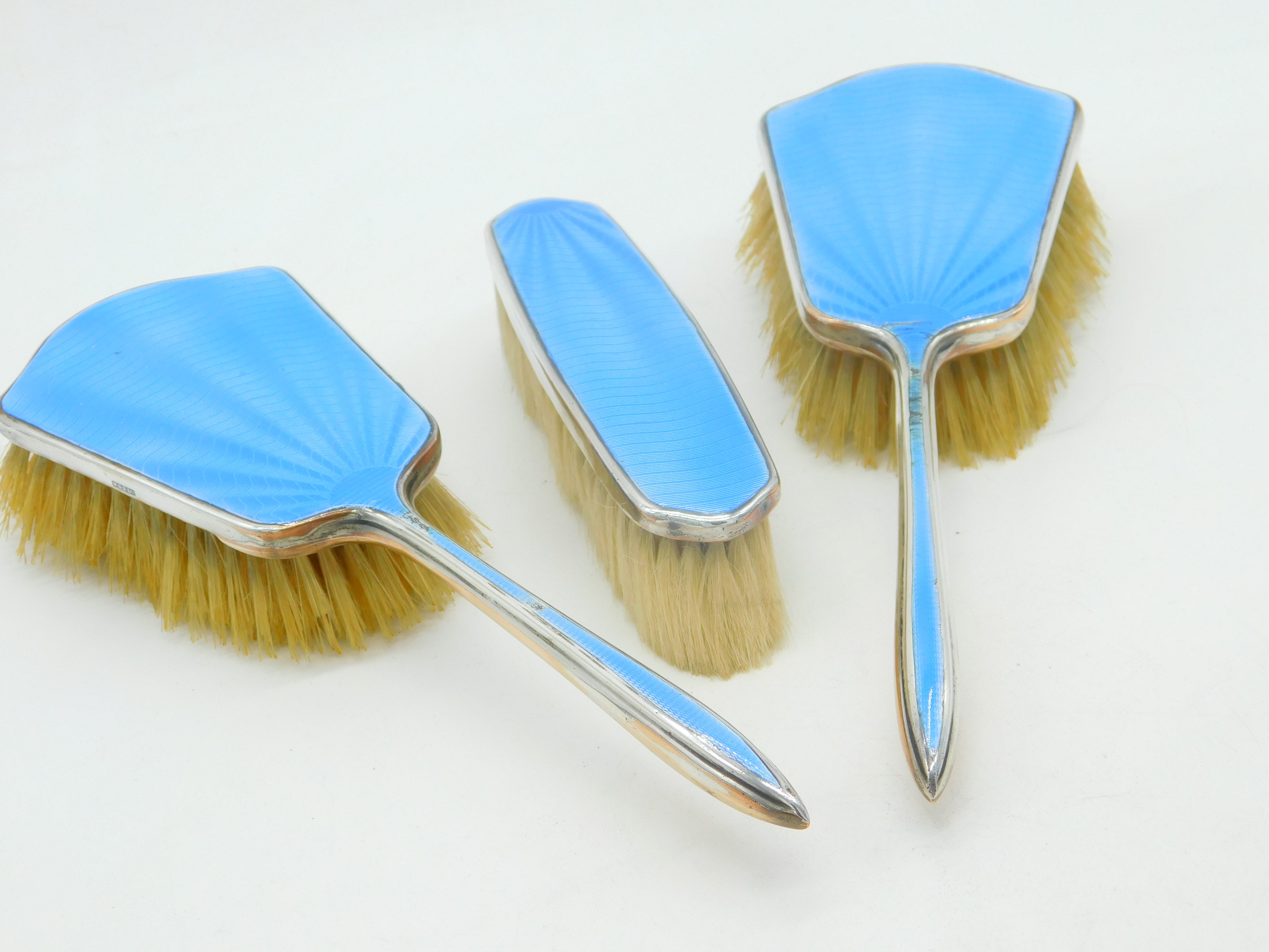 Details: A fantastic and wonderfully designed antique art deco silver plated blue guilloche enamel three piece vanity set to include three brushes each with makers marks for W G Sothers Ltd Birmingham c1930. This is a wonderful item that would make a perfect gift or addition to any collection. The BOX pictured is for PRESENTATION ONLY and is NOT included in the listings but used to frame the pictures unless specifically stated otherwise.