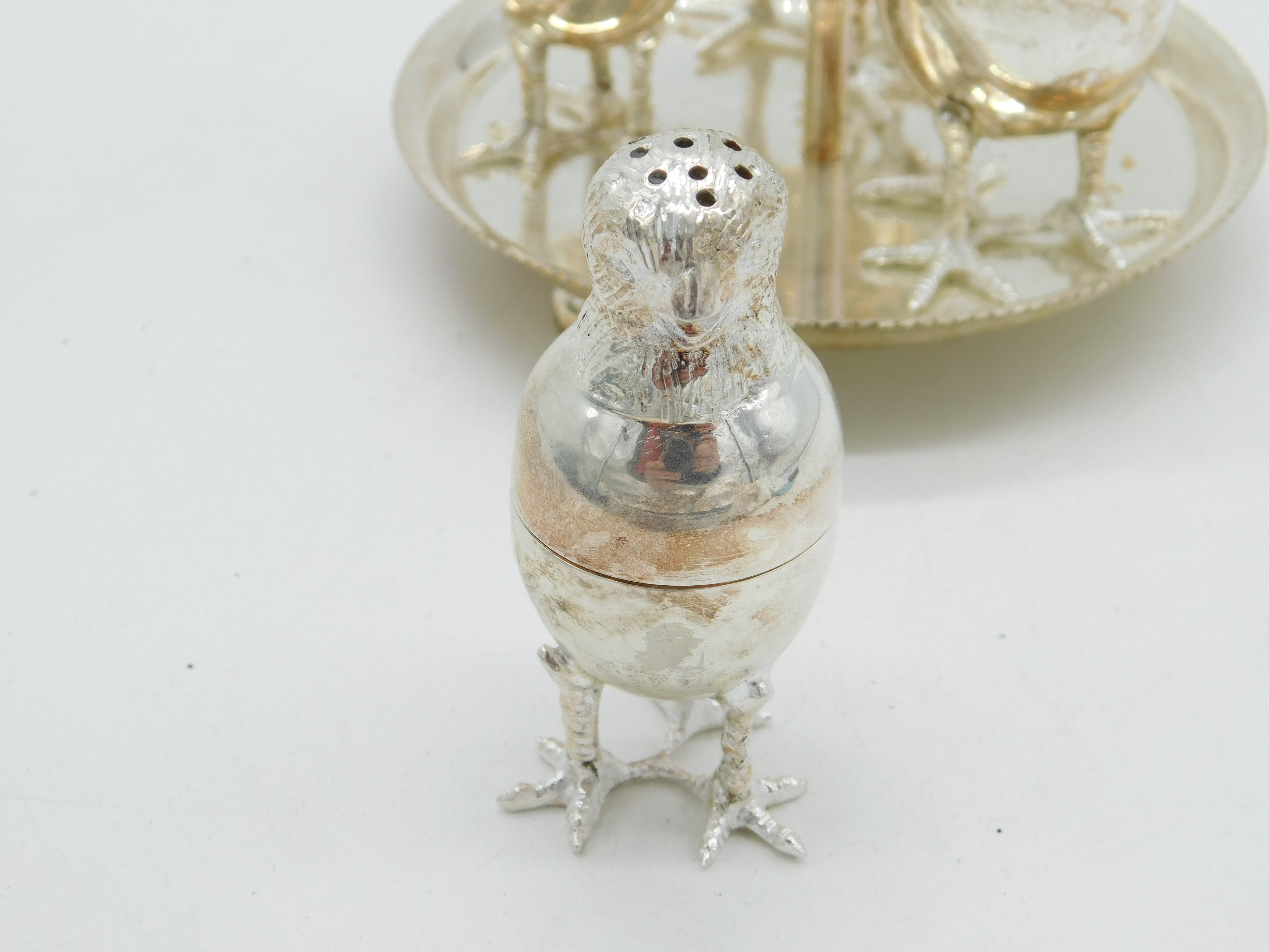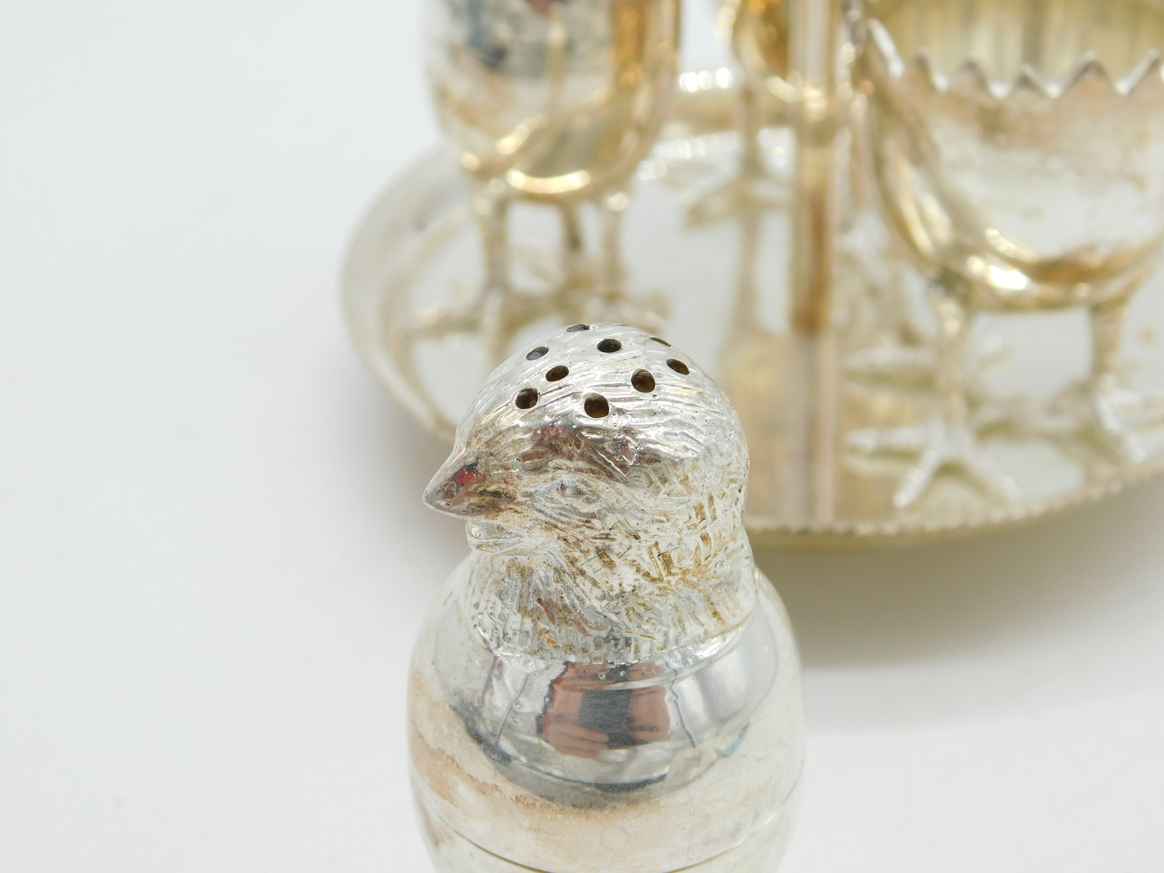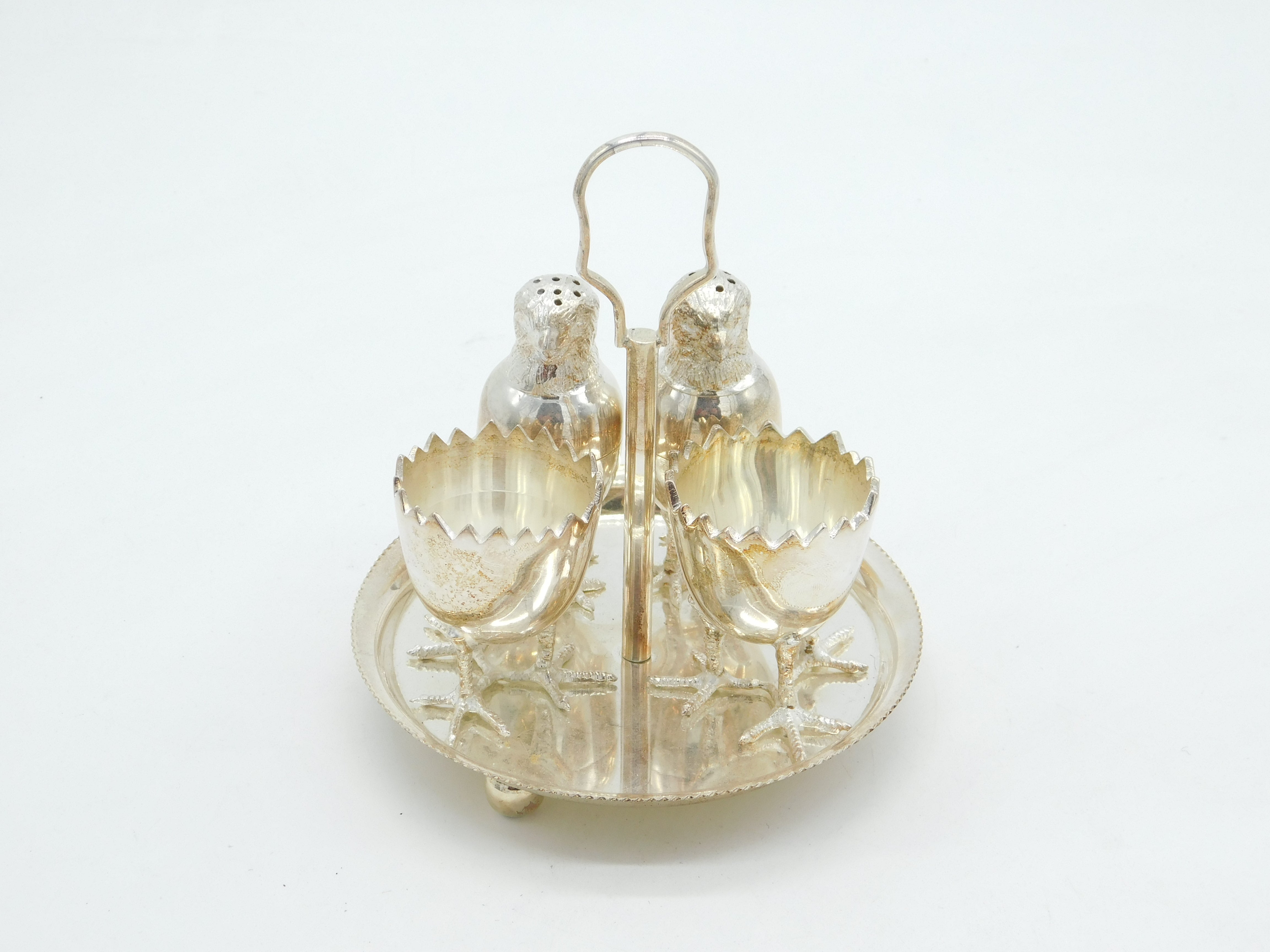 Details: A fantastic and wonderfully designed antique art deco novelty silver plated egg cup breakfast set including two egg cups with chicken feet alongside two little chick form salt & pepper shakers hallmarked to the base c1930. This is a wonderful item that would make a perfect gift or addition to any collection. The BOX pictured is for PRESENTATION ONLY and is NOT included in the listings but used to frame the pictures unless specifically stated otherwise.