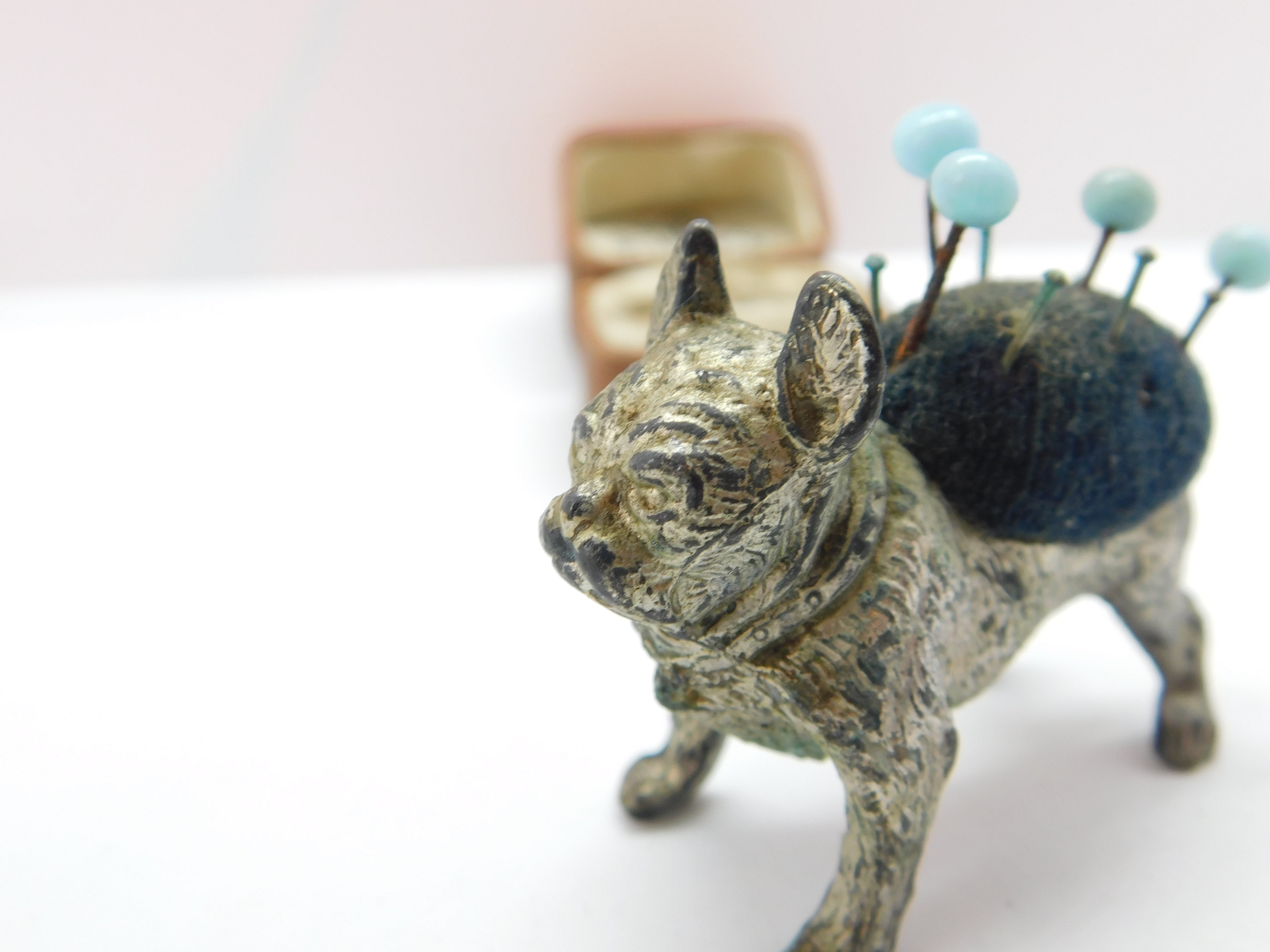Silver Plated Novelty Bulldog Sewing Pin Cushion Antique c1920 Art Deco