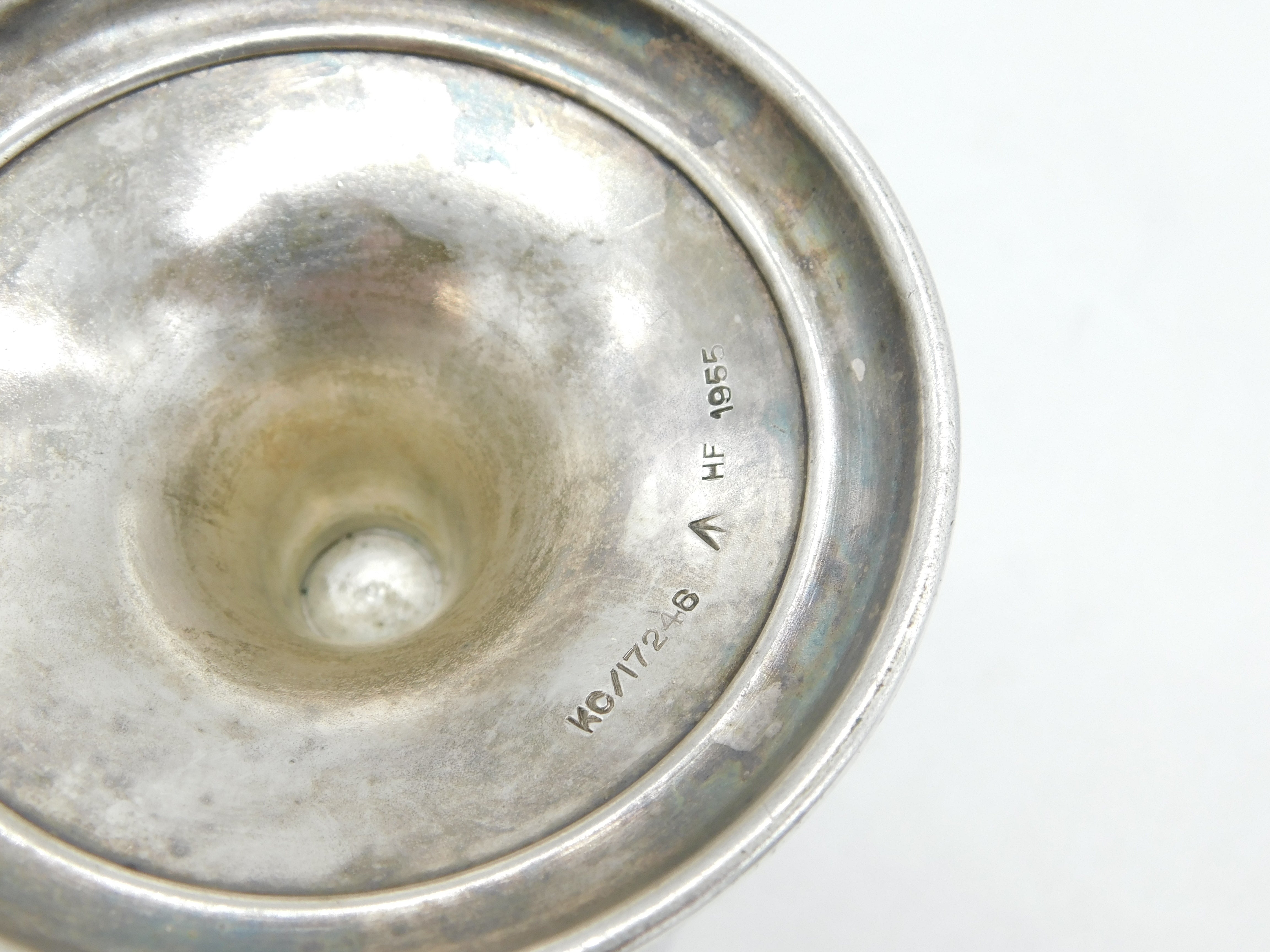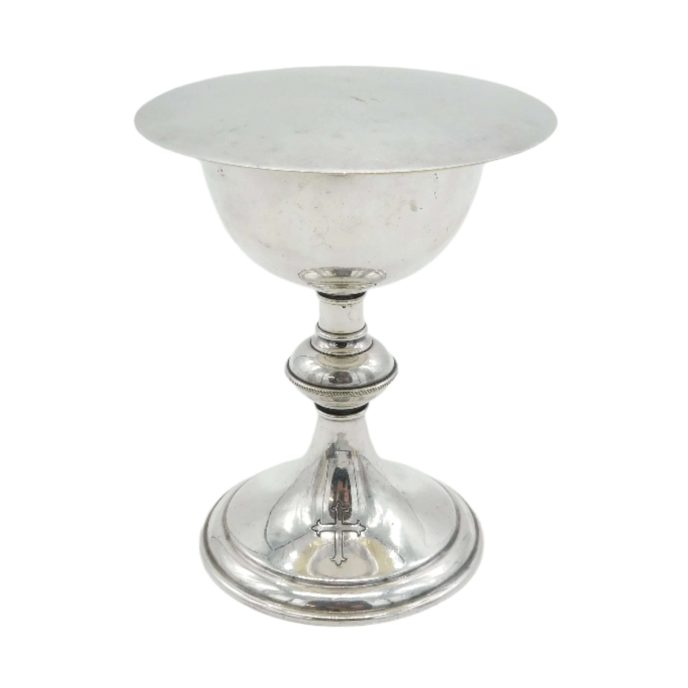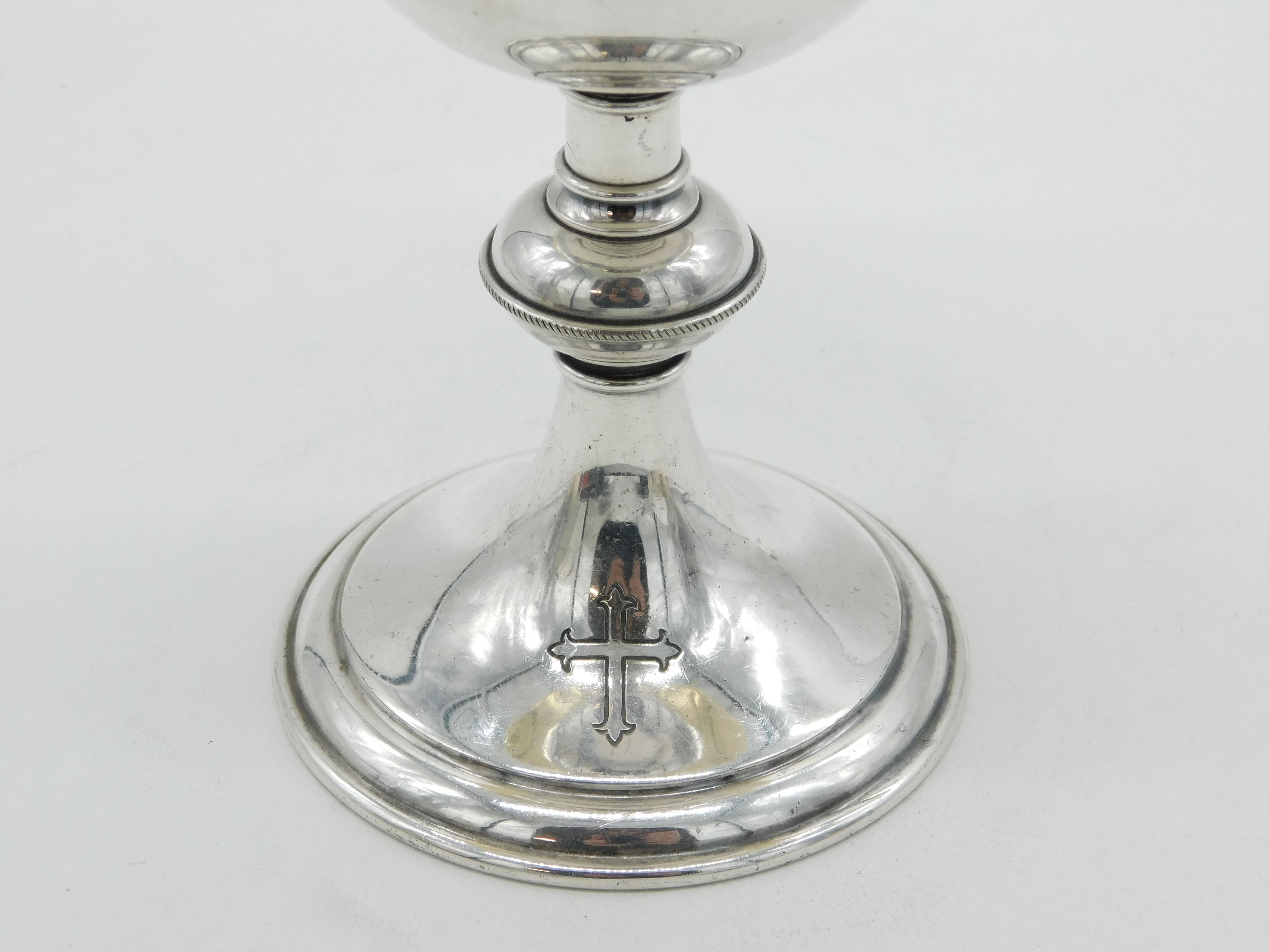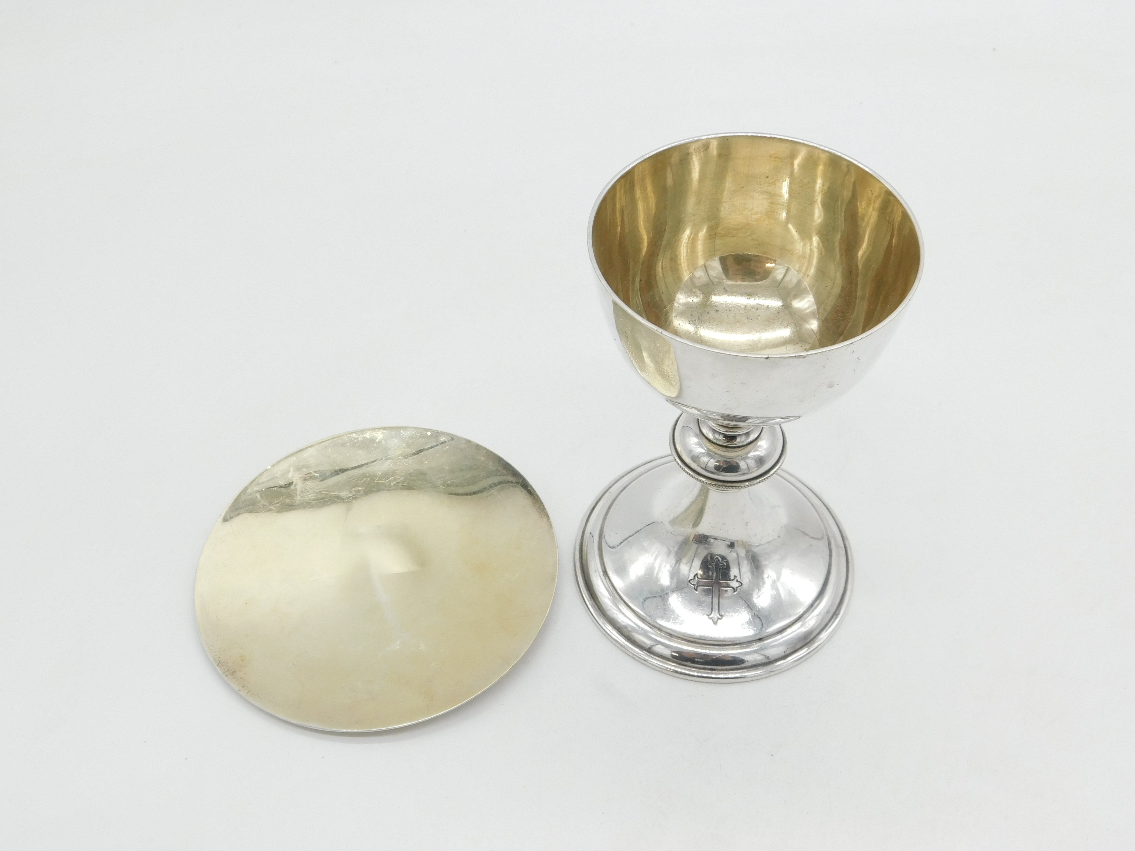 Details: A fantastic and wonderfully designed mid-century silver plated military interest travelling communion chalice and paten with cross engraved to the front and marked with military marks to the base dated 1955. This is a wonderful item that would make a perfect gift or addition to any collection.