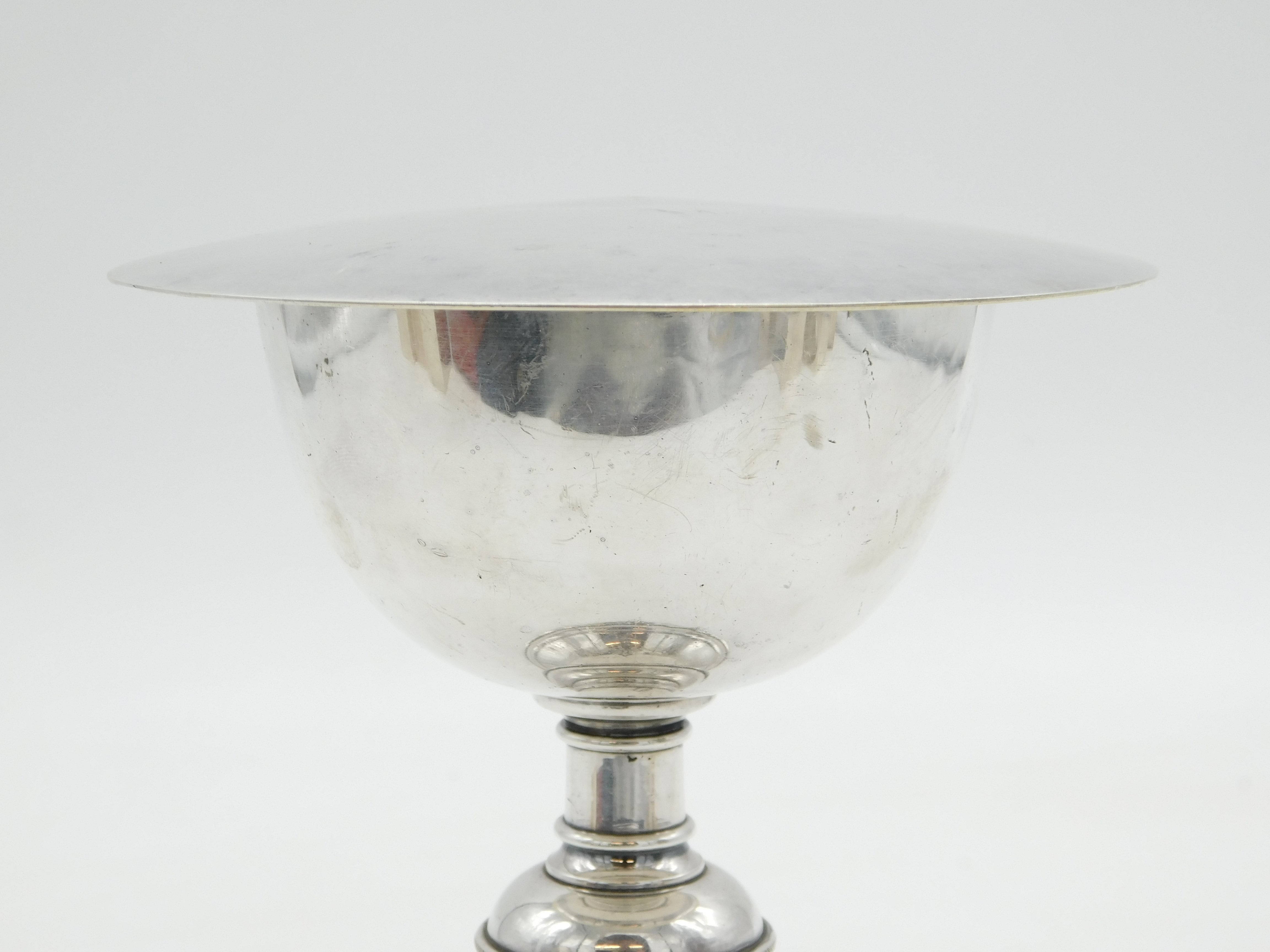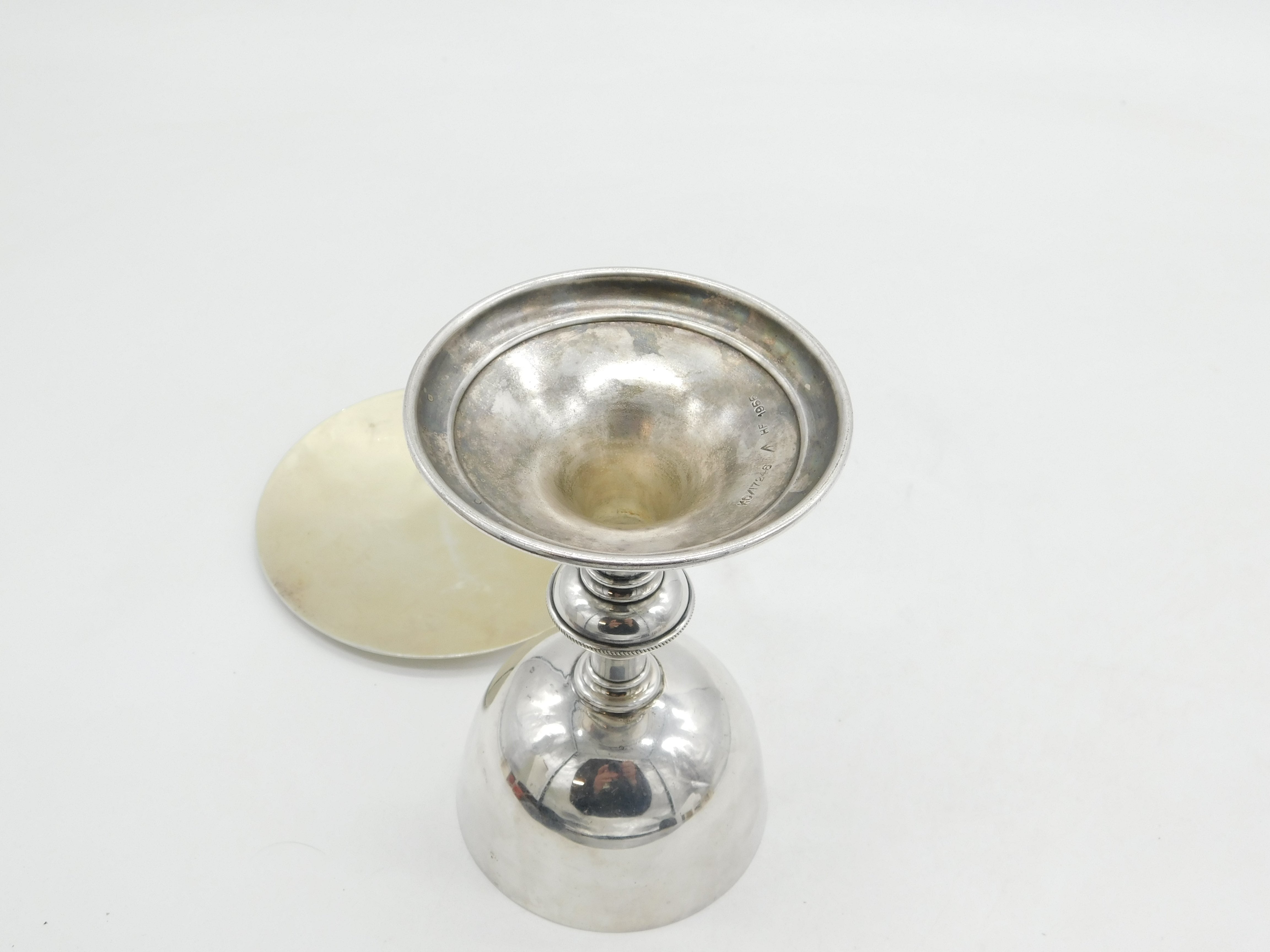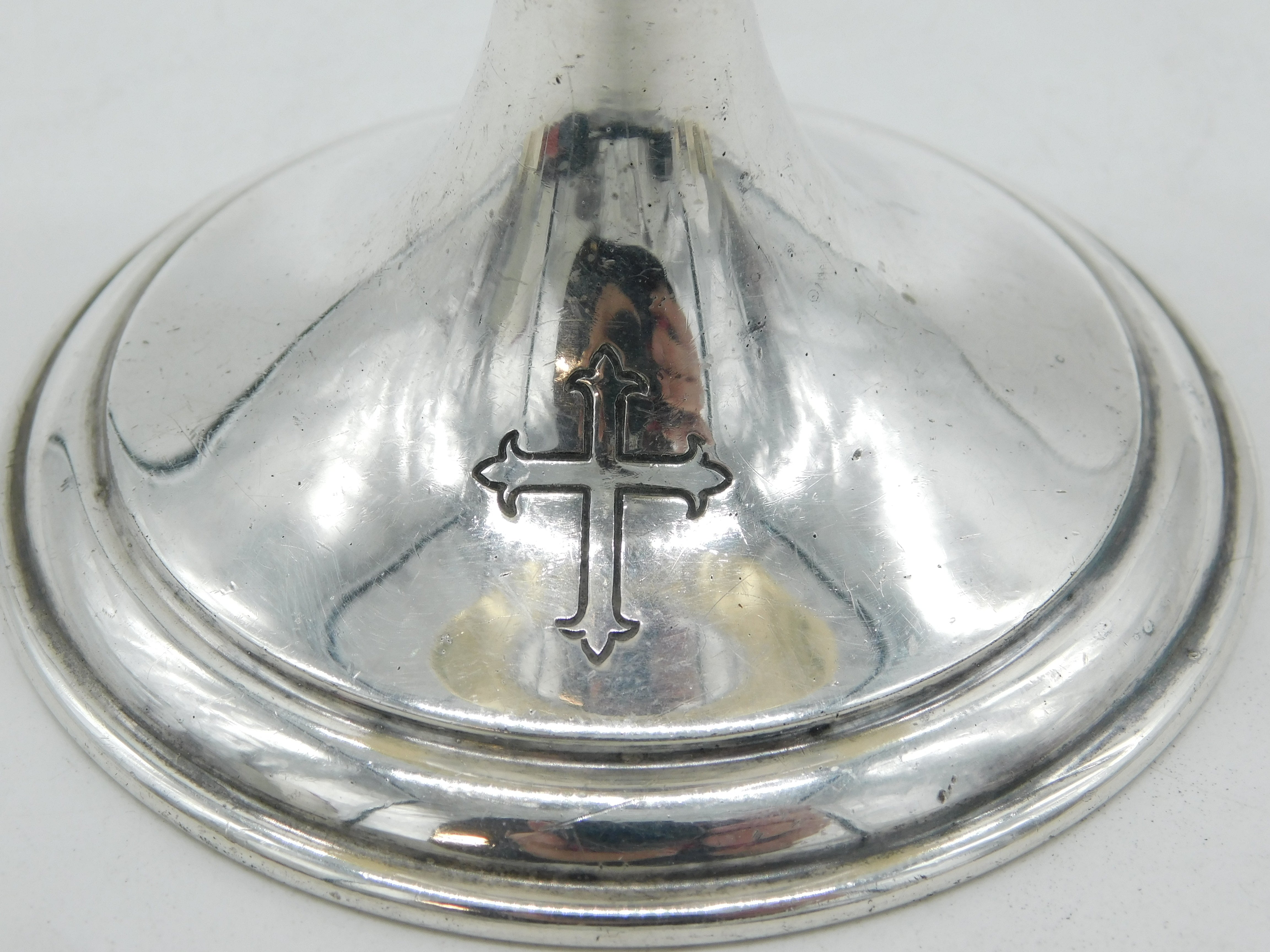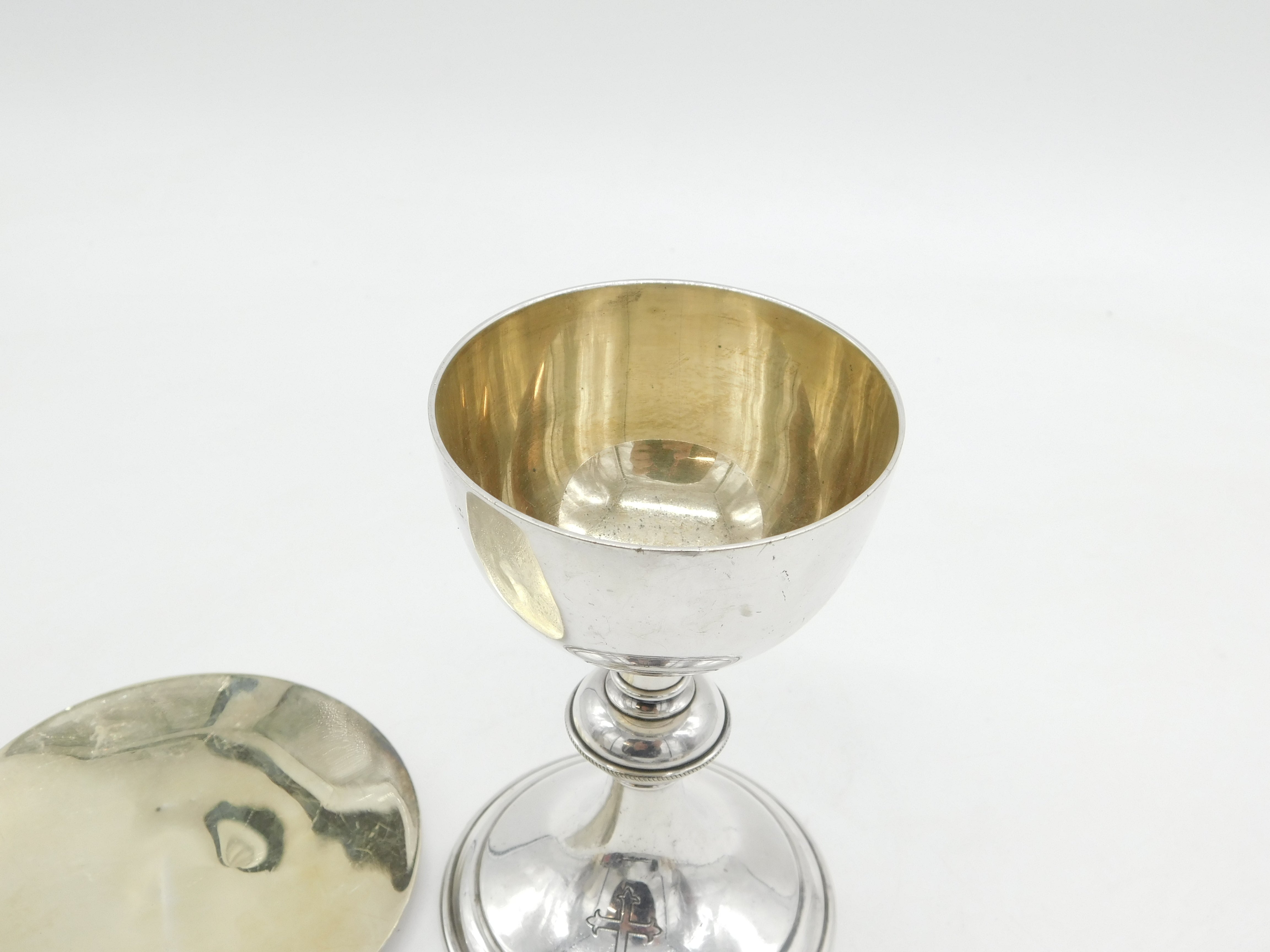 Details: A fantastic and wonderfully designed mid-century silver plated military interest travelling communion chalice and paten with cross engraved to the front and marked with military marks to the base dated 1955. This is a wonderful item that would make a perfect gift or addition to any collection.