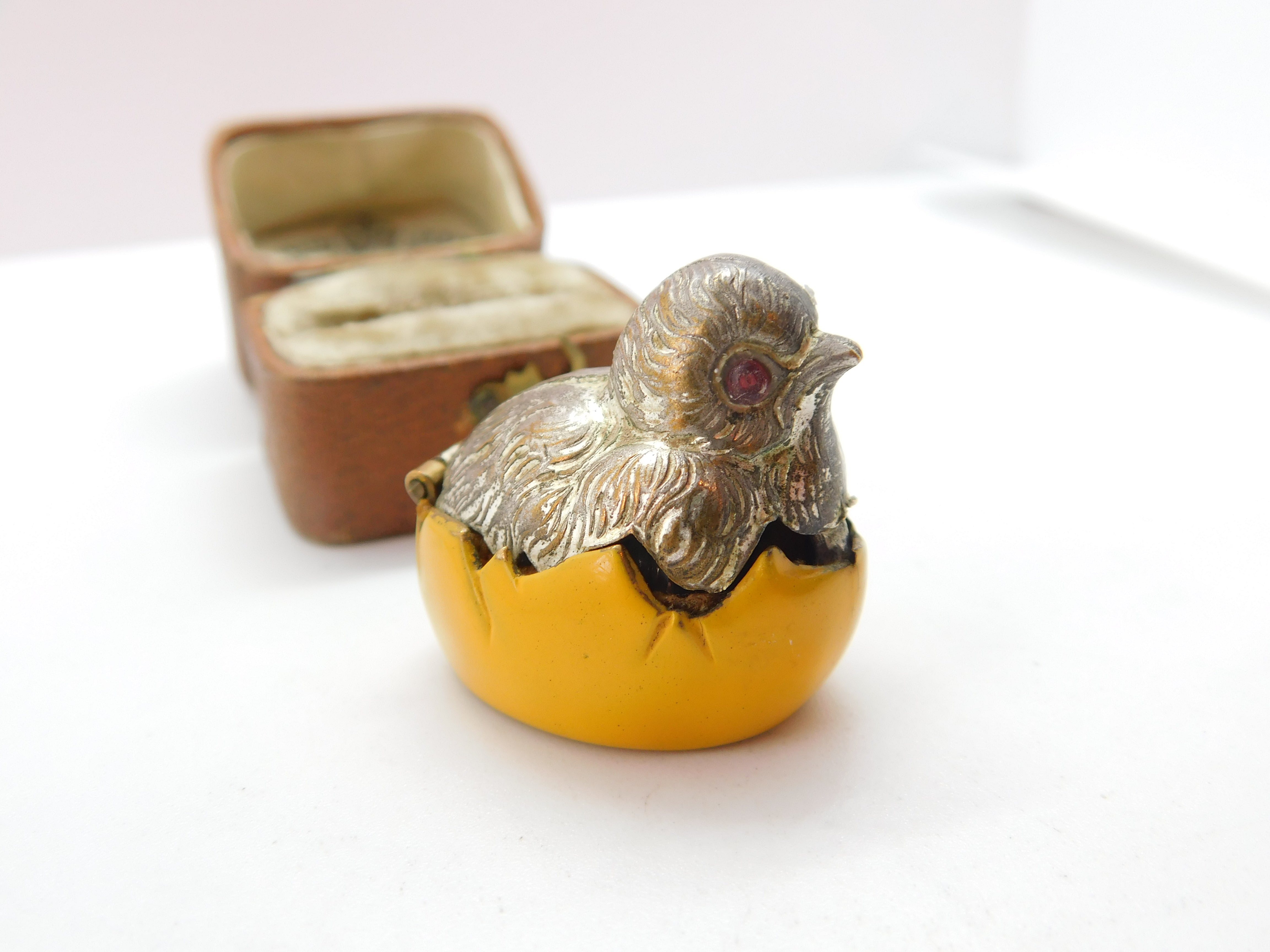 Details: A fantastic and wonderfully designed antique Edwardian silver plated and yellow enamel sewing thimble case depicting a chick in egg with superb detailing including a silver thimble to the interior c1910. The plating has worn from the chick but is otherwise lovely, missing one glass eye. This is a wonderful item that would make a perfect gift or addition to any collection. The BOX pictured is for PRESENTATION ONLY and is NOT included in the listings but used to frame the pictures unless specifically stated otherwise.