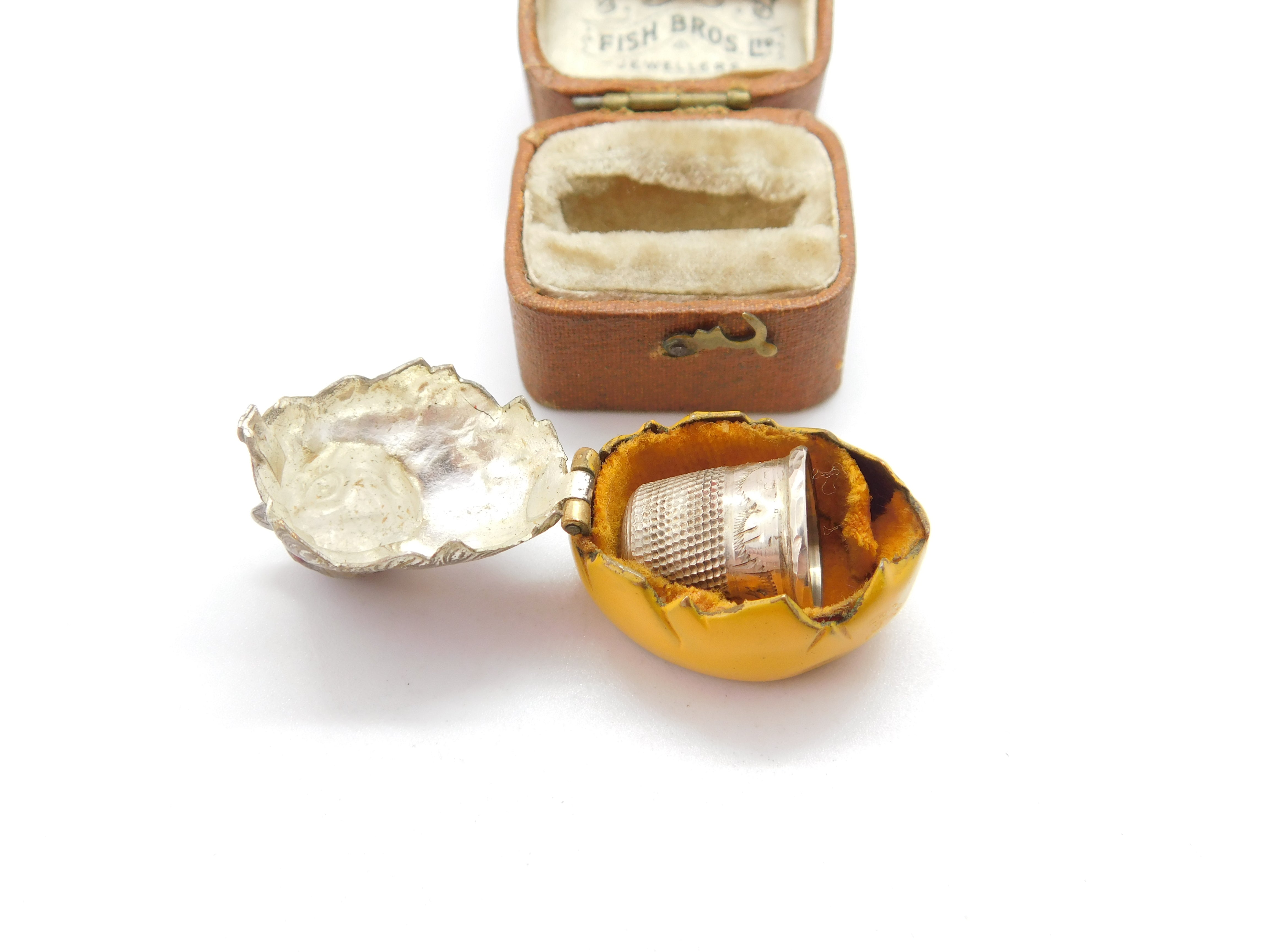 Silver Plated Yellow Enamel Chick in Egg Sewing Thimble Case c1910 Antique