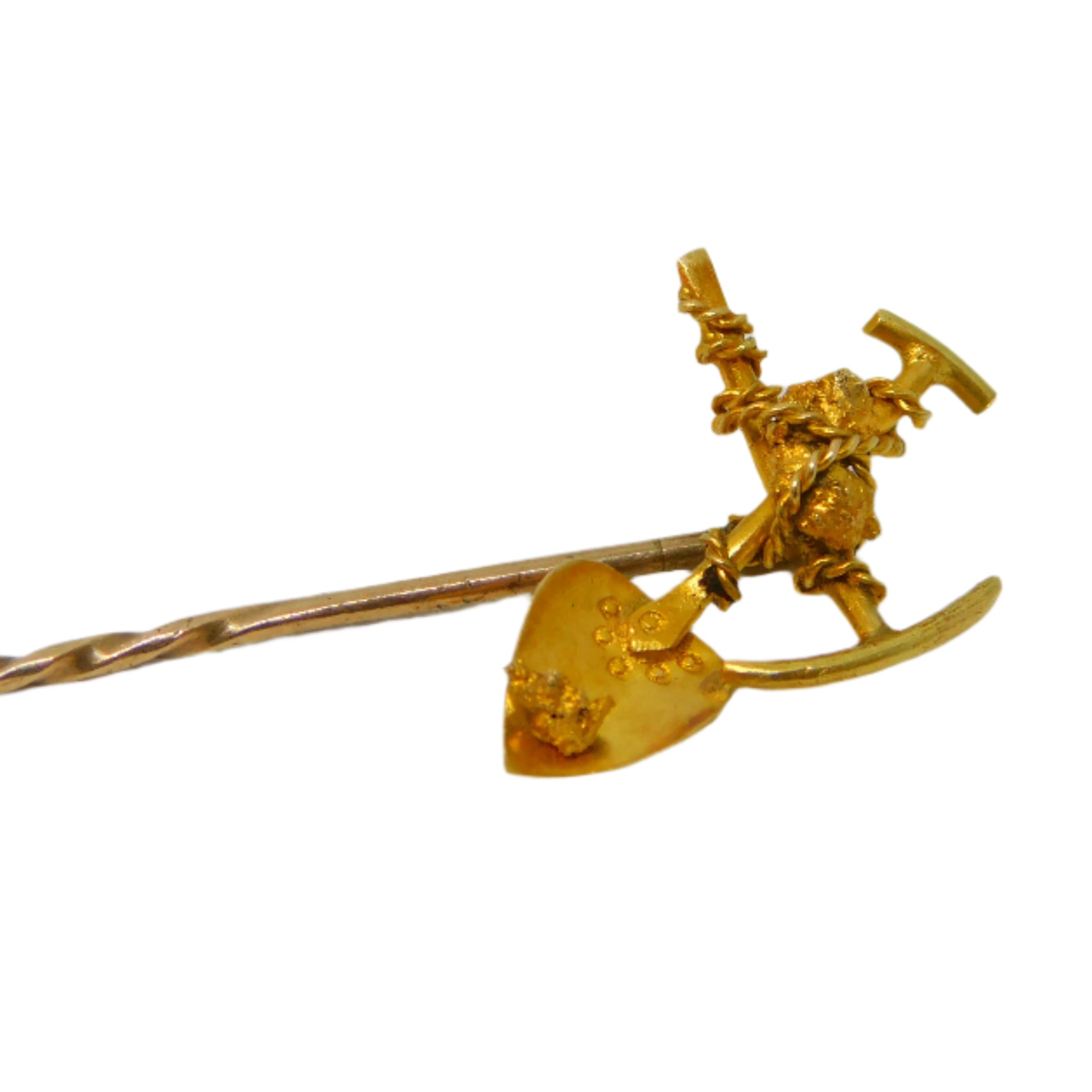 Details: A fantastic and wonderfully designed antique South African 19th century 22ct yellow gold topped gold mining stick pin depicting a shovel and pick, 9ct gold pin, the gold has been XRF tested as it is unmarked c1890.This is a wonderful item that would make a perfect gift or addition to any collection. The BOX pictured is for PRESENTATION ONLY and is NOT included in the listings but used to frame the pictures unless specifically stated otherwise.