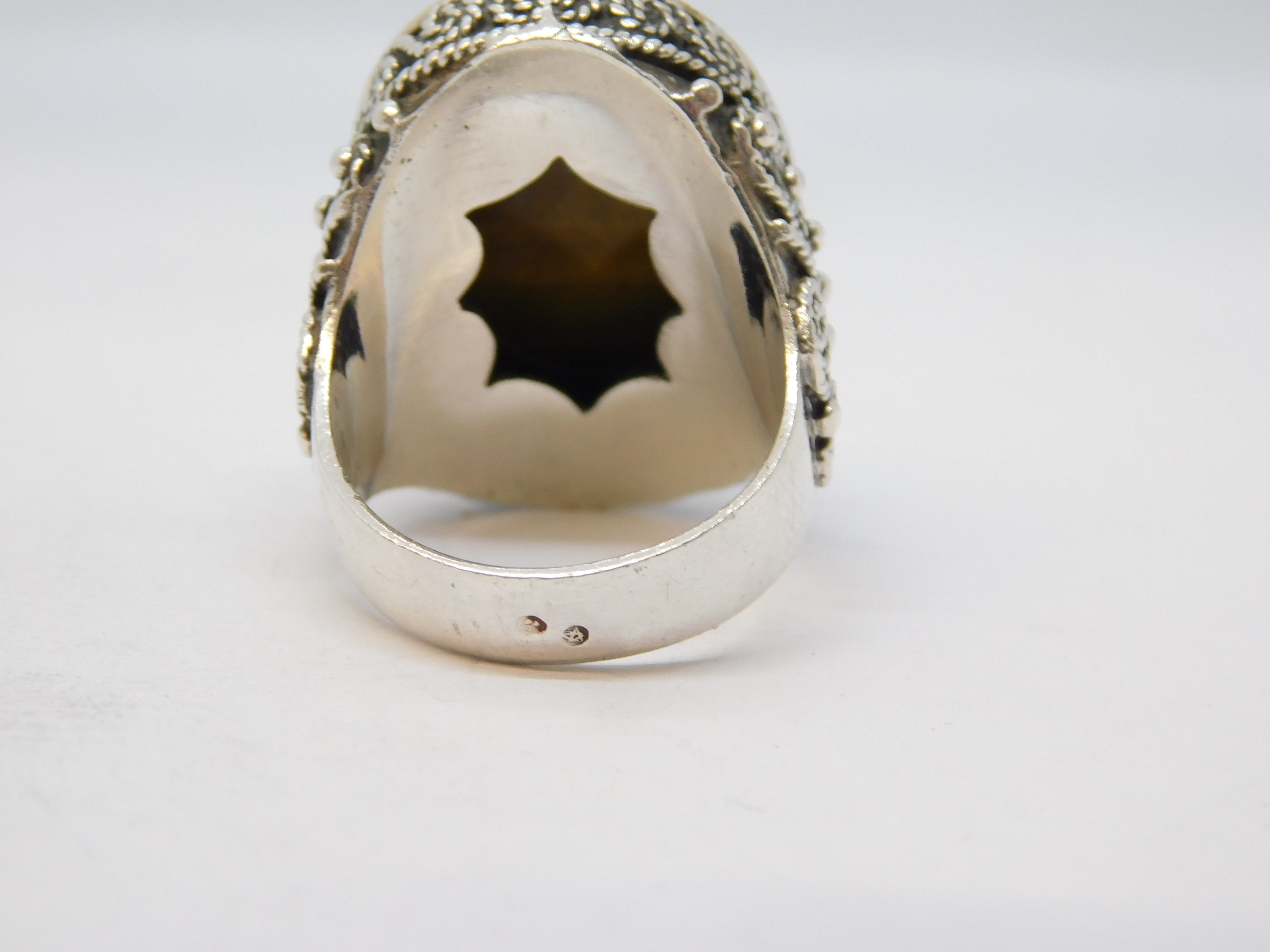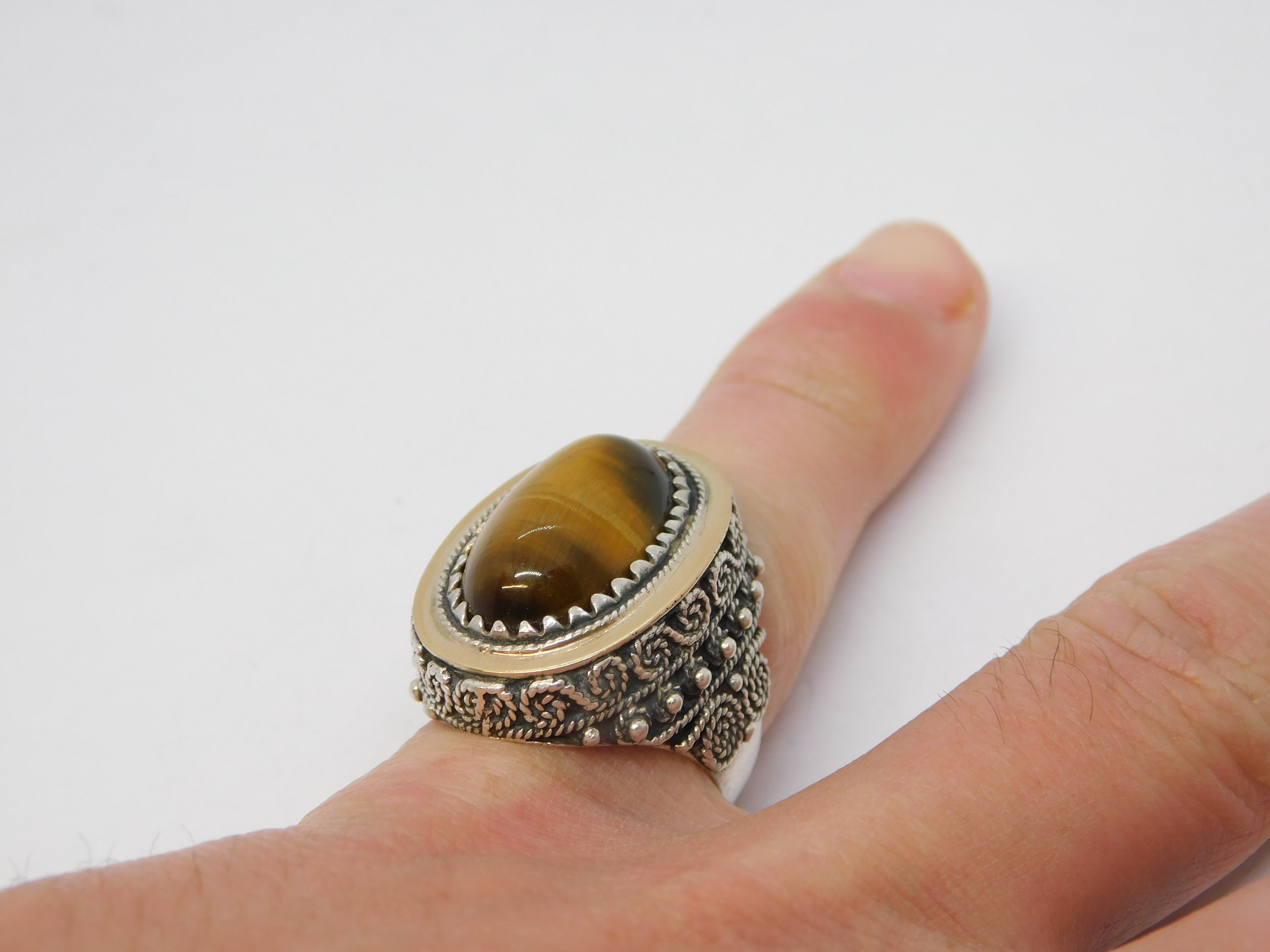 Spanish Large Sterling Silver, Gold & Tiger's Eye Signet Ring Vintage c1950