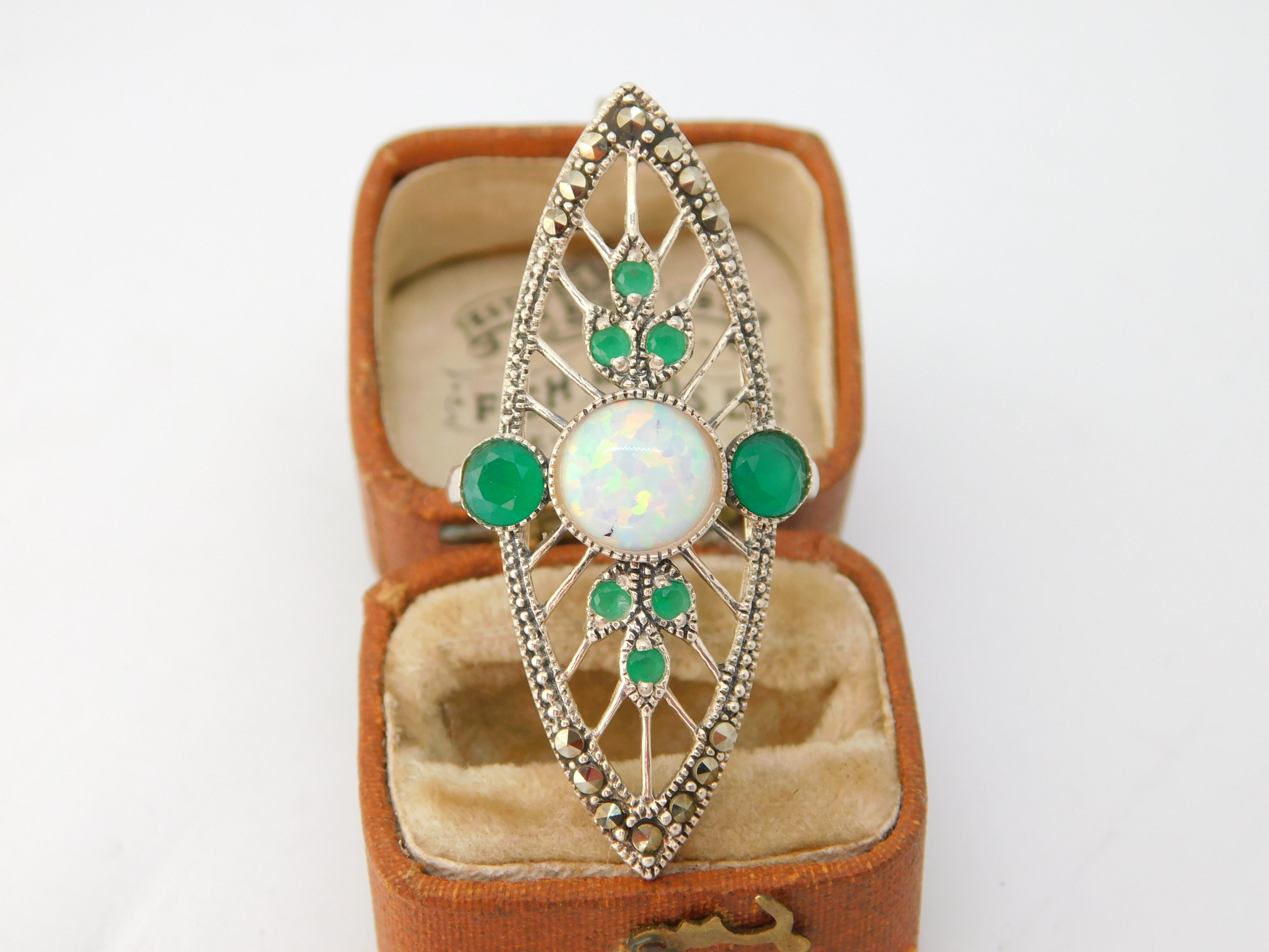 Sterling Silver Art Deco Style Opal, Emerald Paste & Marcasite Statement Ring