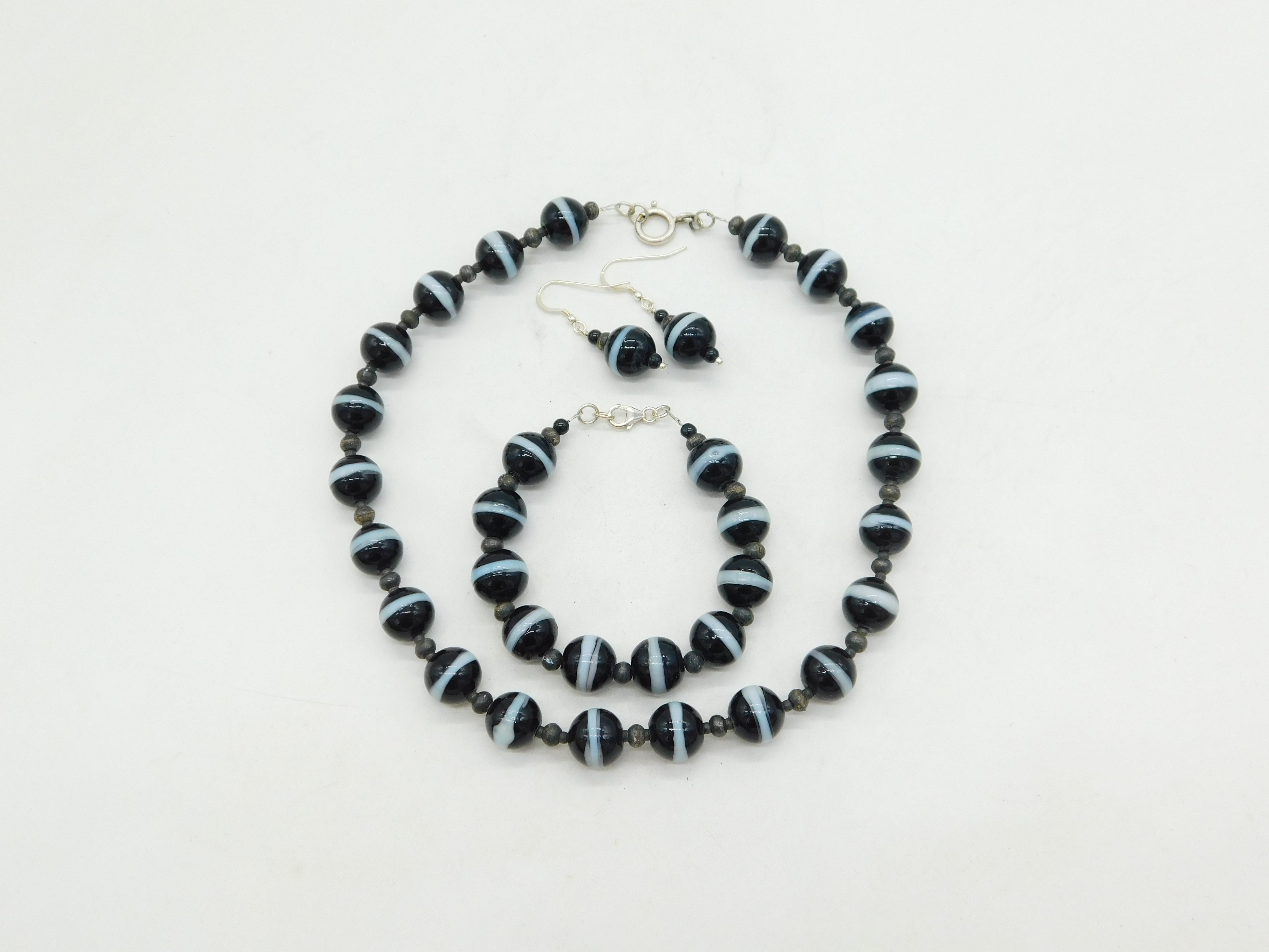 Details: A fantastic and wonderfully designed vintage sterling silver & banded agate three-piece jewellery set to include a necklace, bracelet and pair of earrings c1970. This is a wonderful item that would make a perfect gift or addition to any collection.
