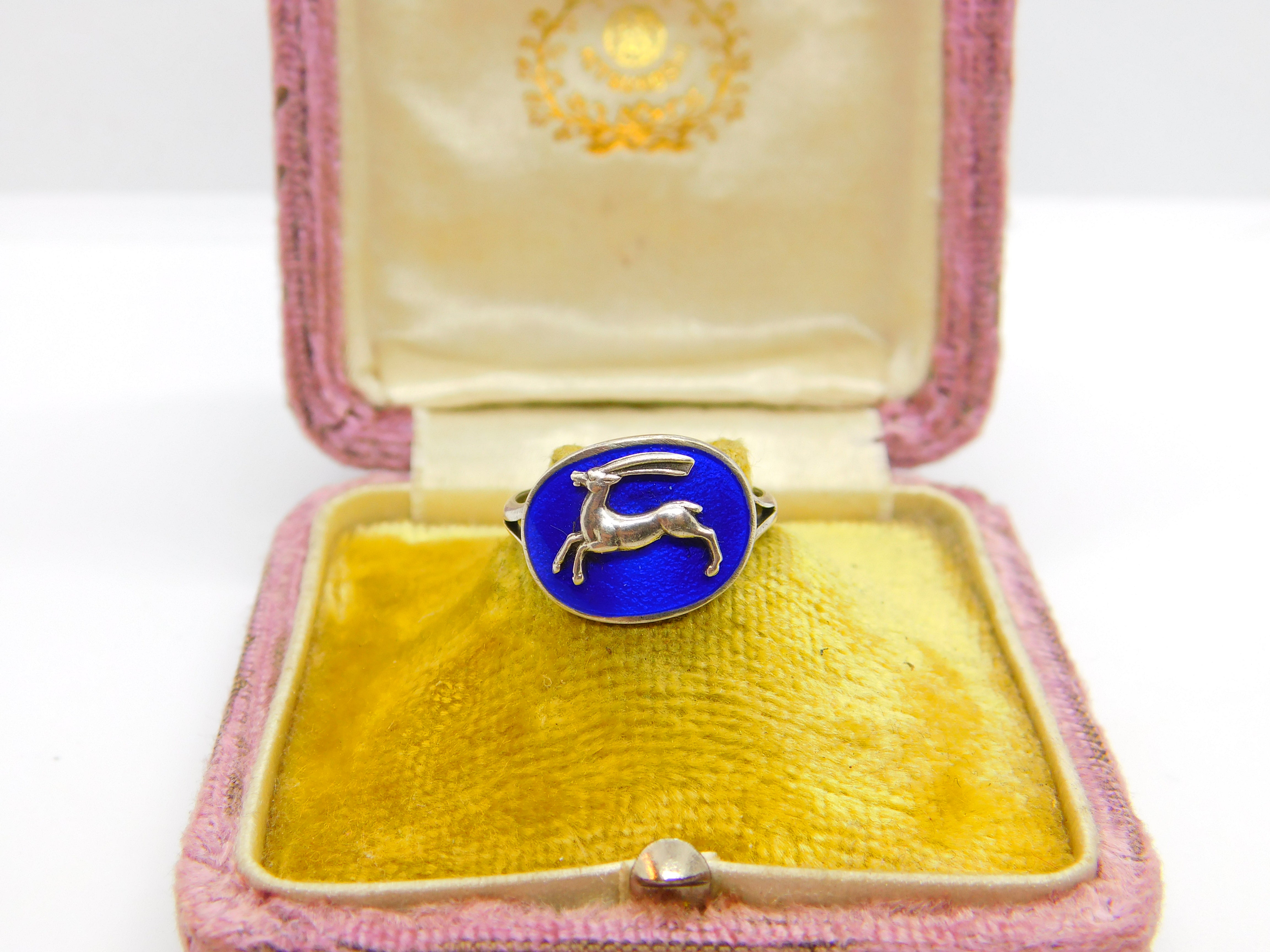 Details: A fantastic and wonderfully designed antique art deco sterling silver & blue enamel capricorn the goat signet ring with lovely detailing hallmarked to the interior c1930. This is a wonderful item that would make a perfect gift or addition to any collection. The BOX pictured is for PRESENTATION ONLY and is NOT included in the listings but used to frame the pictures unless specifically stated otherwise.