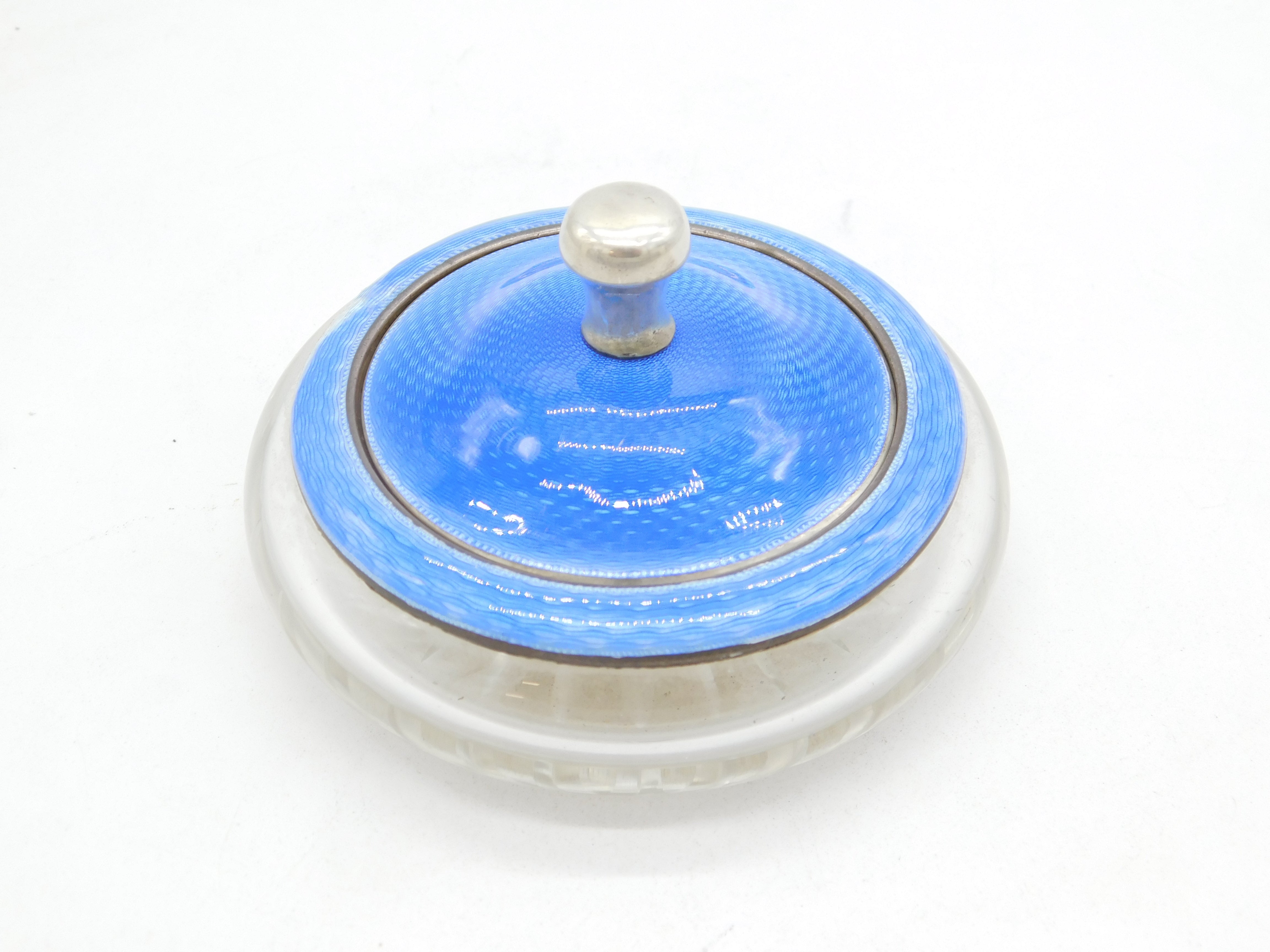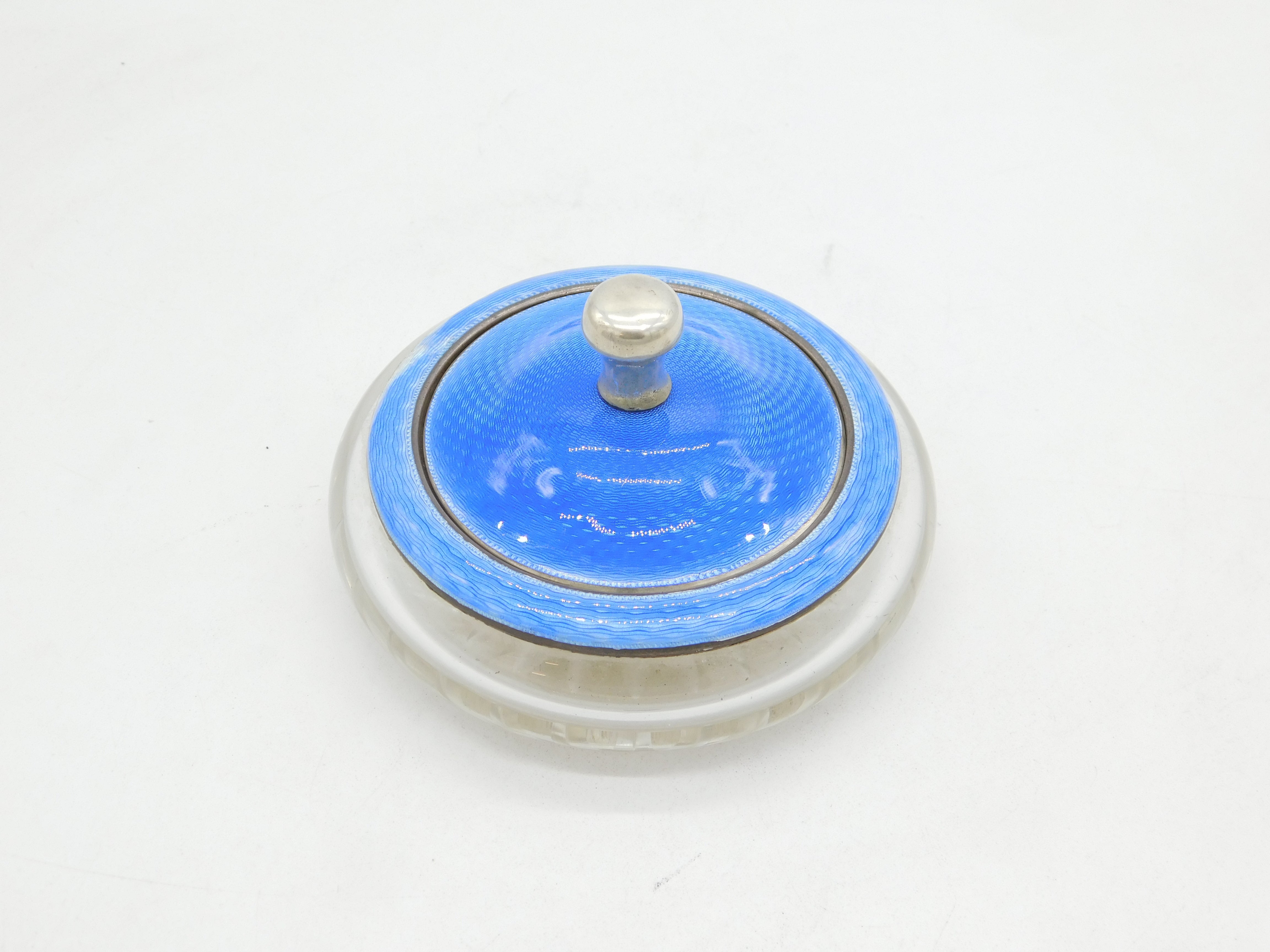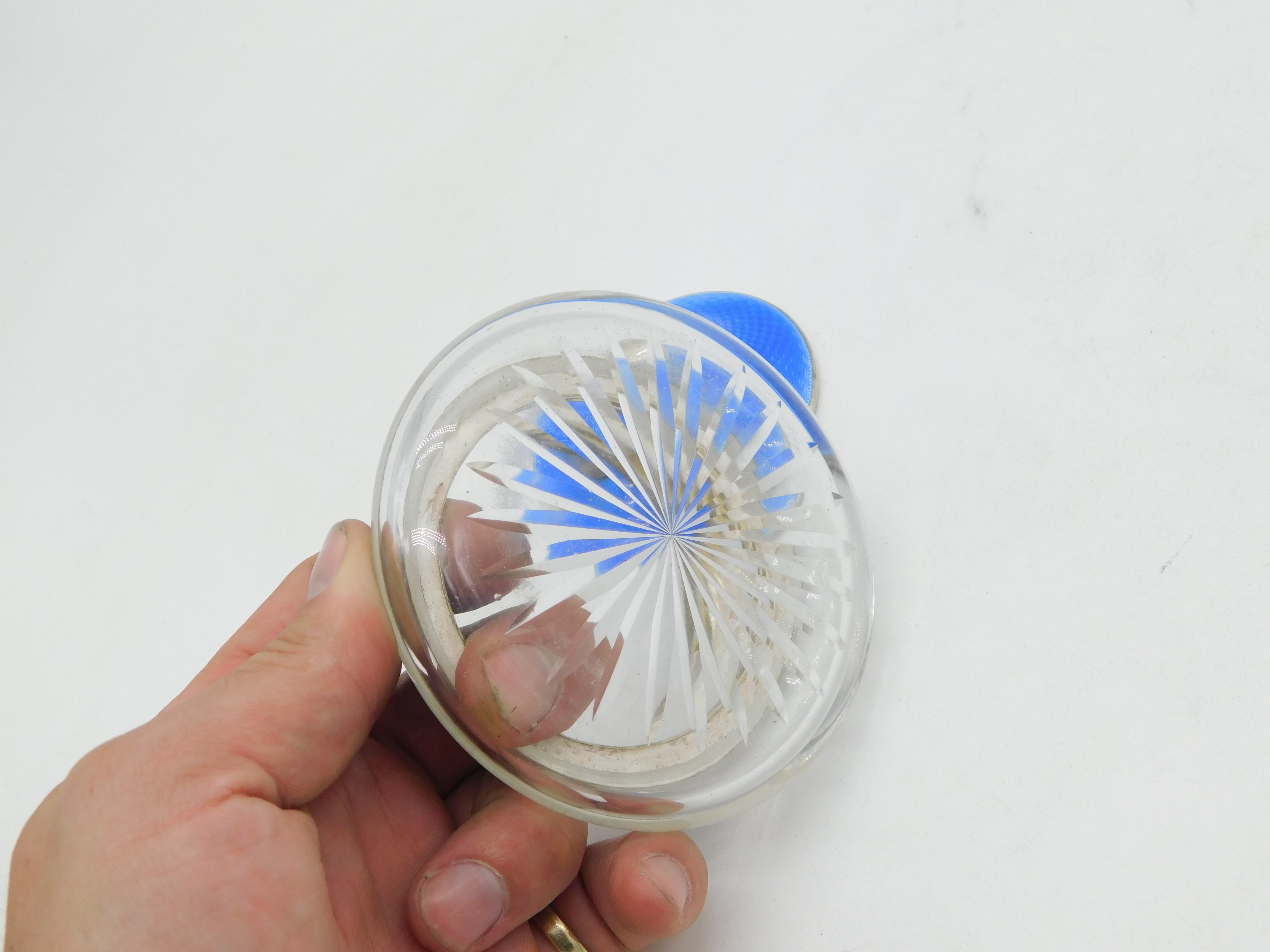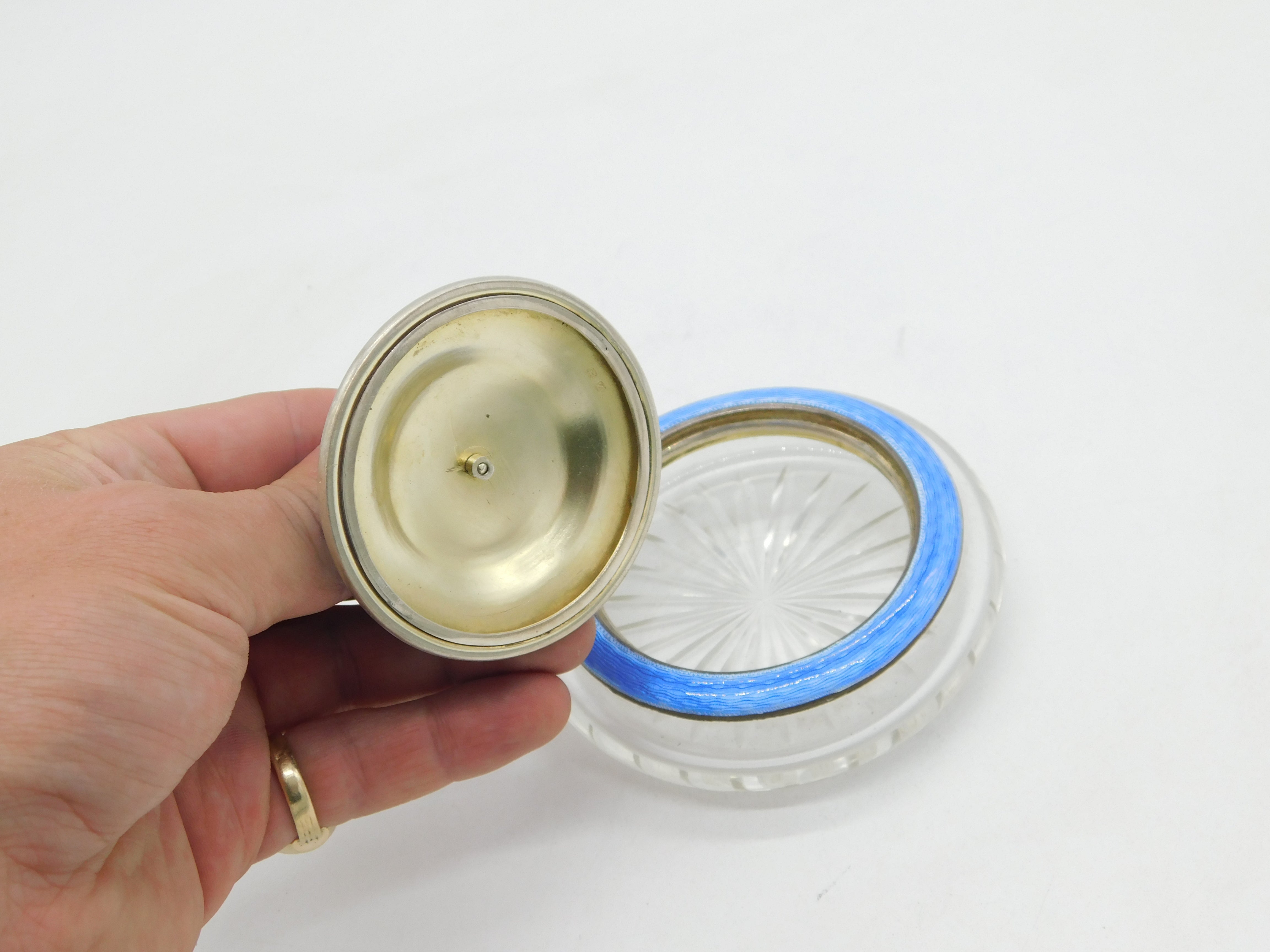 Sterling Silver, Blue Enamel Cut Glass Trinket Pot Antique 1924 Birmingham