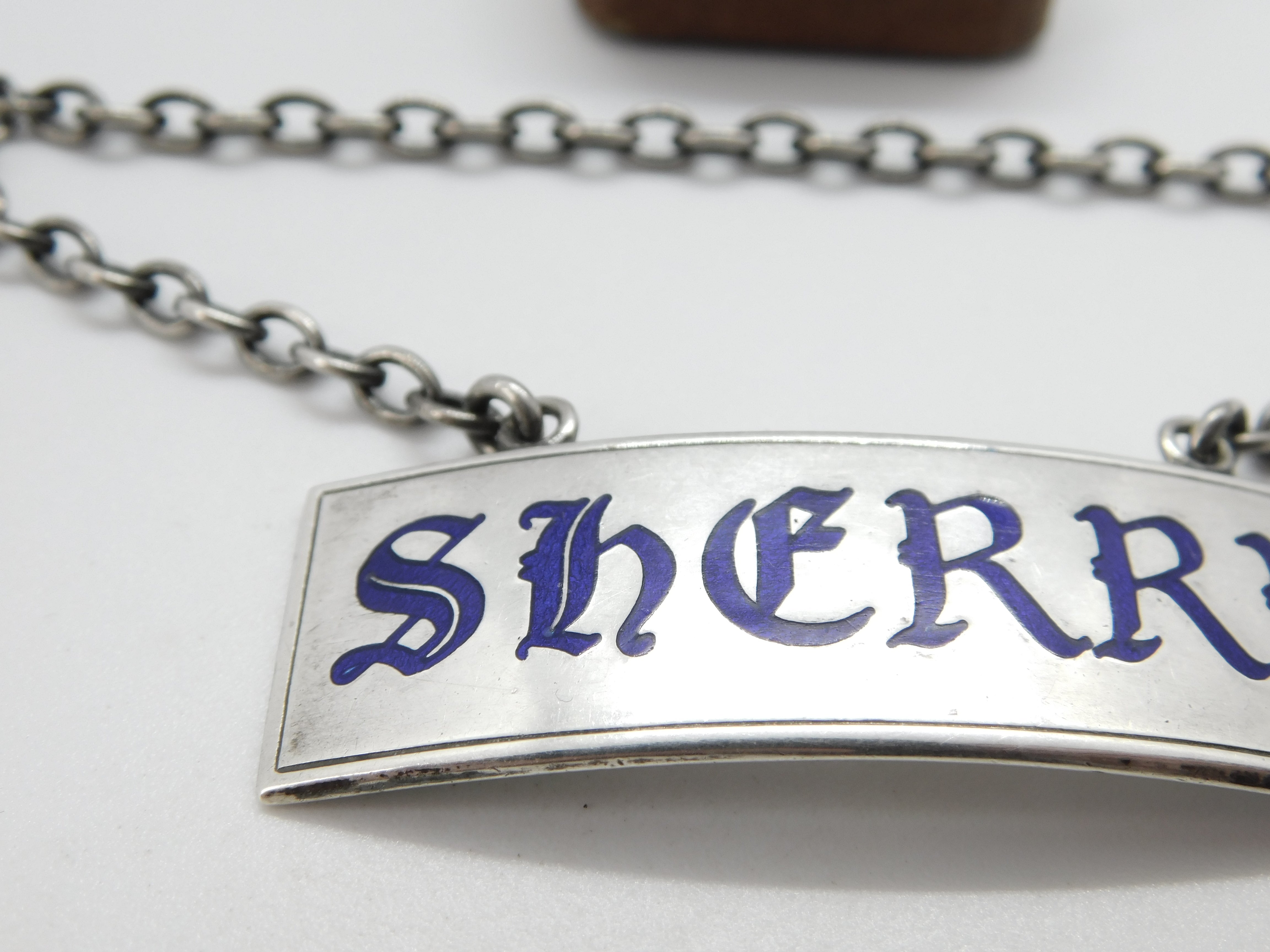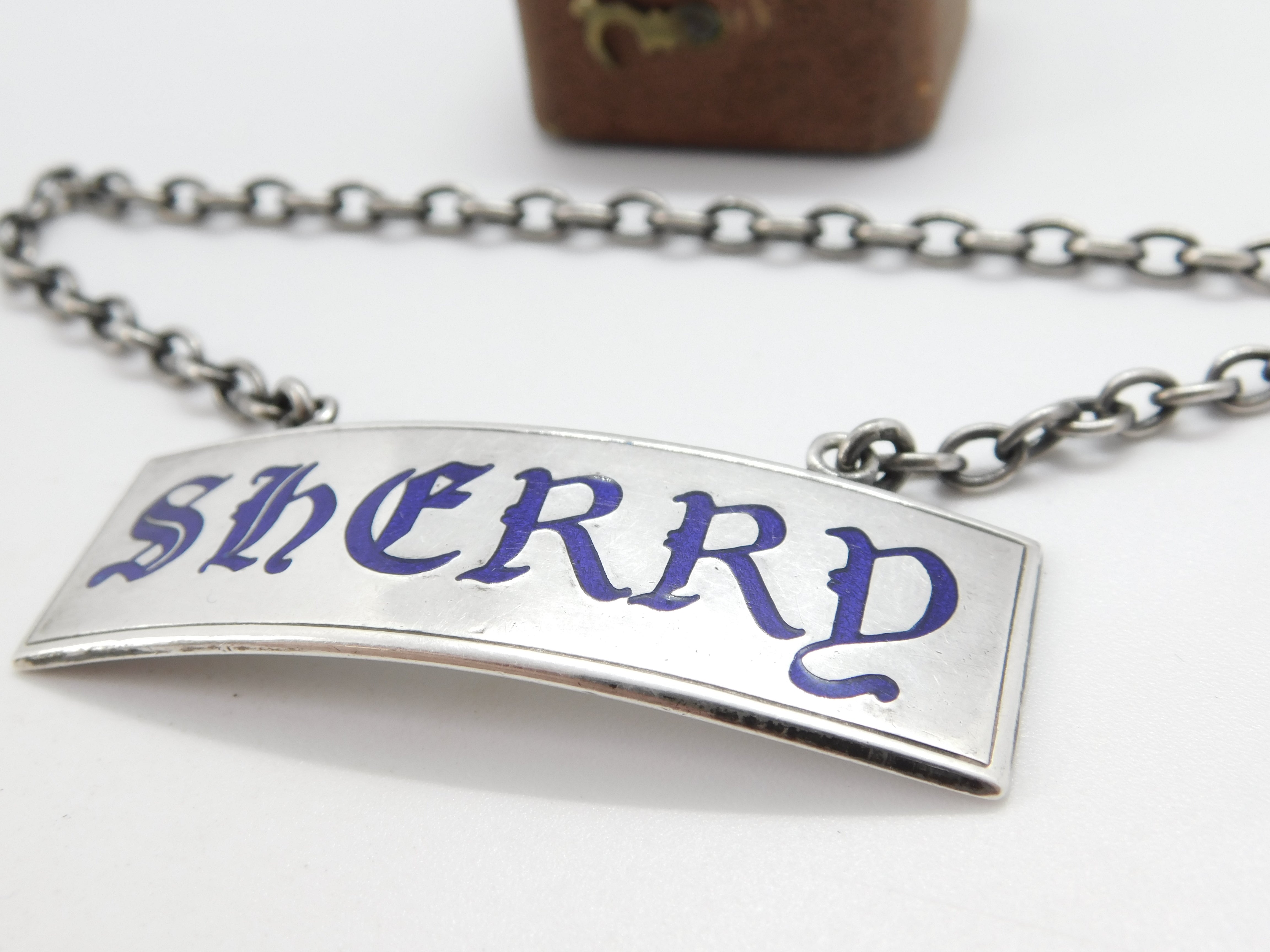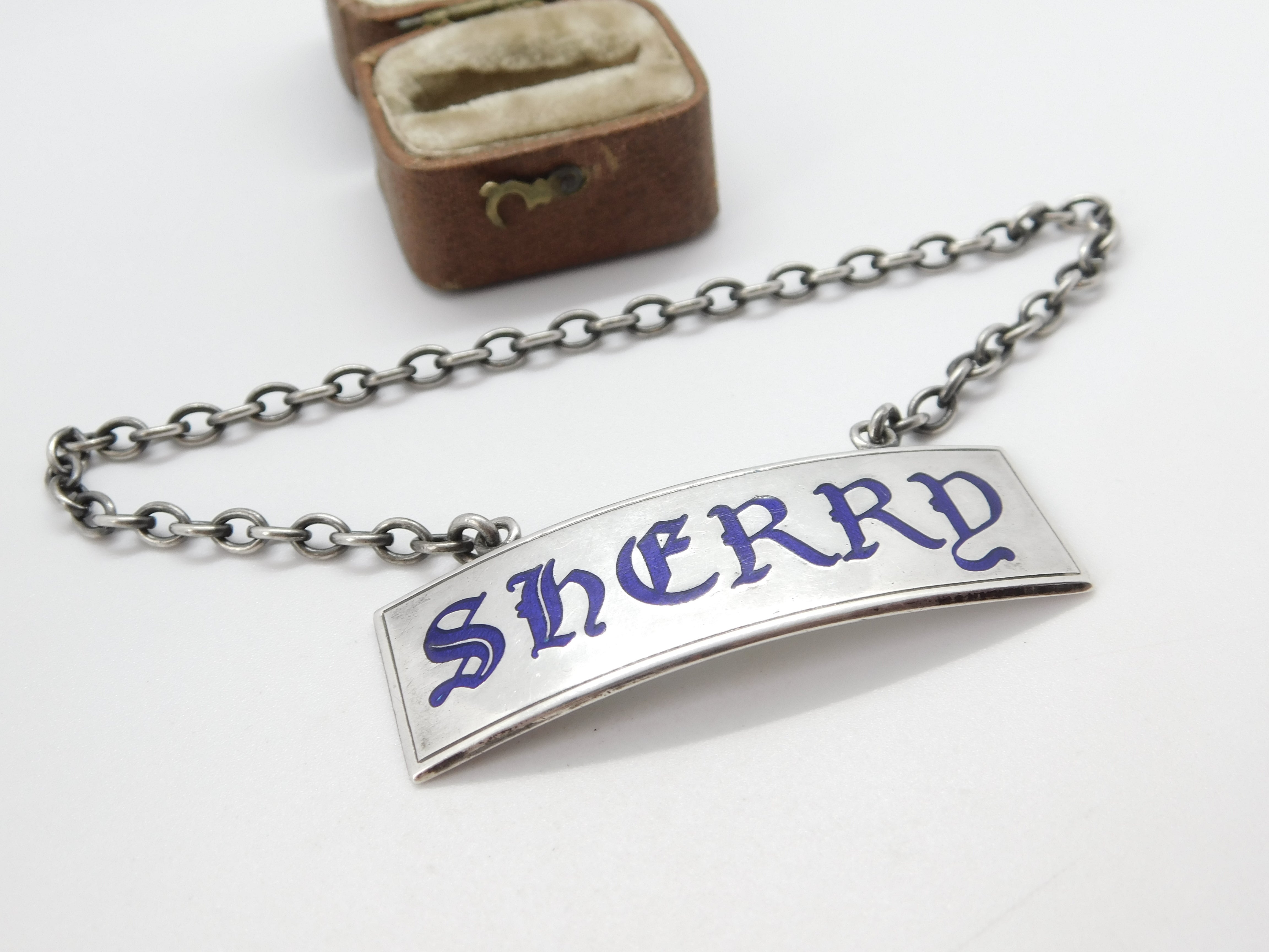 Details: A fantastic and wonderfully designed vintage sterling silver and blue enamel Sherry decanter label with lovely detailing hallmarked Birmingham, 1960 to the reverse. This is a wonderful item that would make a perfect gift or addition to any collection. The BOX pictured is for PRESENTATION ONLY and is NOT included in the listings but used to frame the pictures unless specifically stated otherwise.