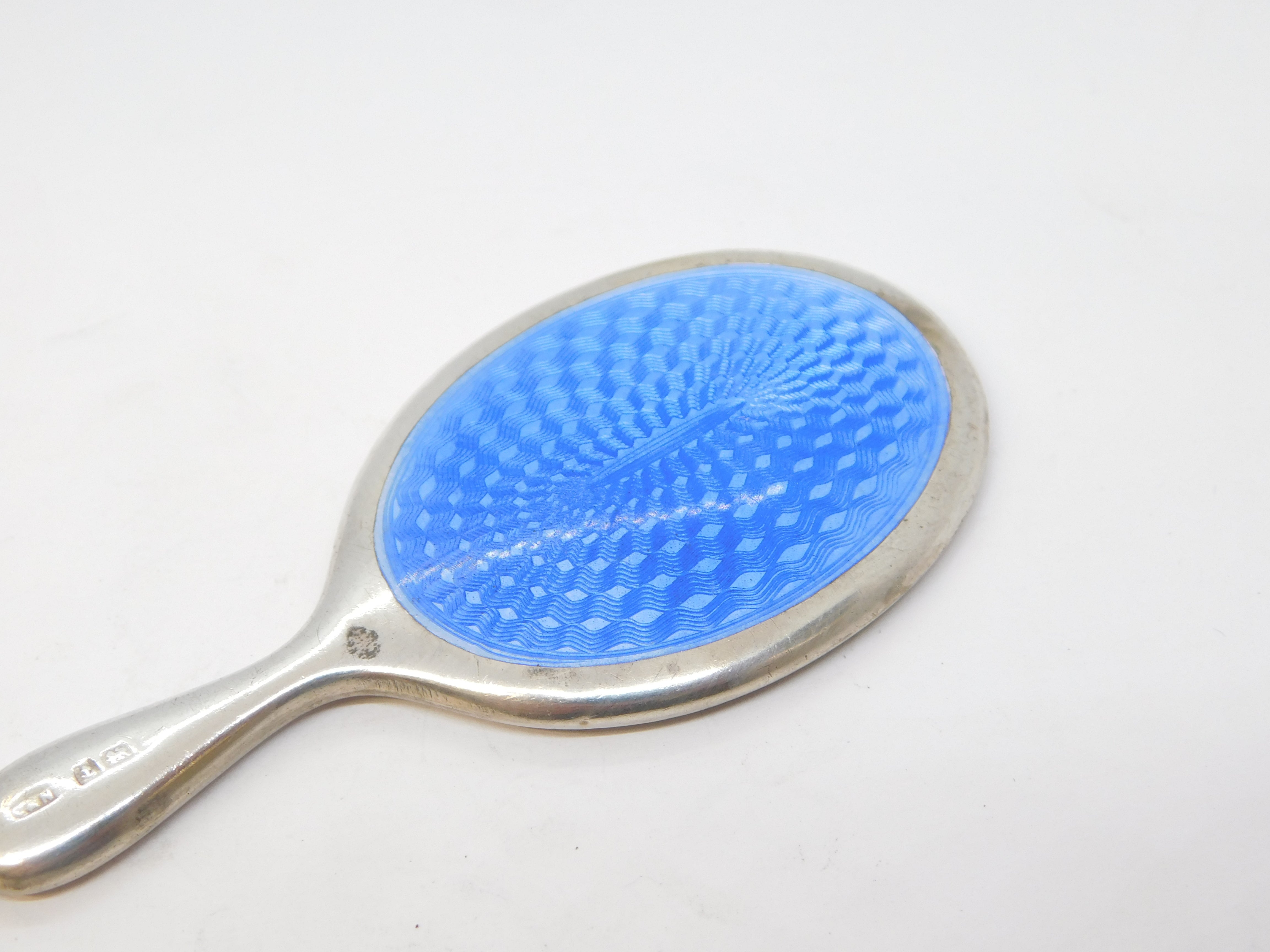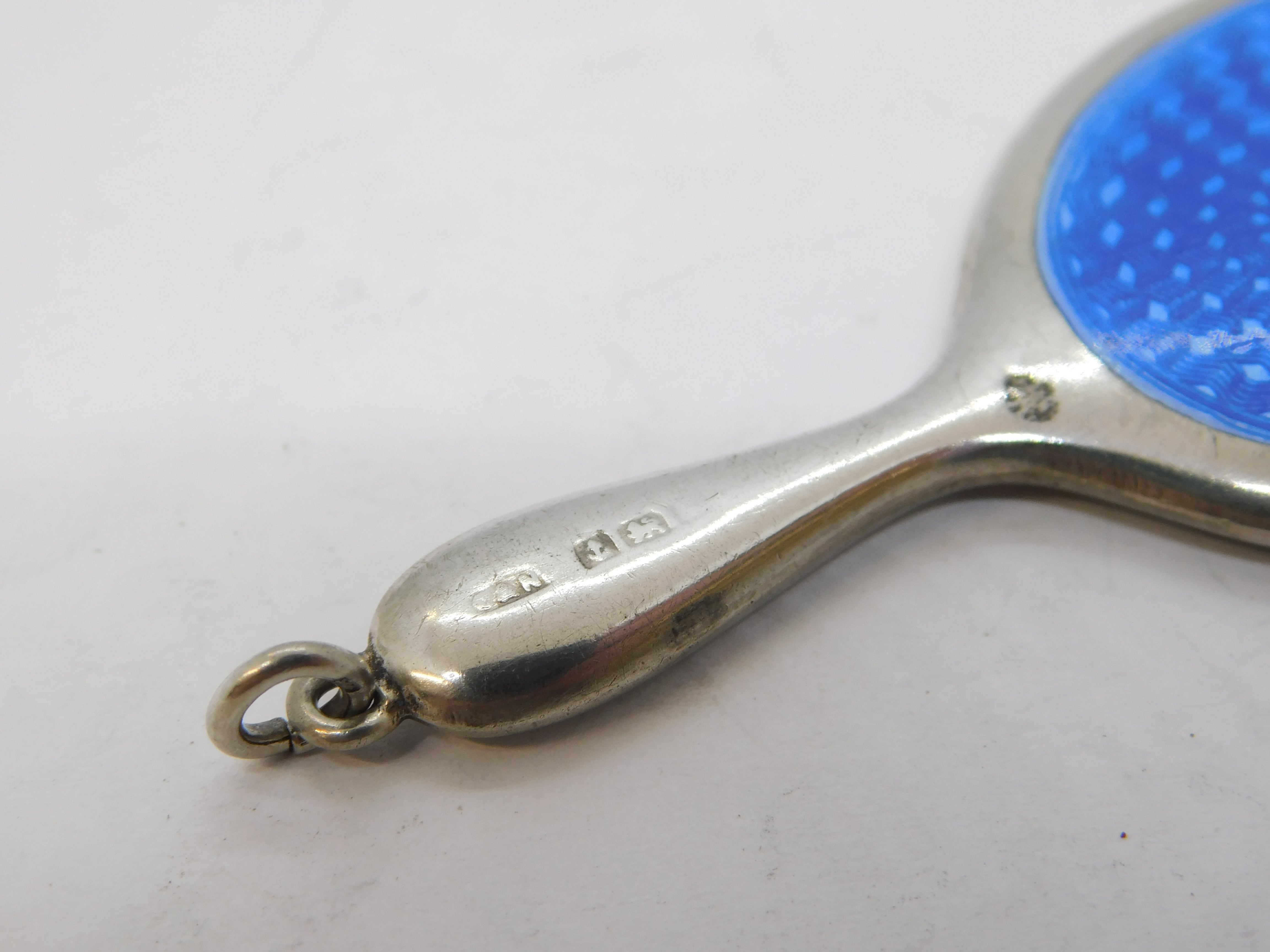 Sterling Silver Blue Guilloche Enamel Chatelaine Mirror Fob Antique 1924 Deco