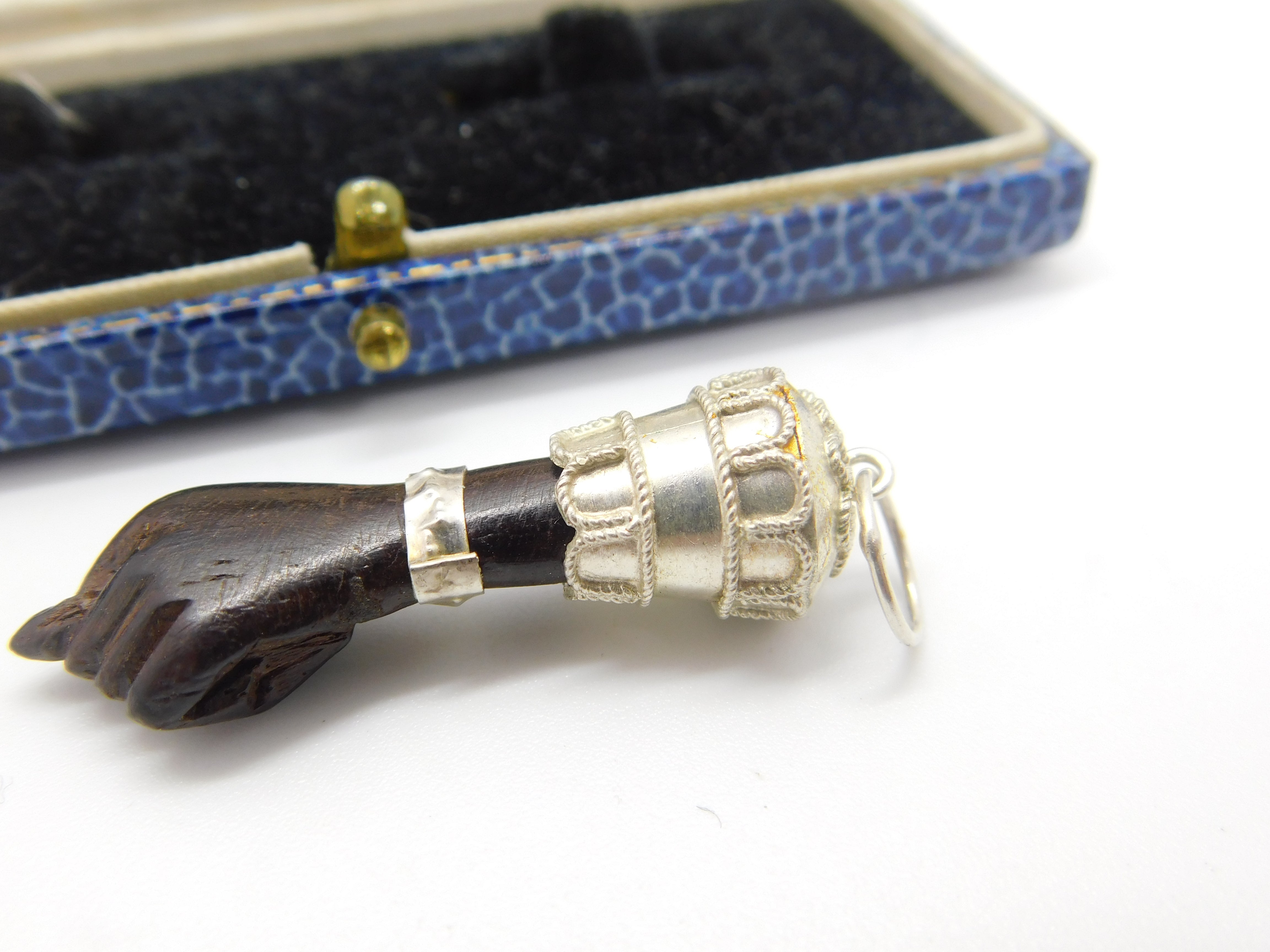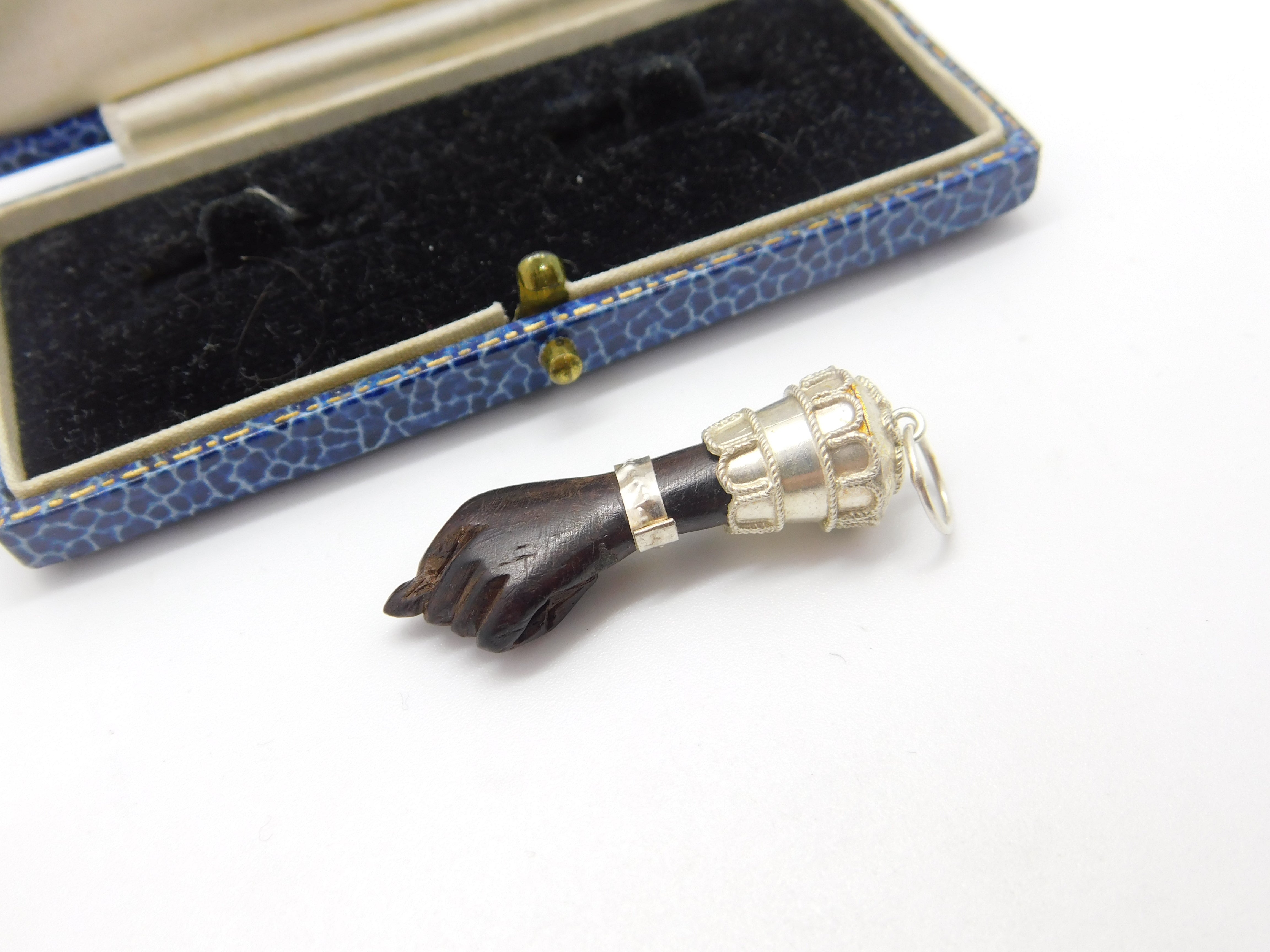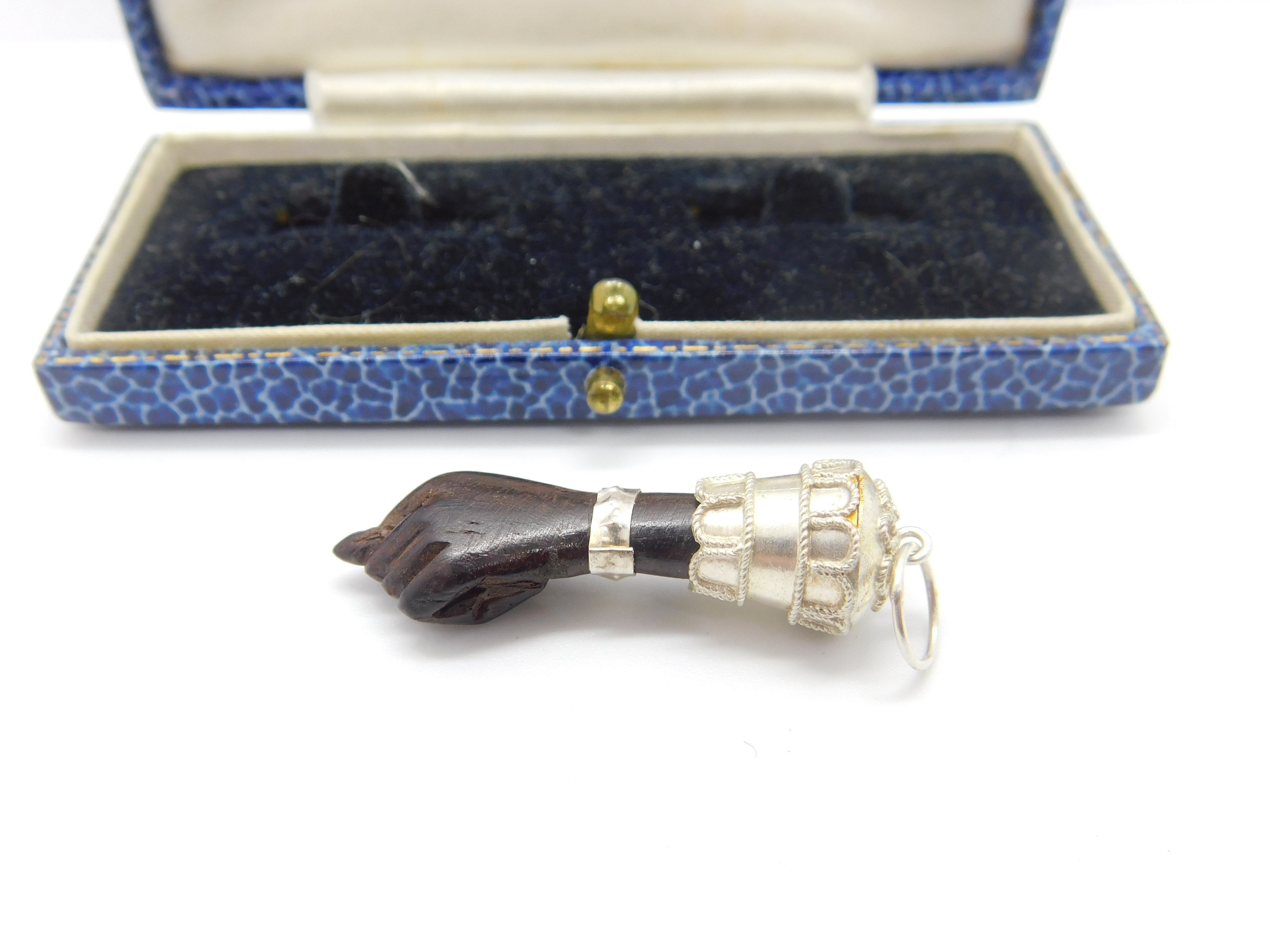Details: A fantastic and wonderfully designed antique art deco sterling silver and ebony wood figa hand pendant with lovely detailing c1920. This is a wonderful item that would make a perfect gift or addition to any collection. The BOX pictured is for PRESENTATION ONLY and is NOT included in the listings but used to frame the pictures unless specifically stated otherwise.