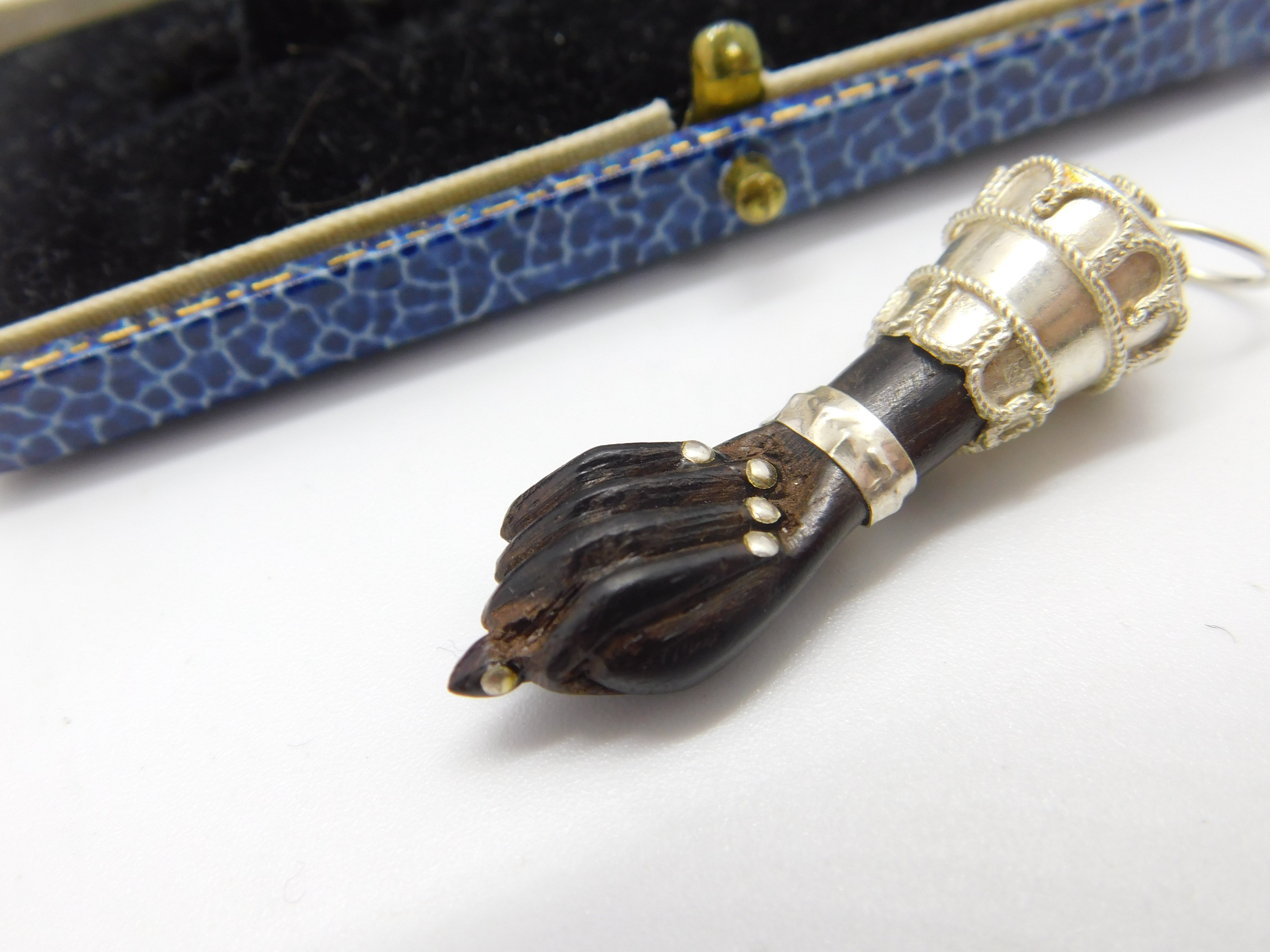 Sterling Silver & Carved Ebony Wood 'Figa' Hand Pendant Antique c1920 Deco