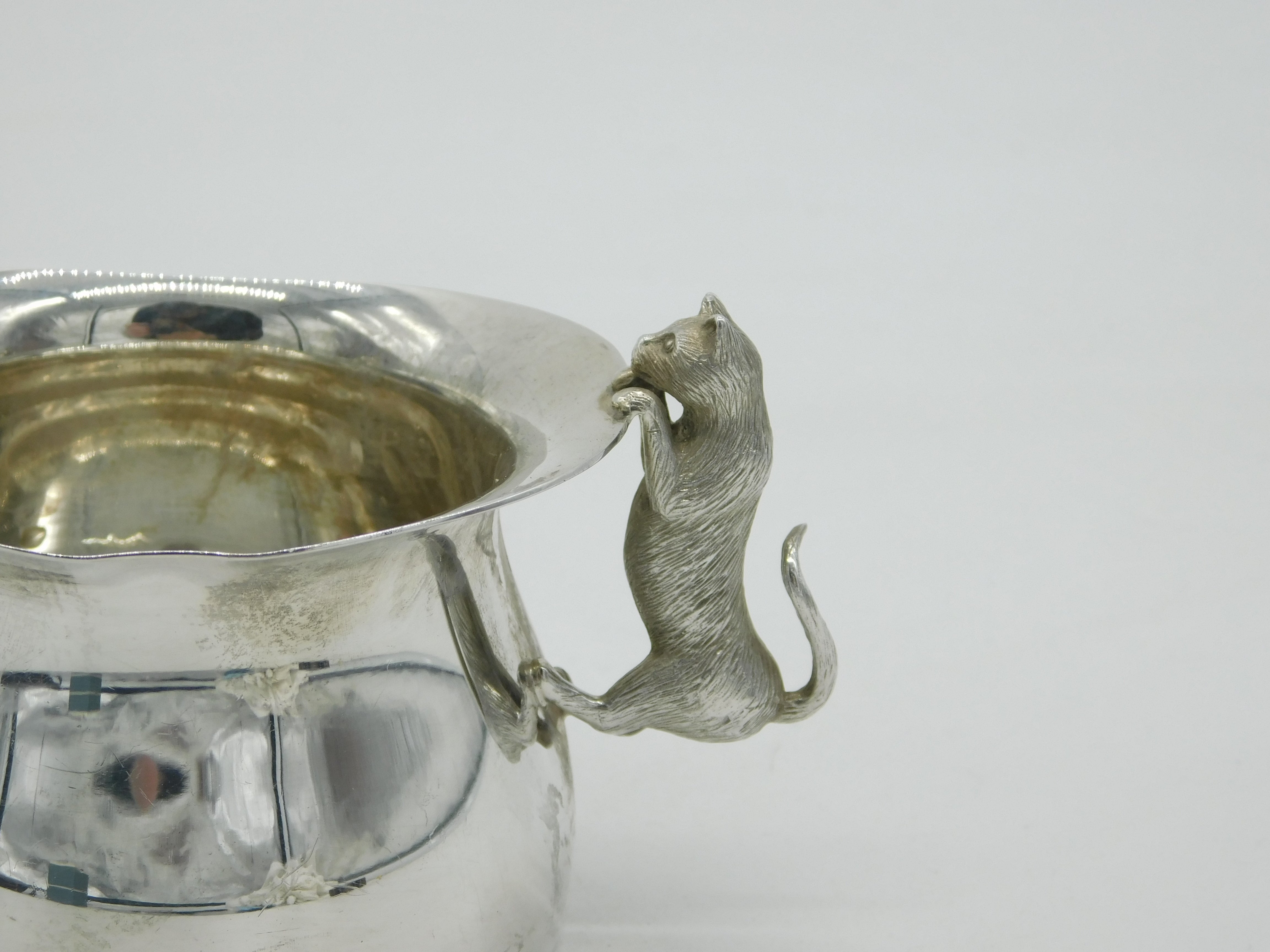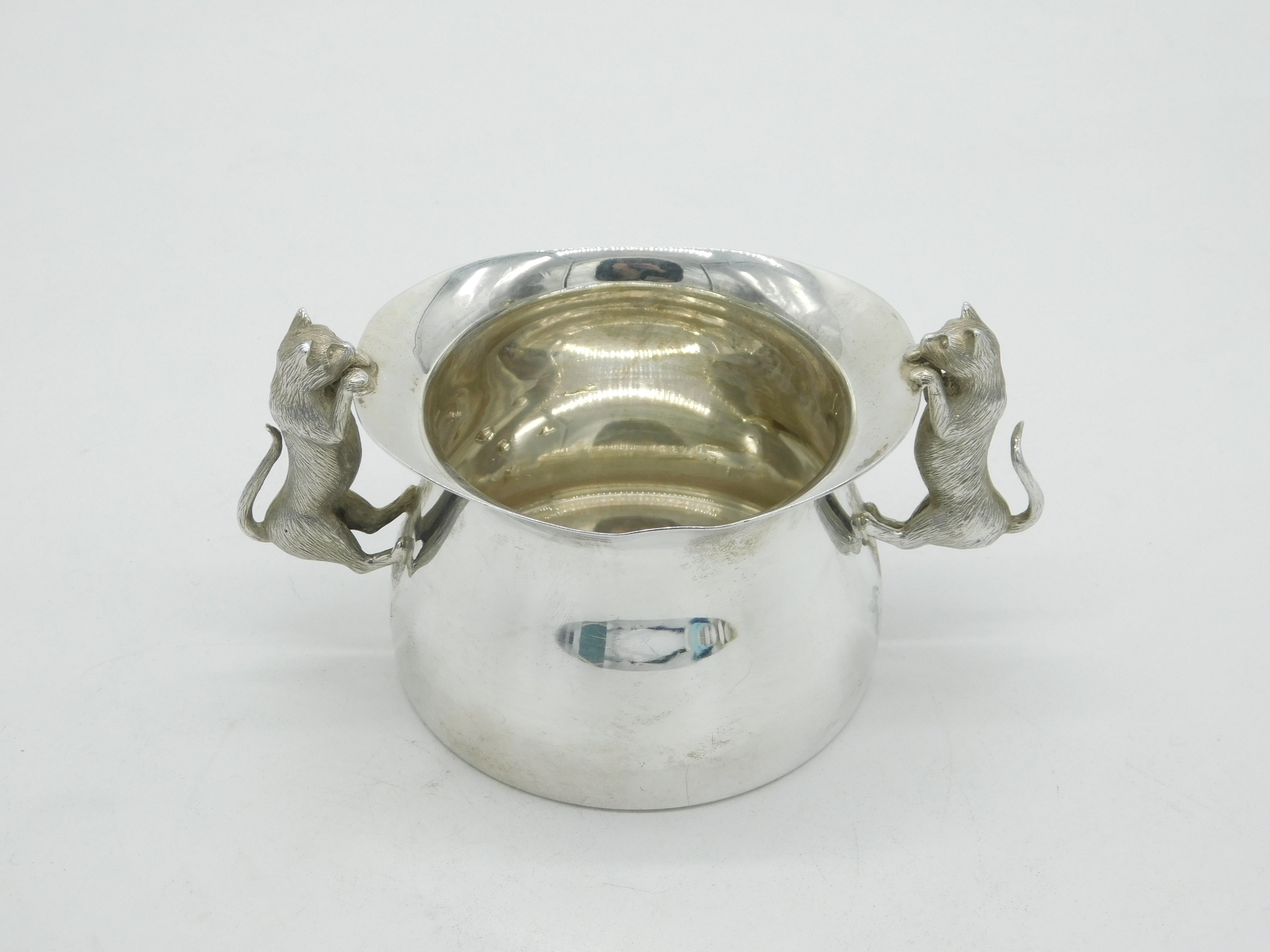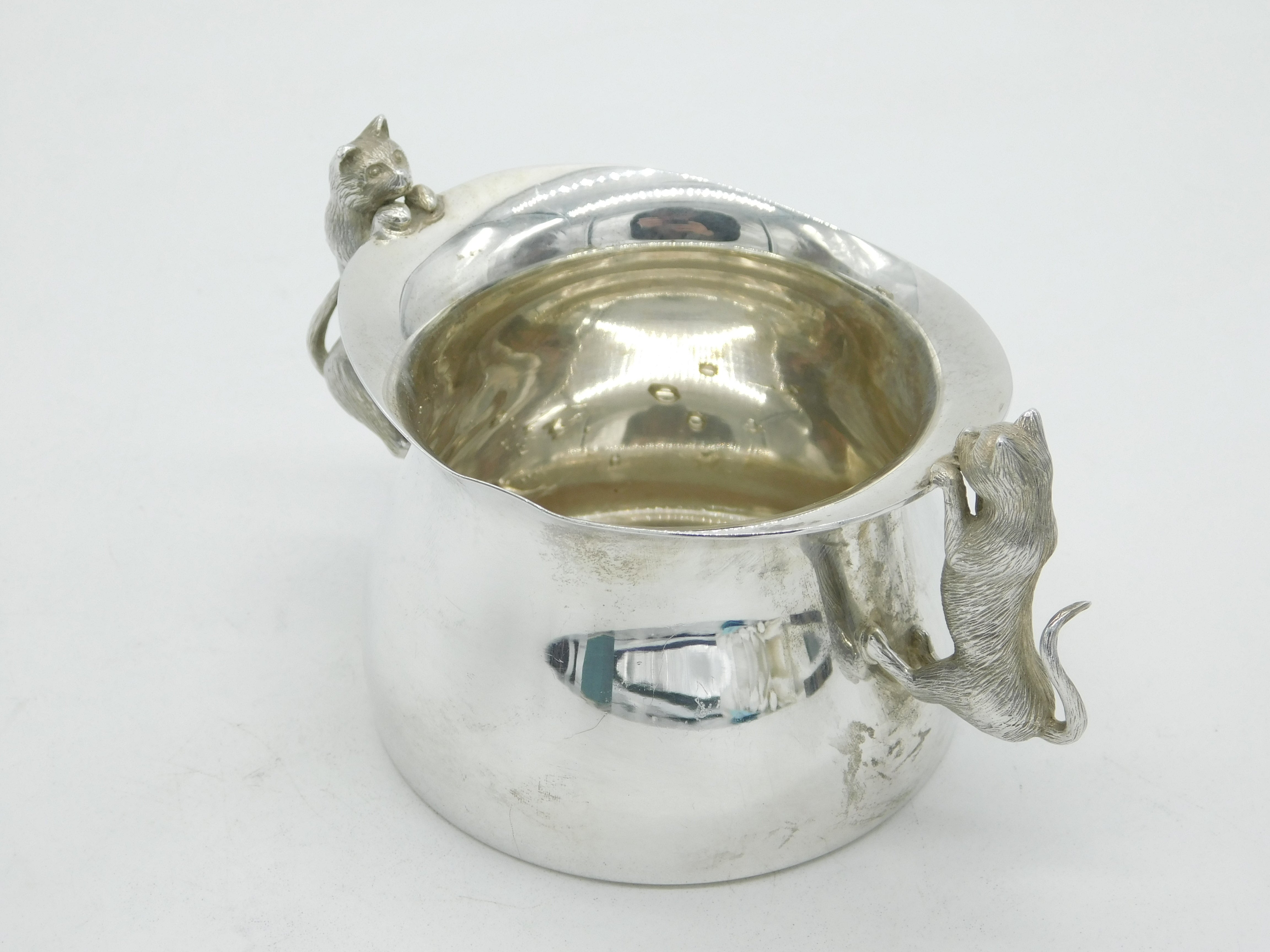 Details: A fantastic and wonderfully designed vintage sterling silver sugar bowl with superb cast cat or kitten handles, their heads poking out over the rim of the bowl, hallmarked London 1994 by Garrard & Co. Ltd. This is a wonderful item that would make a perfect gift or addition to any collection. The BOX pictured is for PRESENTATION ONLY and is NOT included in the listings but used to frame the pictures unless specifically stated otherwise.