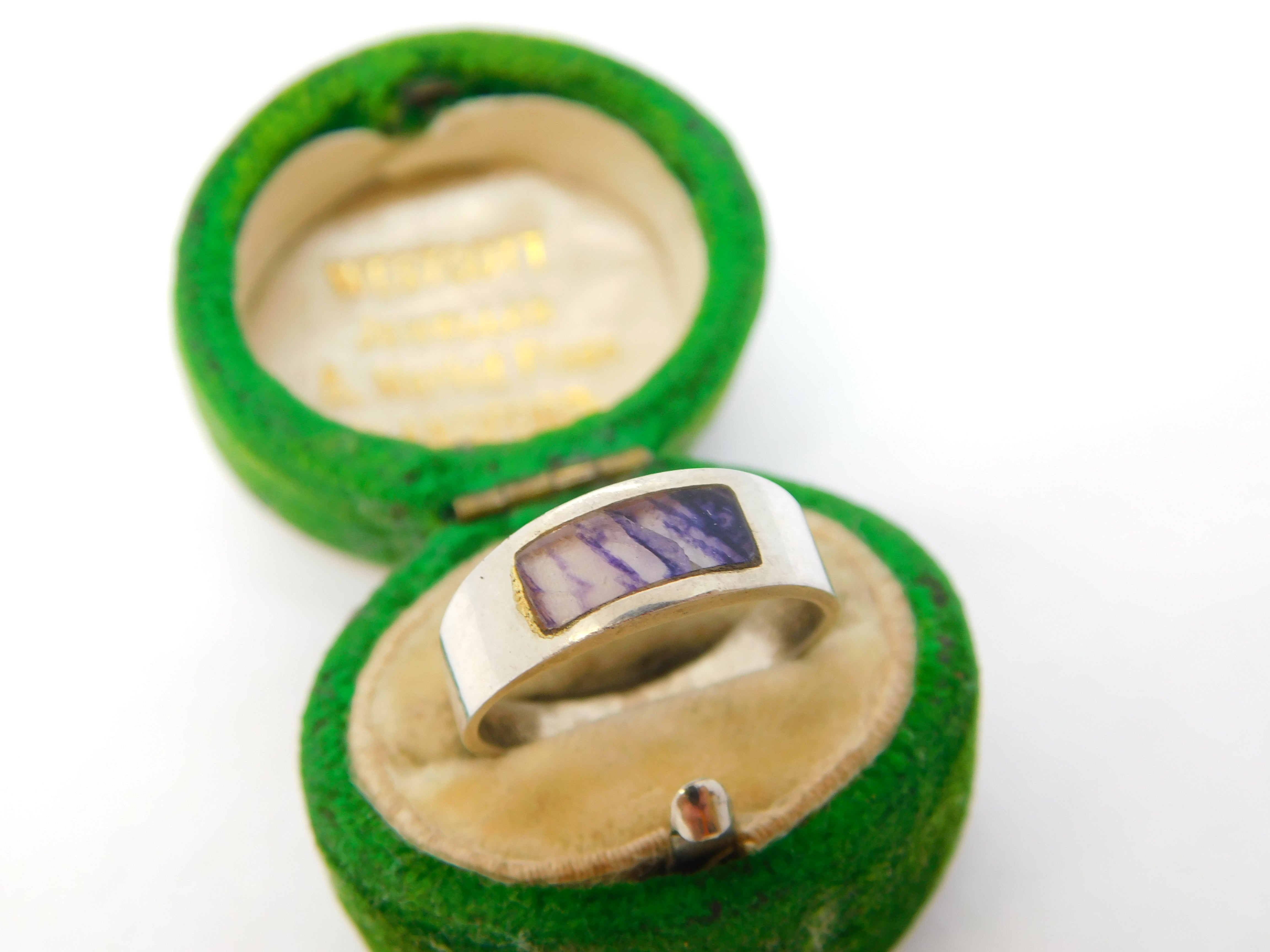 Details: A fantastic and wonderfully designed vintage sterling silver dress ring set with a charming section of Derbyshire Blue John hallmarked to the interior c1970. This is a wonderful item that would make a perfect gift or addition to any collection. The BOX pictured is for PRESENTATION ONLY and is NOT included in the listings but used to frame the pictures unless specifically stated otherwise.