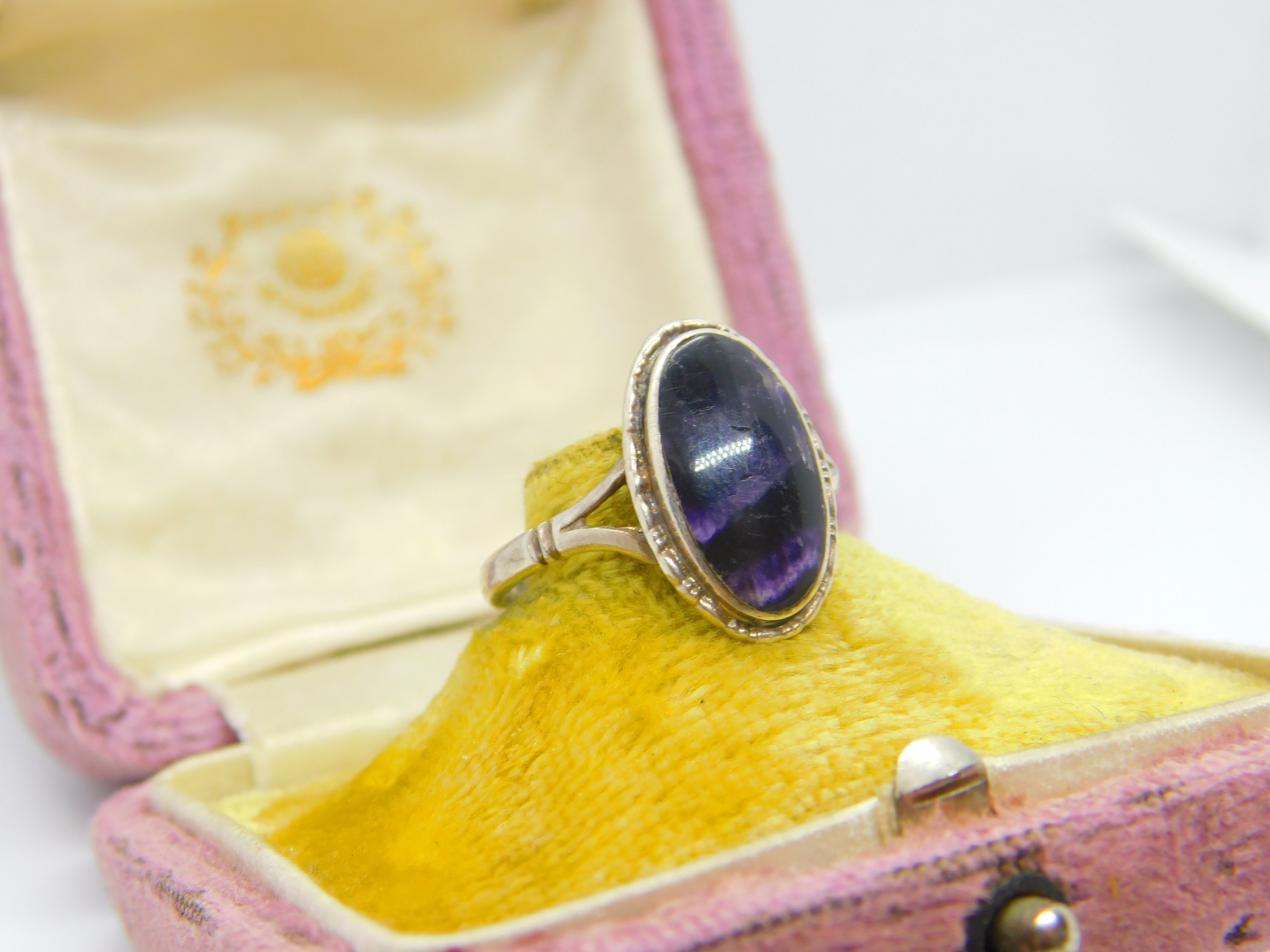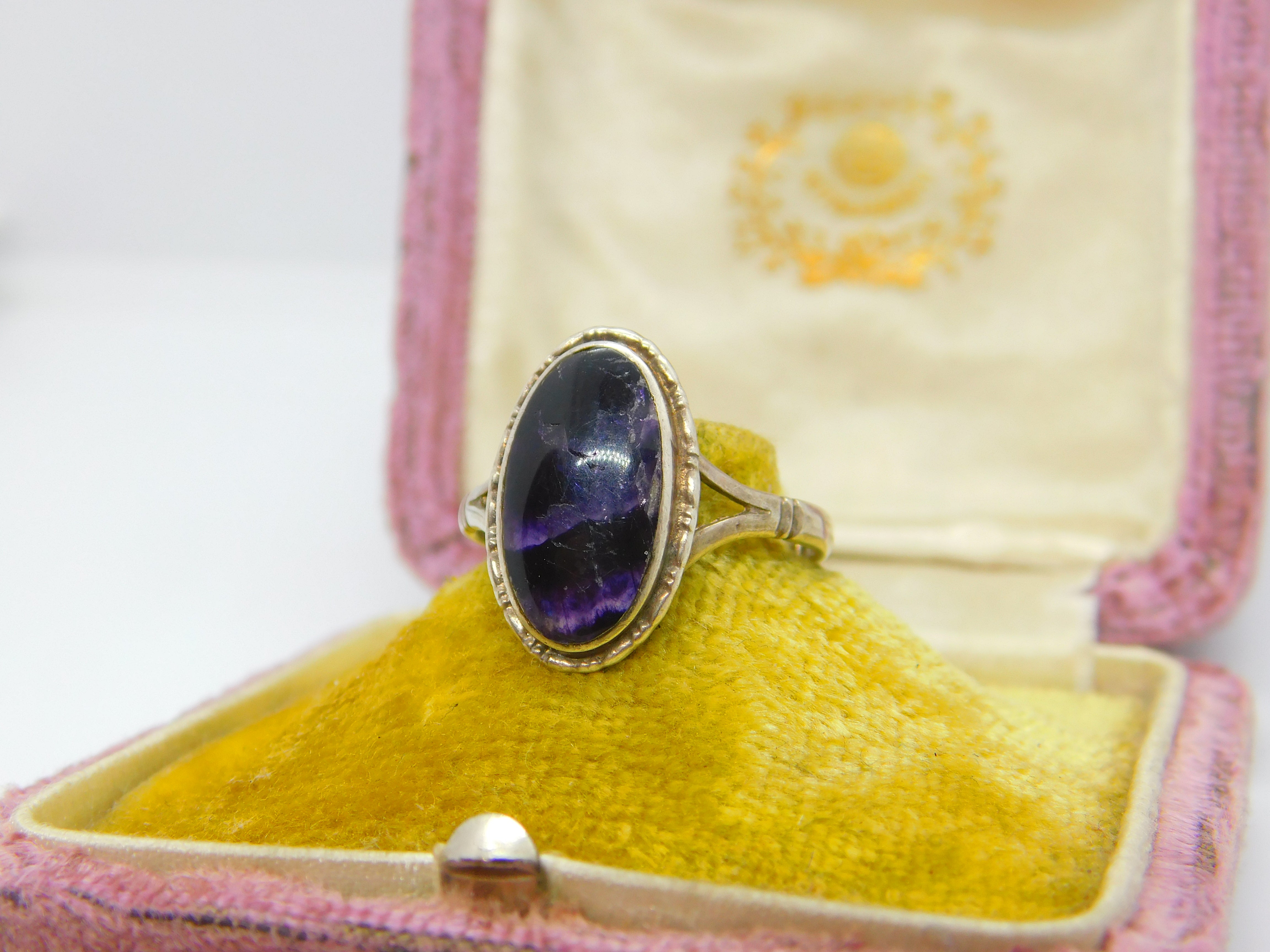 Details: A fantastic and wonderfully designed vintage sterling silver signet ring set with lovely Derbyshire Blue John stone hallmarked Birmingham 1978. This is a wonderful item that would make a perfect gift or addition to any collection. The BOX pictured is for PRESENTATION ONLY and is NOT included in the listings but used to frame the pictures unless specifically stated otherwise.