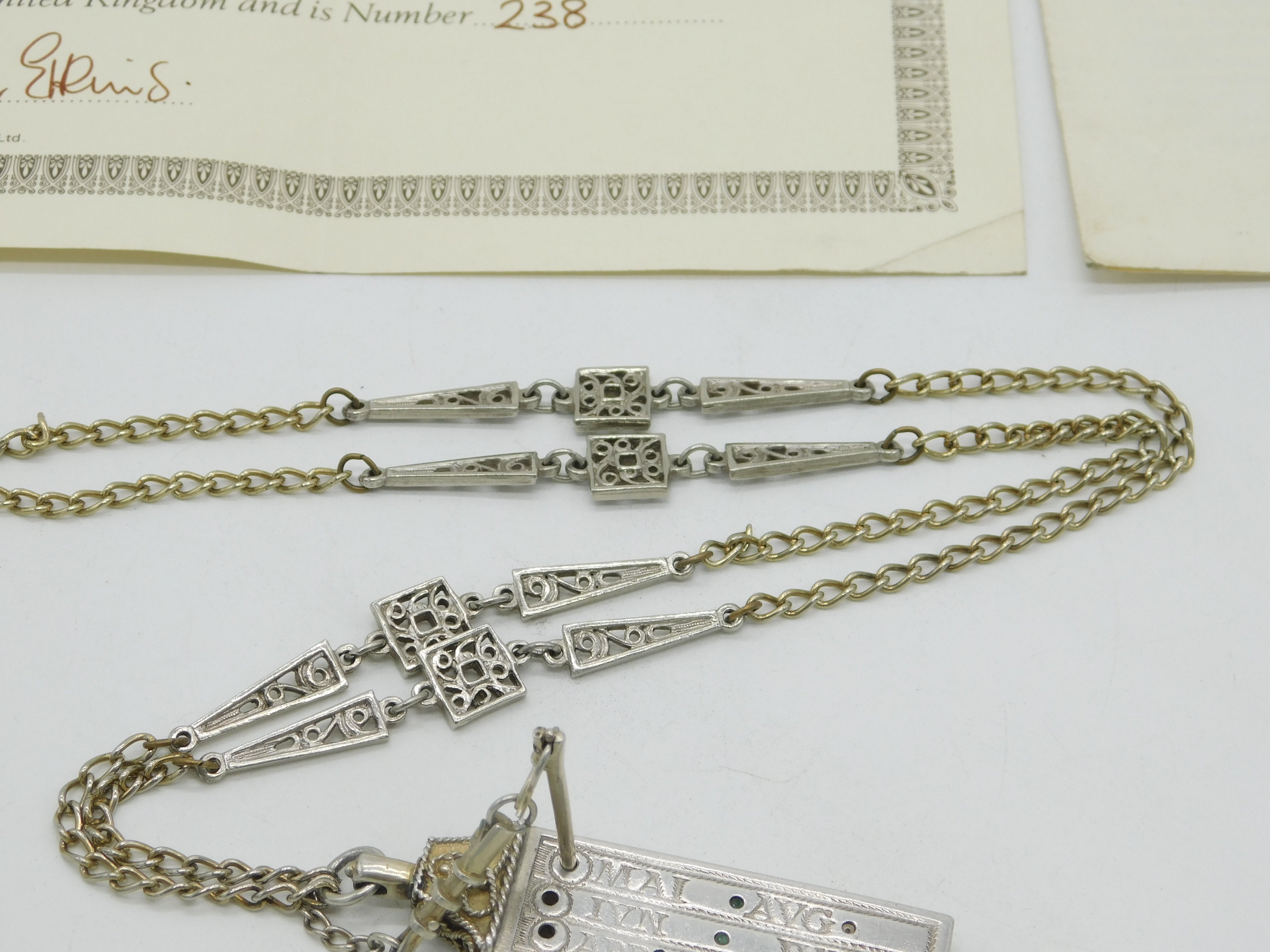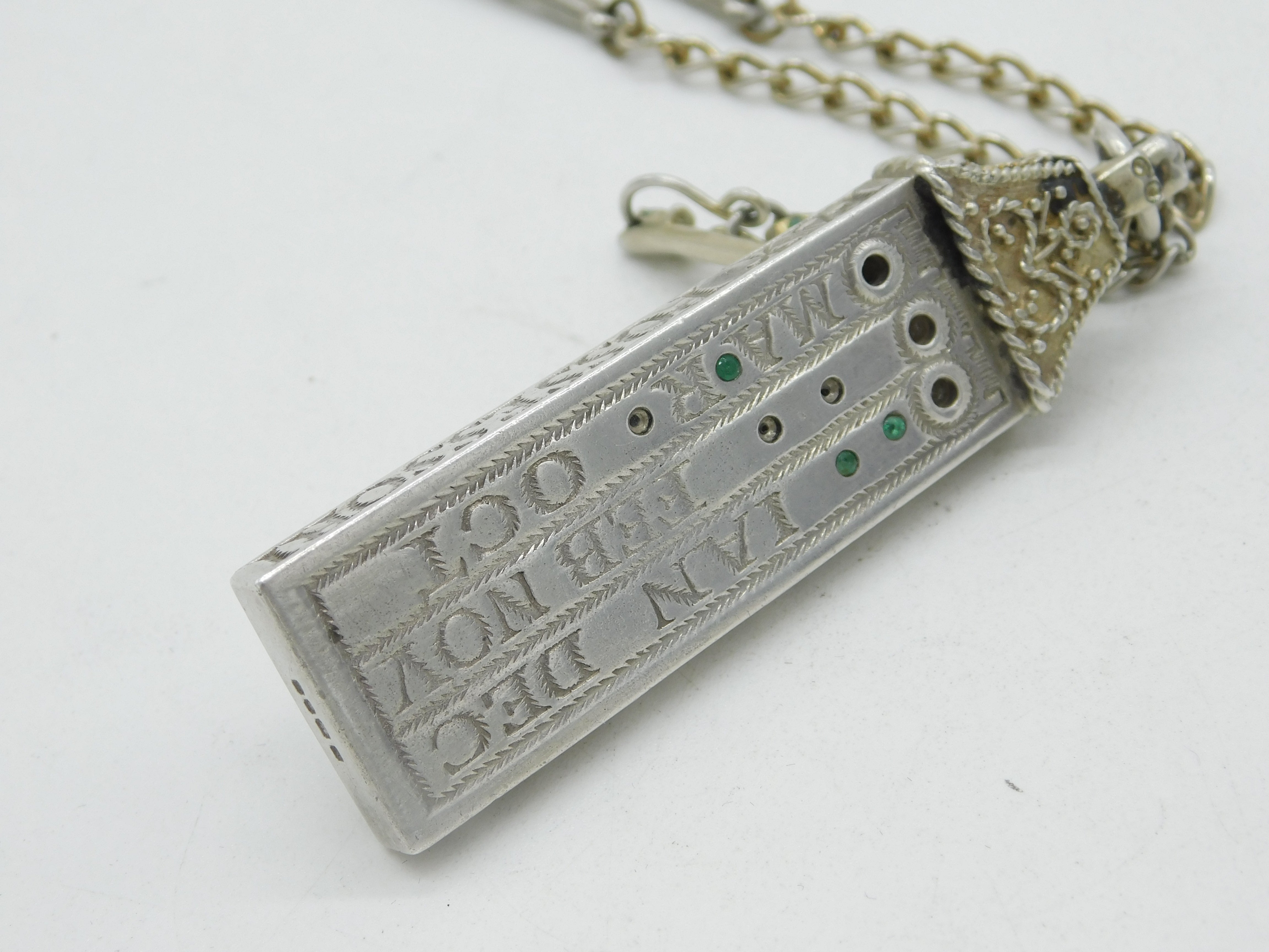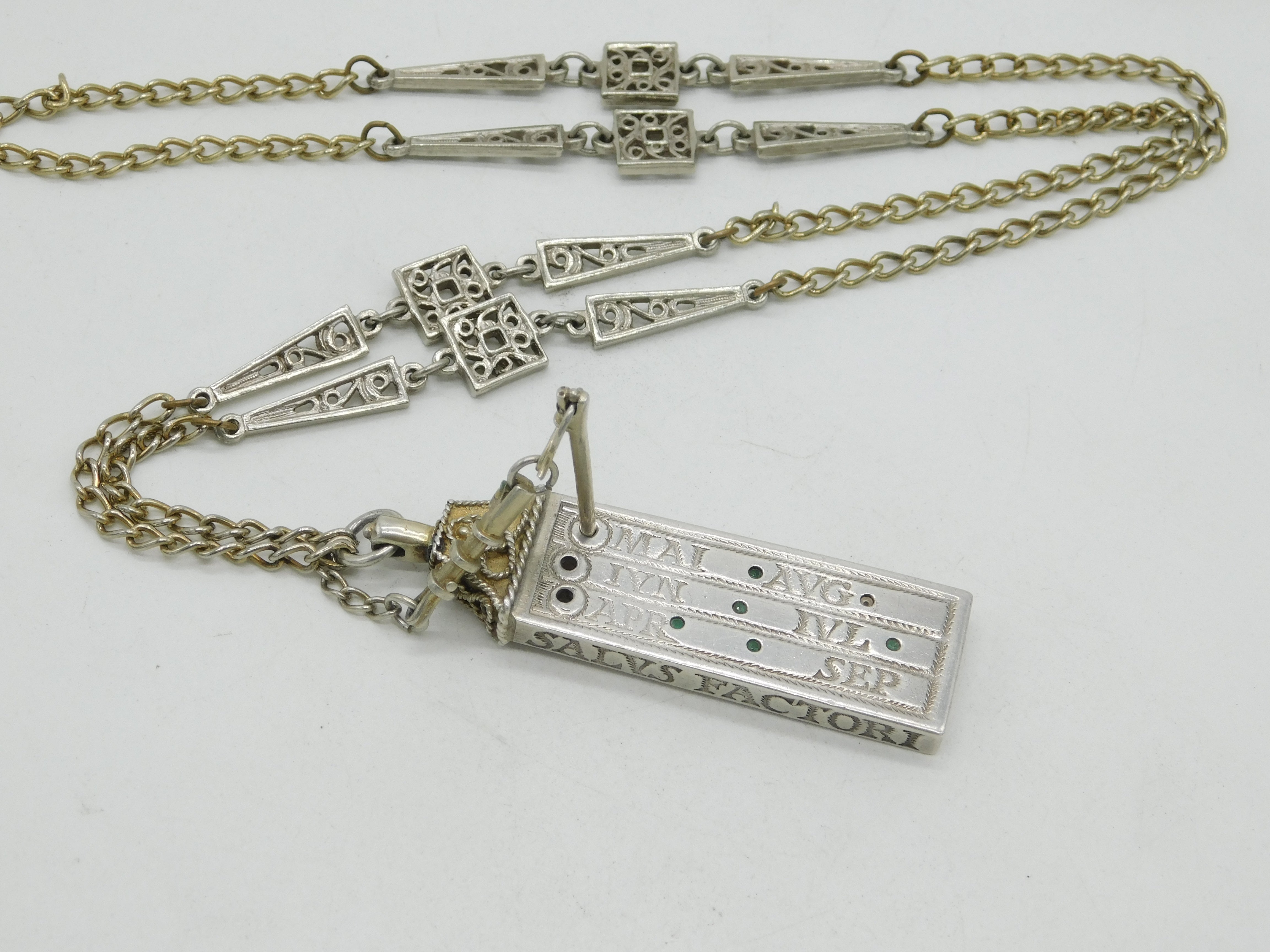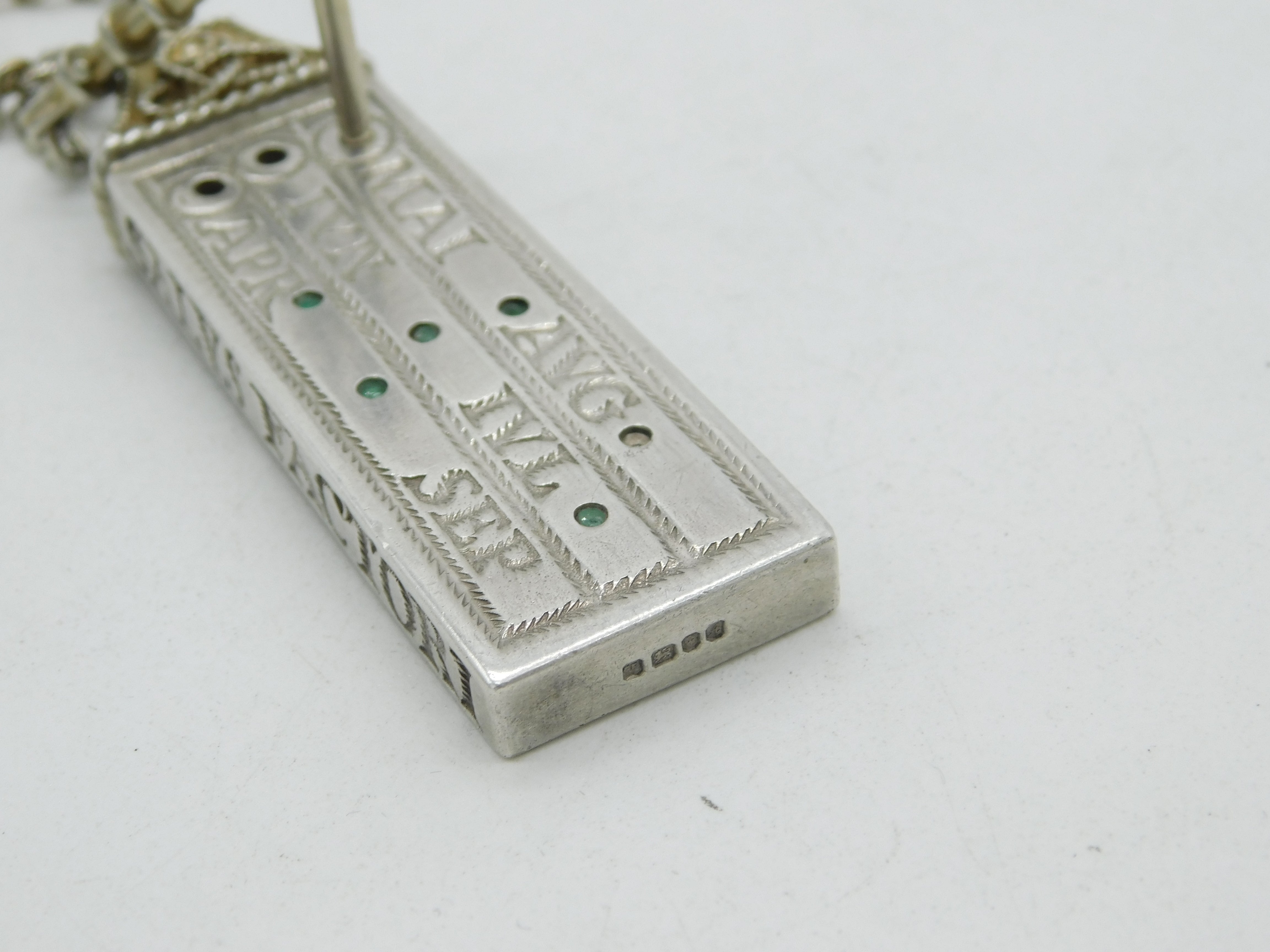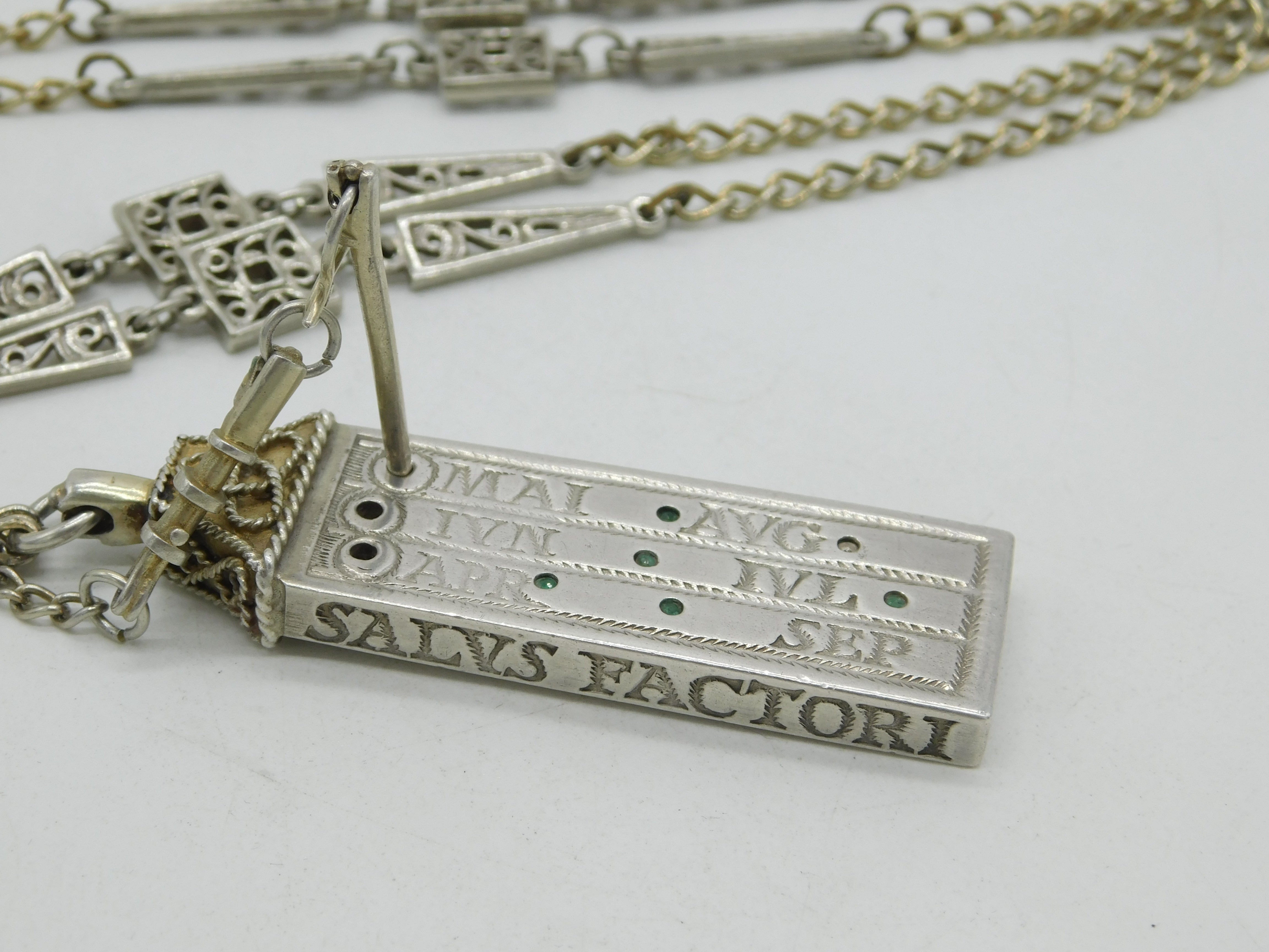 Details: A fantastic and wonderfully designed vintage sterling silver & emerald set replica of what is throughout to be the oldest 'watch' in the western world, a saxon sundial hallmarked London 1975 to the base and set on a long guard chain all hallmarked and included with paperwork. This is a wonderful item that would make a perfect gift or addition to any collection. The BOX pictured is for PRESENTATION ONLY and is NOT included in the listings but used to frame the pictures unless specifically stated otherwise.