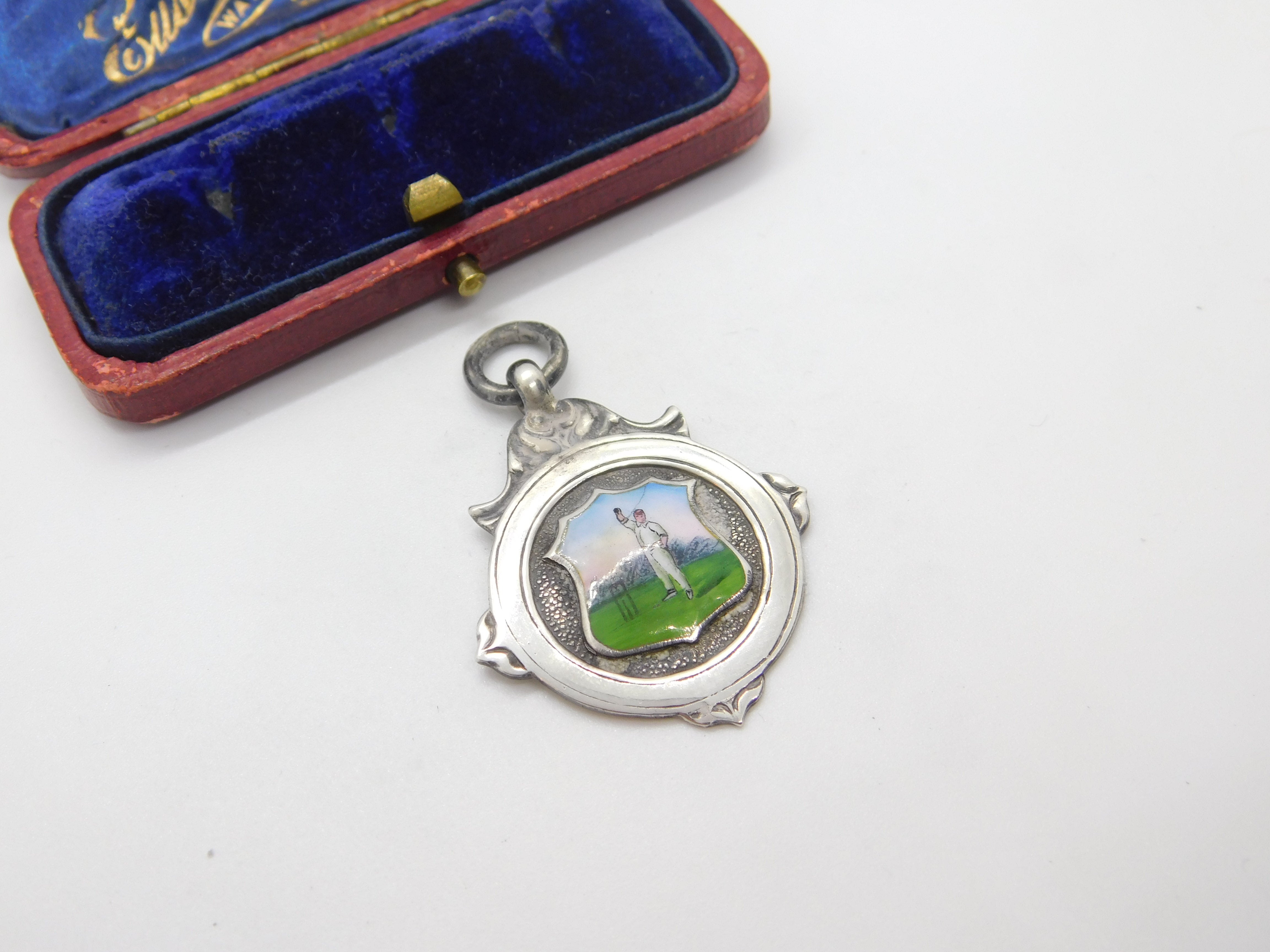 Sterling Silver & Enamel Cricket Bowling Fob Medal Antique 1928 Birmingham