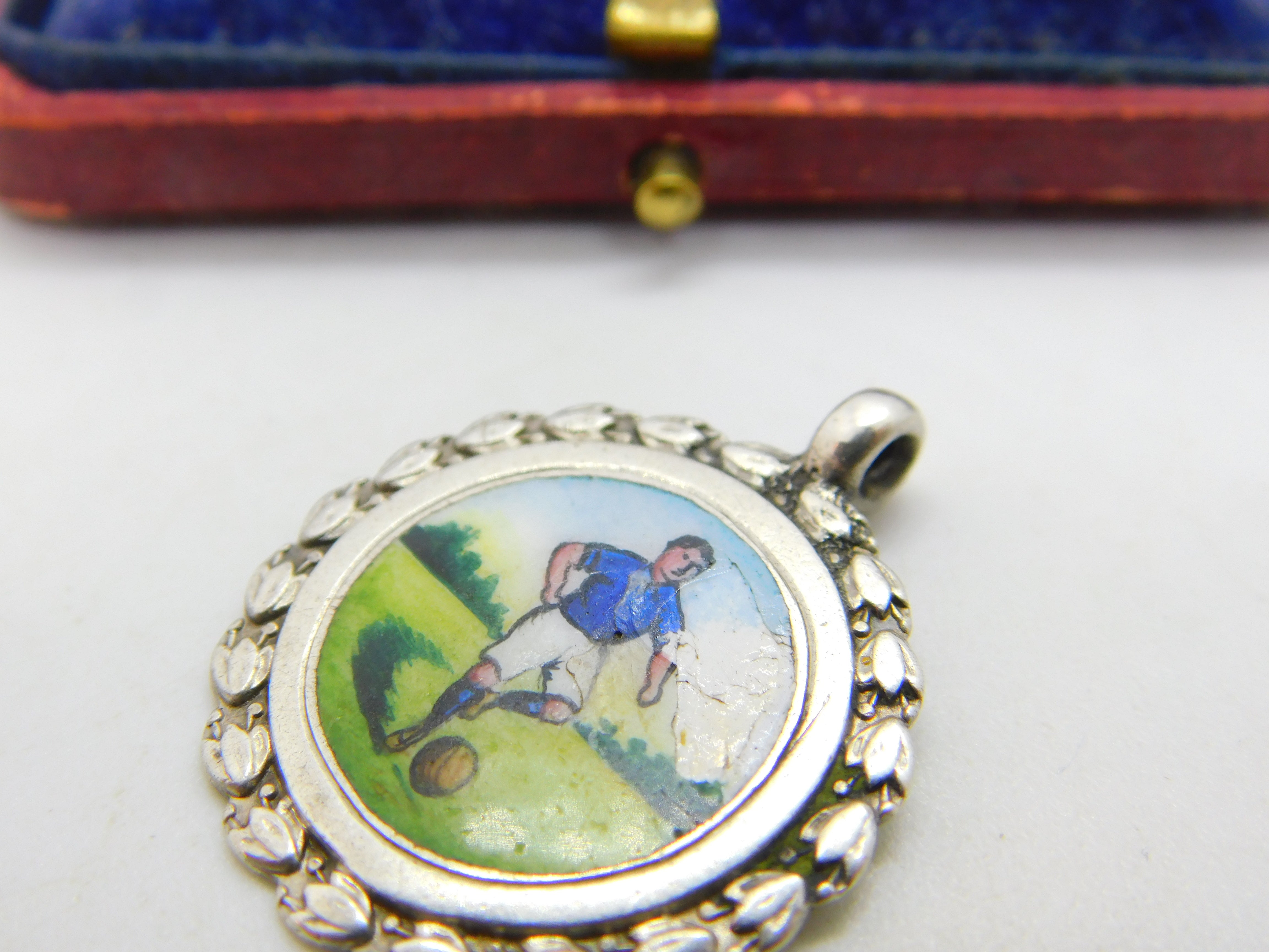 Details: A fantastic and wonderfully designed antique art deco sterling silver colourful enamel football soccer player sporting fob medal hallmarked Birmingham 1922 to the reverse. Chip to the left side of the enamel. This is a wonderful item that would make a perfect gift or addition to any collection. The BOX pictured is for PRESENTATION ONLY and is NOT included in the listings but used to frame the pictures unless specifically stated otherwise.