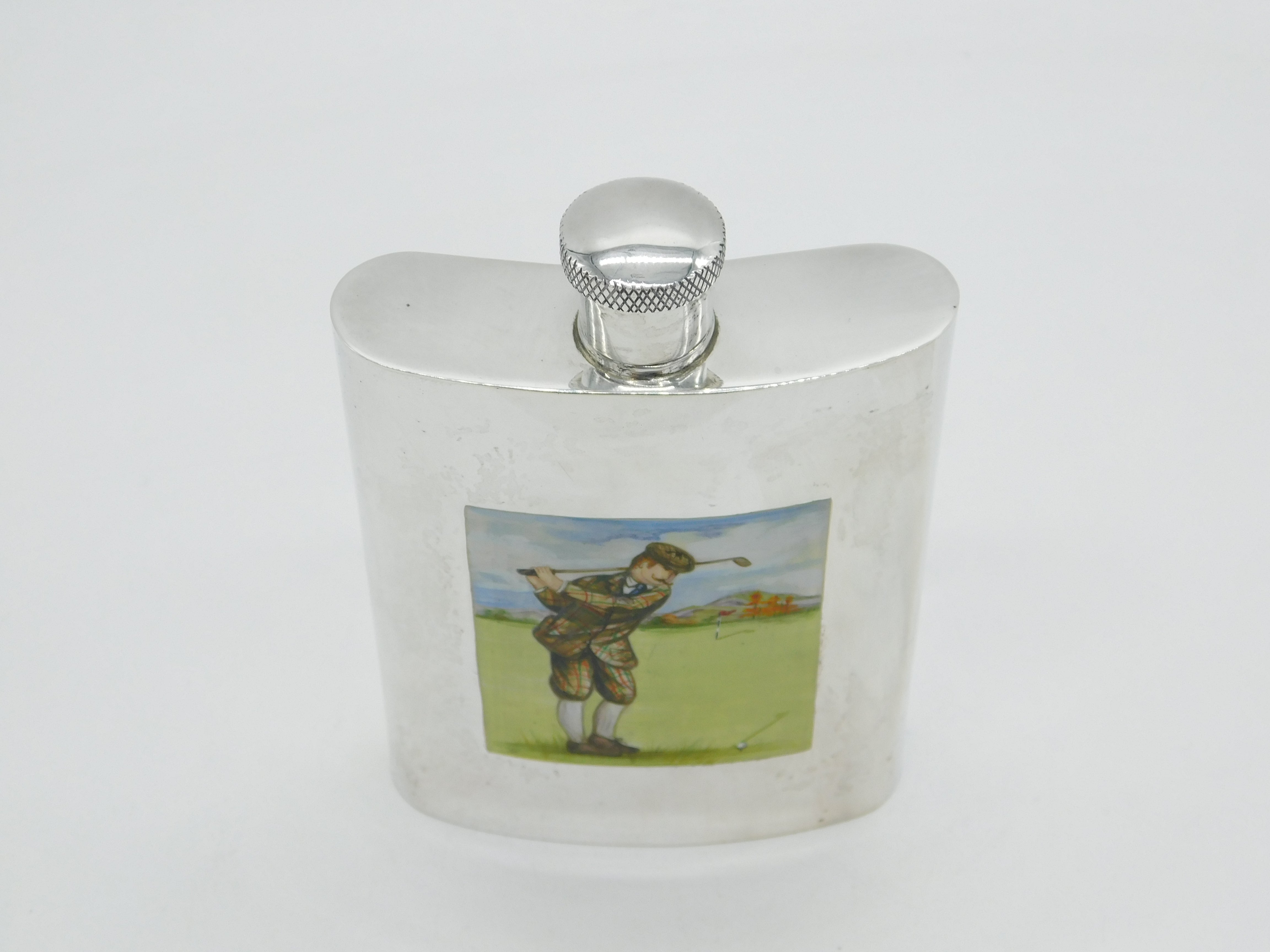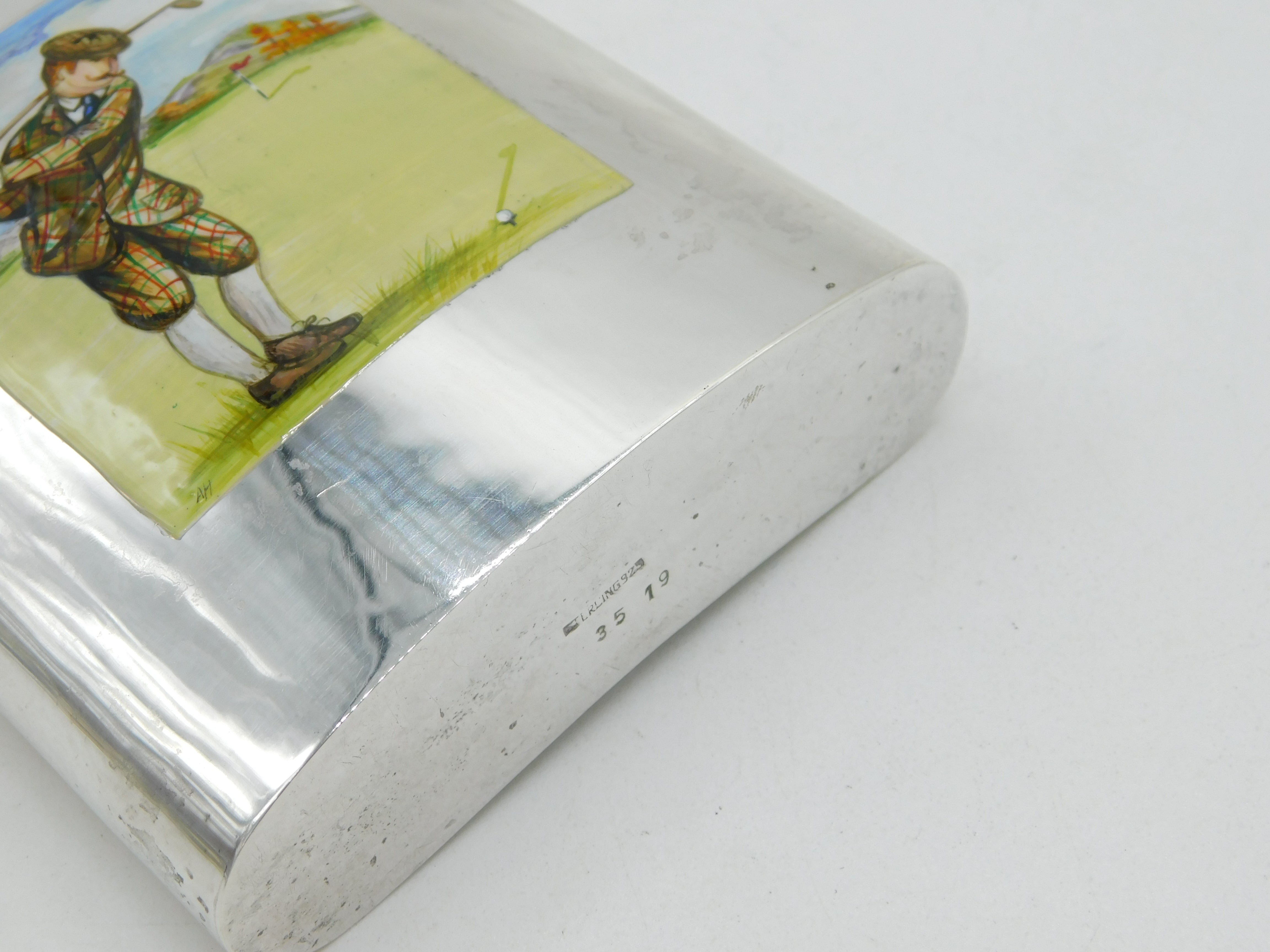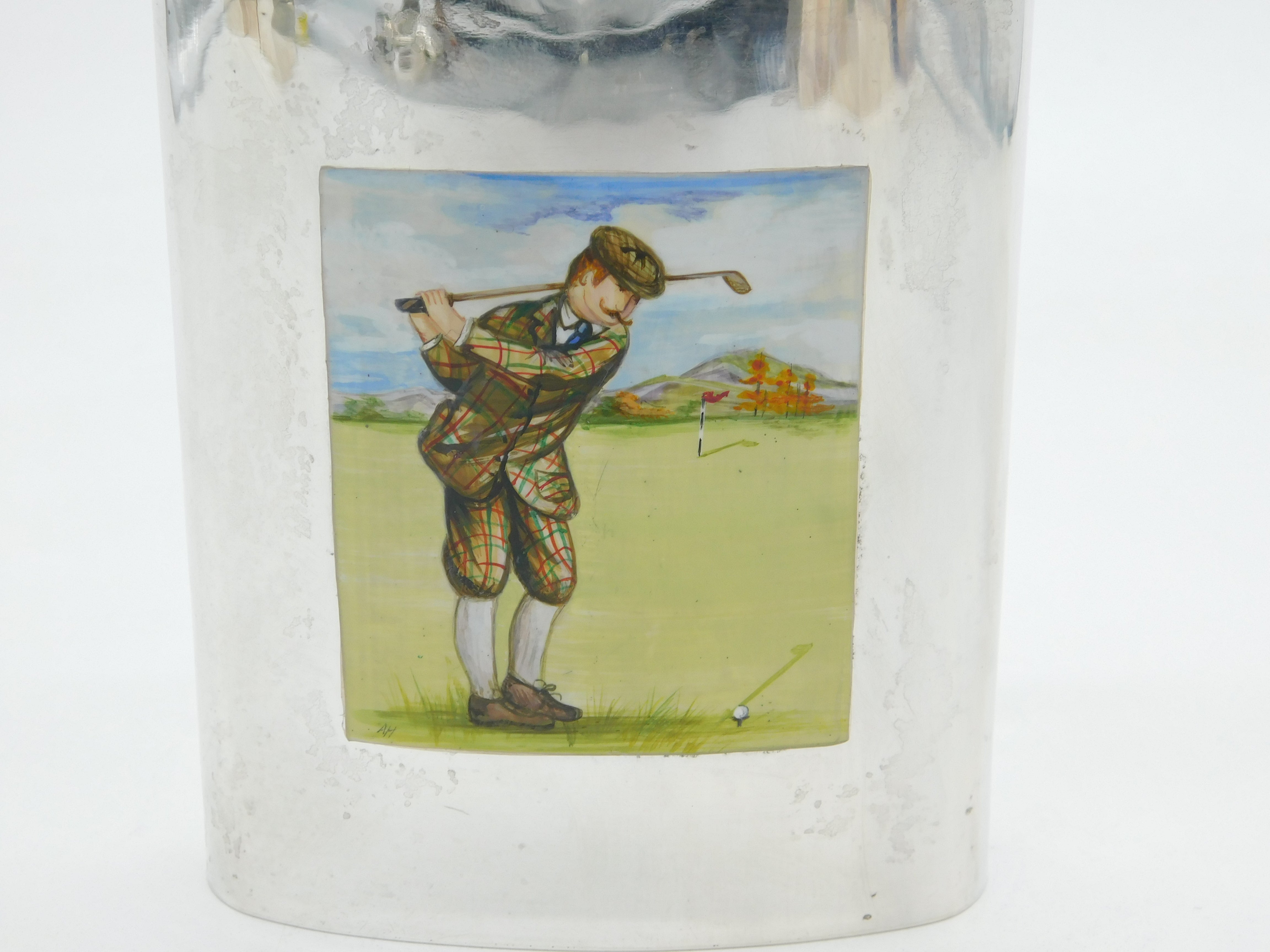 Sterling Silver & Enamel Golfing Scene Hip Flask Antique c1920 Art Deco