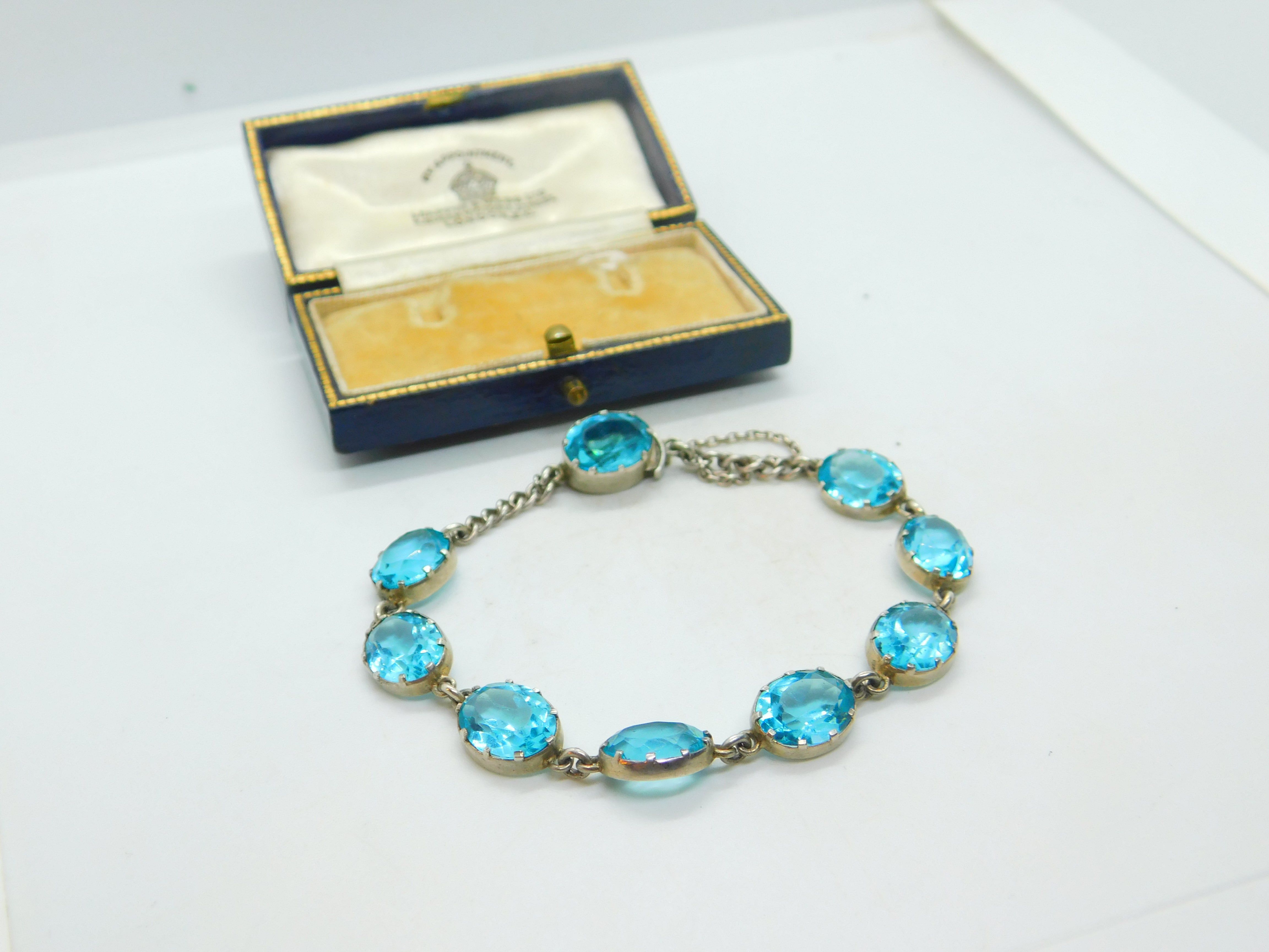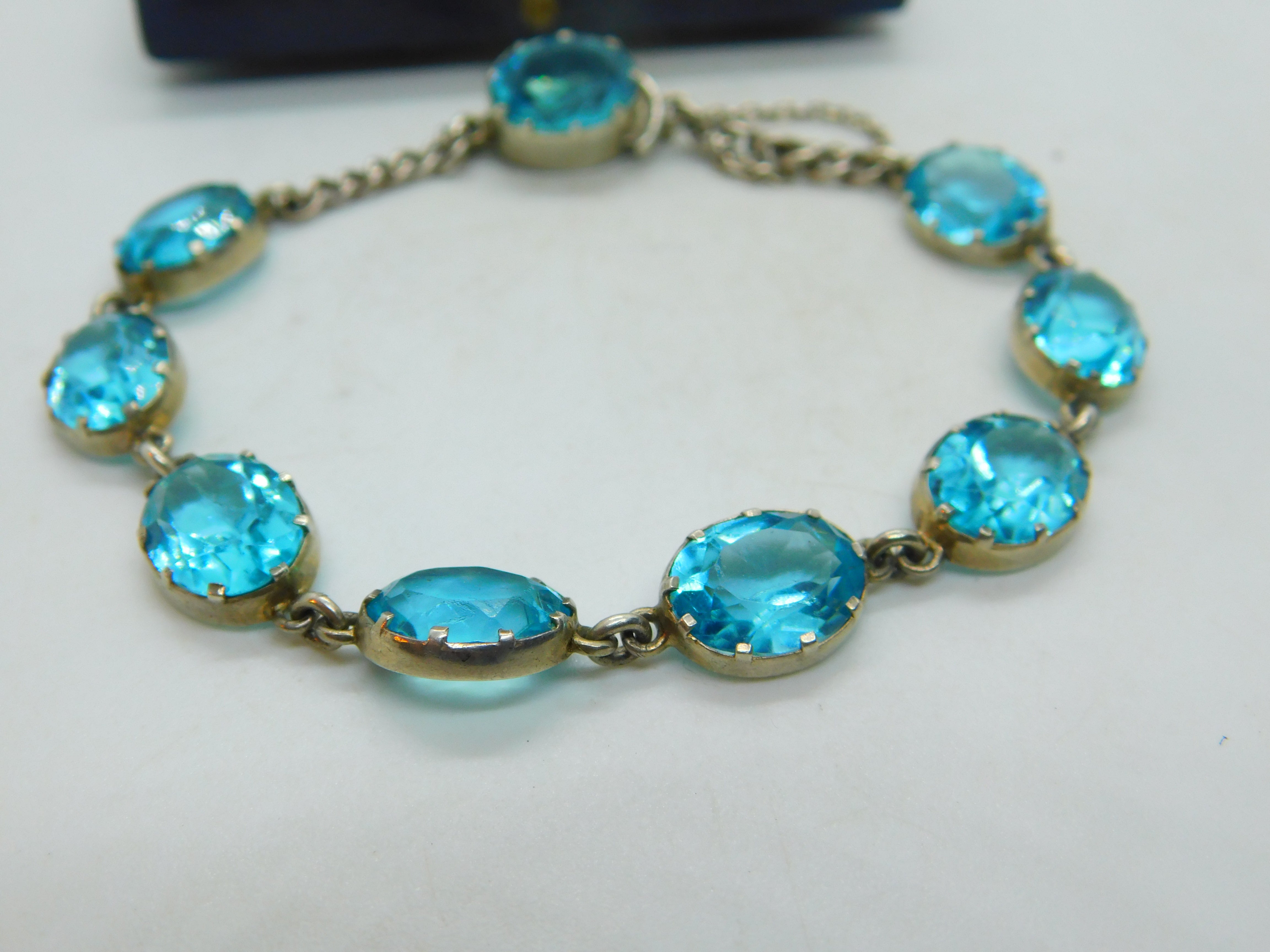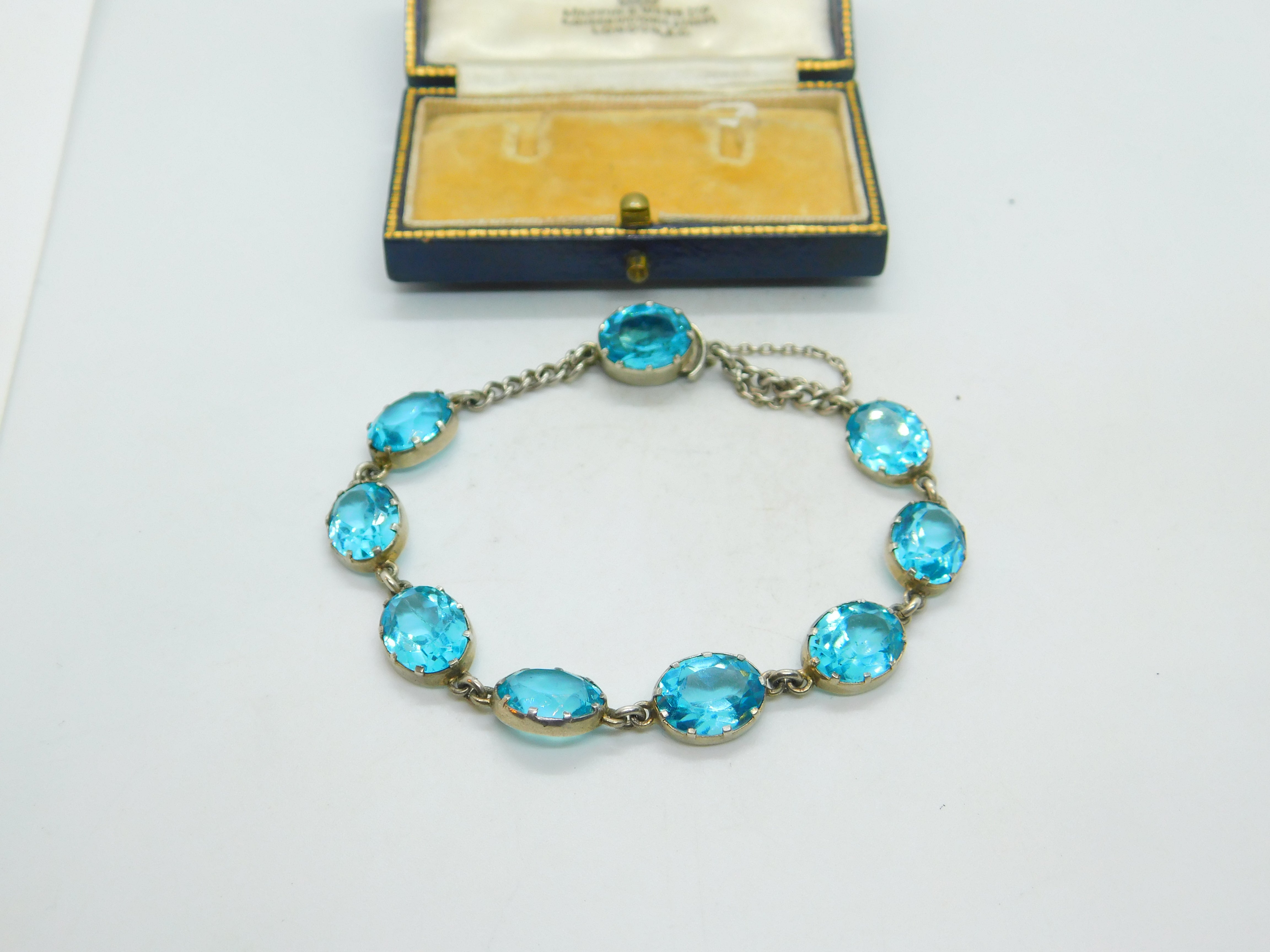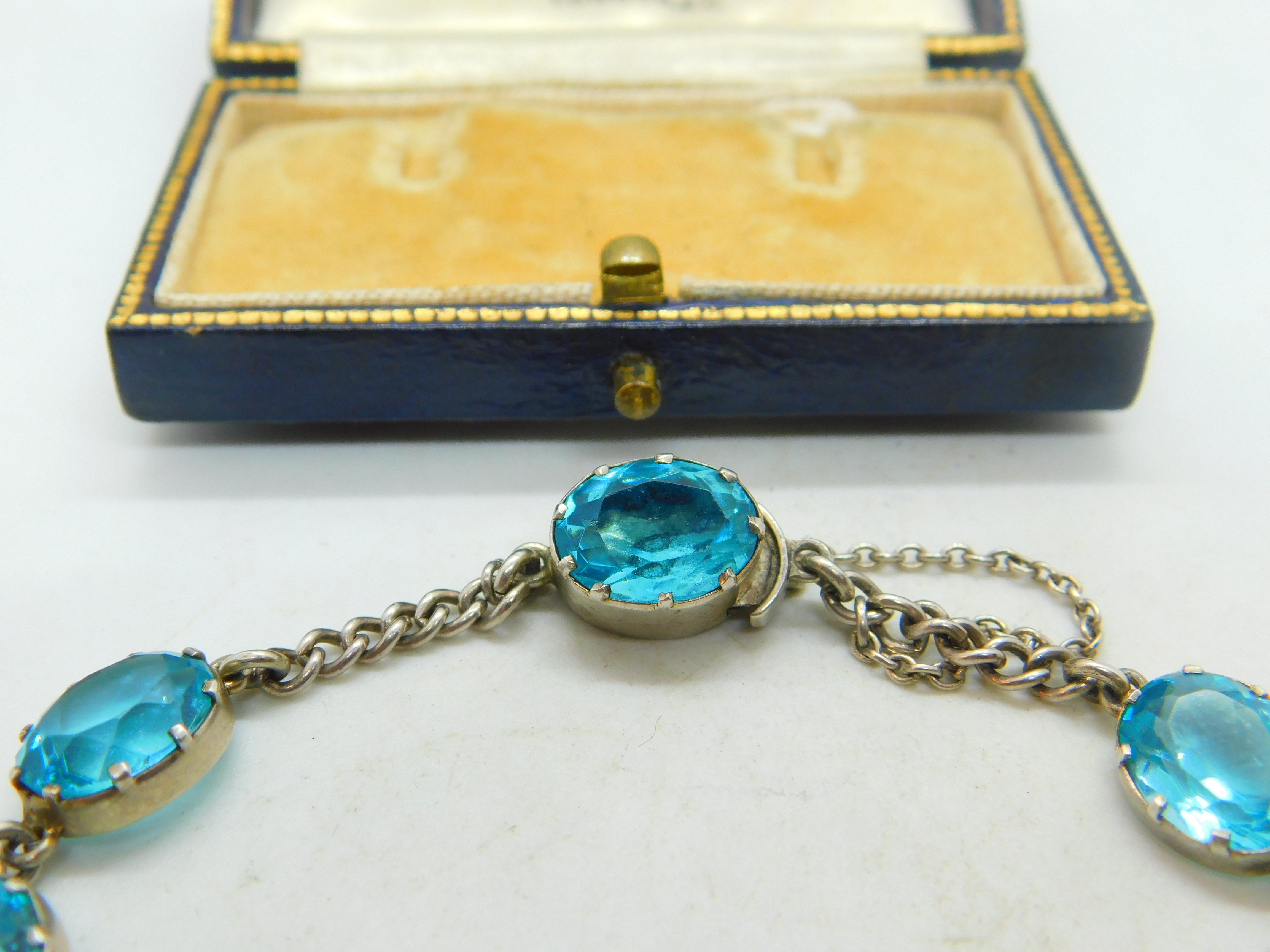 Details: A fantastic and wonderfully designed antique art deco sterling silver & faceted blue zircon bracelet with lovely design c1920.Blue zircon, a dazzling gemstone, captivates with its vibrant blue hues ranging from teal to sky blue. Mined in Cambodia, Sri Lanka, and Myanmar, it's a popular choice for jewelry. Revered for its brilliance and exceptional clarity, blue zircon symbolizes spiritual growth and promotes positive energy, making it a cherished gem. This is a wonderful item that would make a perfect gift or addition to any collection. The BOX pictured is for PRESENTATION ONLY and is NOT included in the listings but used to frame the pictures unless specifically stated otherwise.