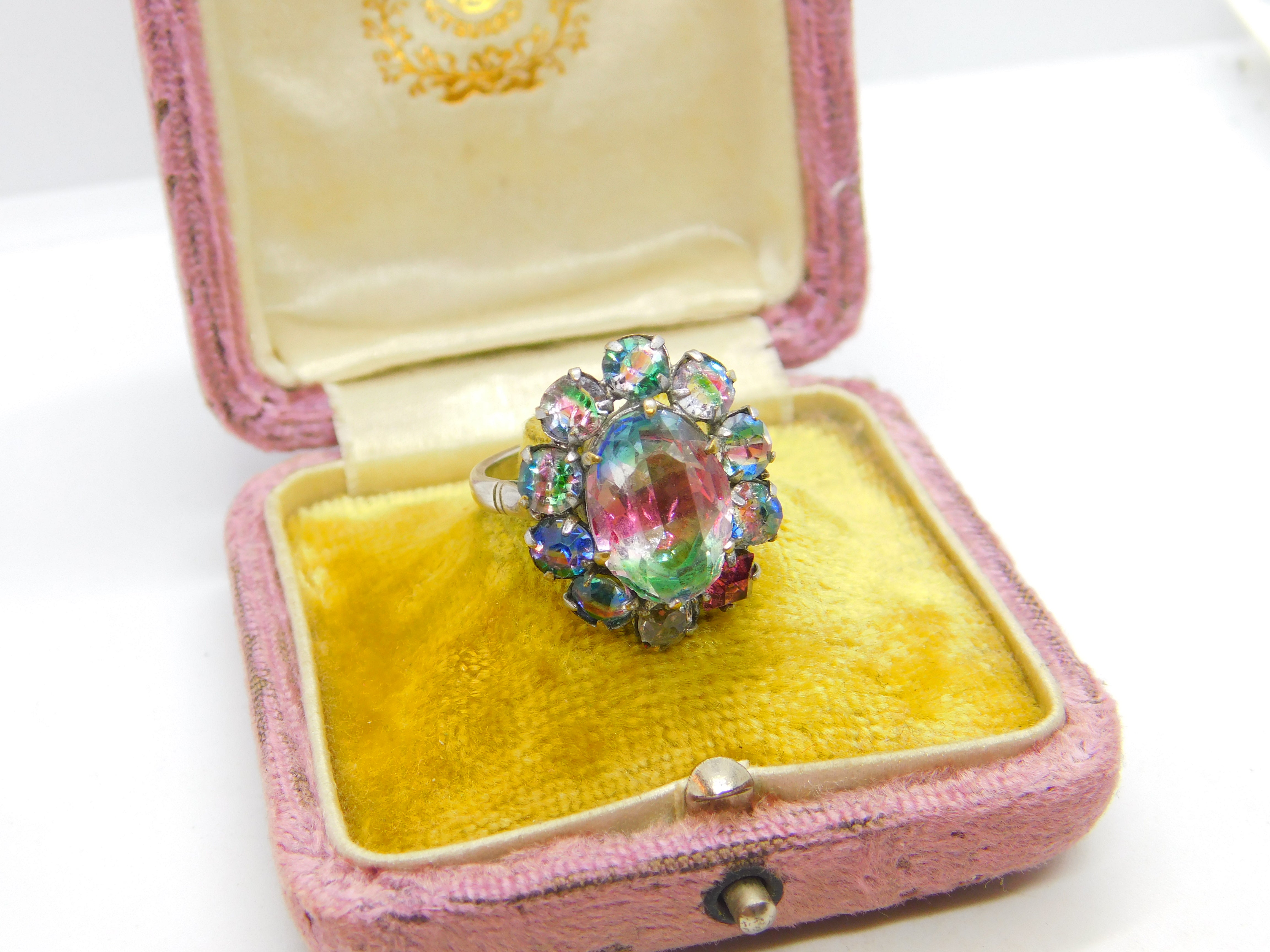 Details: A fantastic and wonderfully designed antique art deco sterling silver floral cluster ring set with iris glass c1930 marked silver to the interior. This is a wonderful item that would make a perfect gift or addition to any collection. The BOX pictured is for PRESENTATION ONLY and is NOT included in the listings but used to frame the pictures unless specifically stated otherwise.