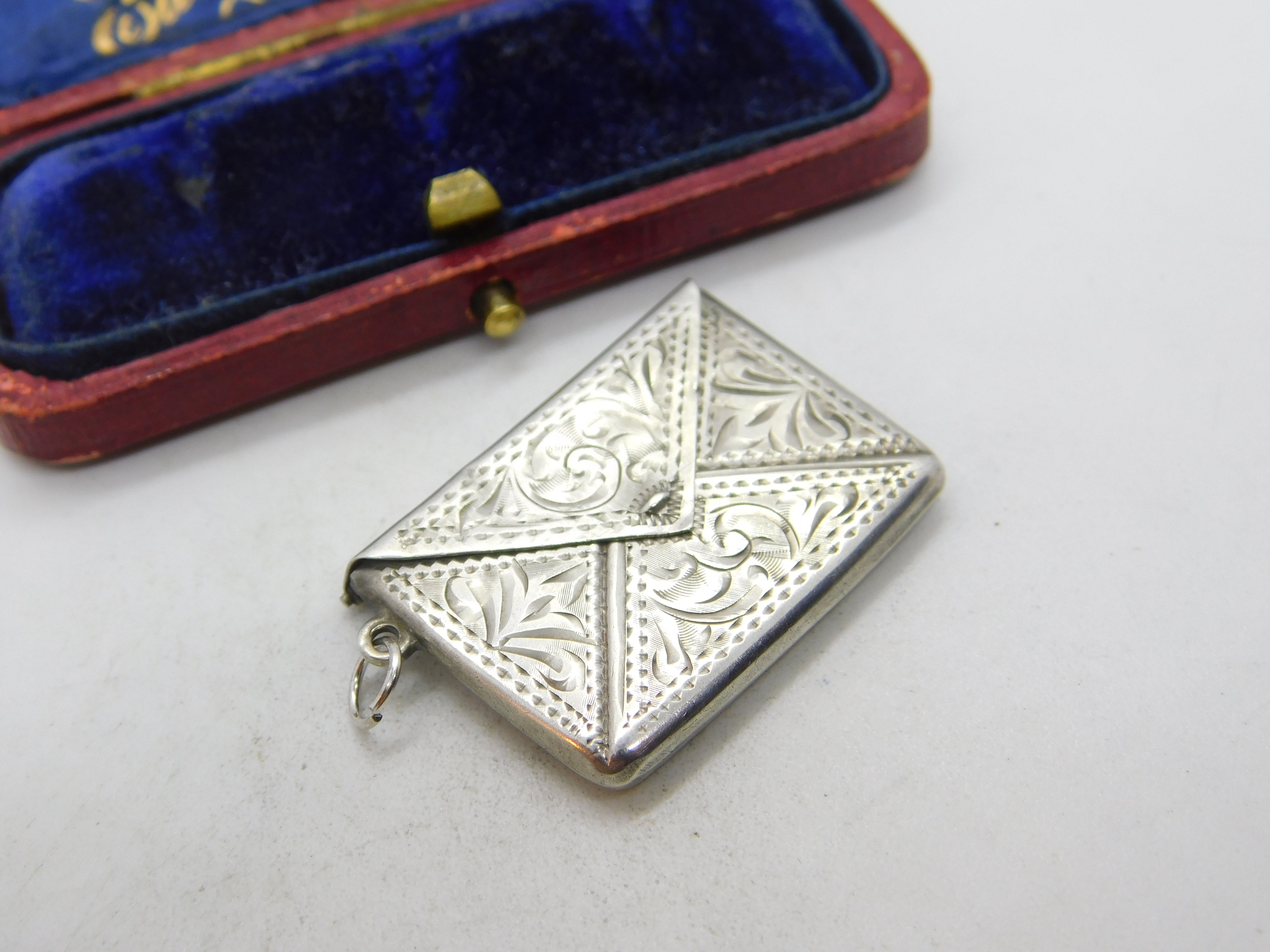 Details: A fantastic and wonderfully designed antique art deco sterling silver floral pattern envelope form stamp case fob pendant hallmarked to the interior c1940. This is a wonderful item that would make a perfect gift or addition to any collection. The BOX pictured is for PRESENTATION ONLY and is NOT included in the listings but used to frame the pictures unless specifically stated otherwise.
